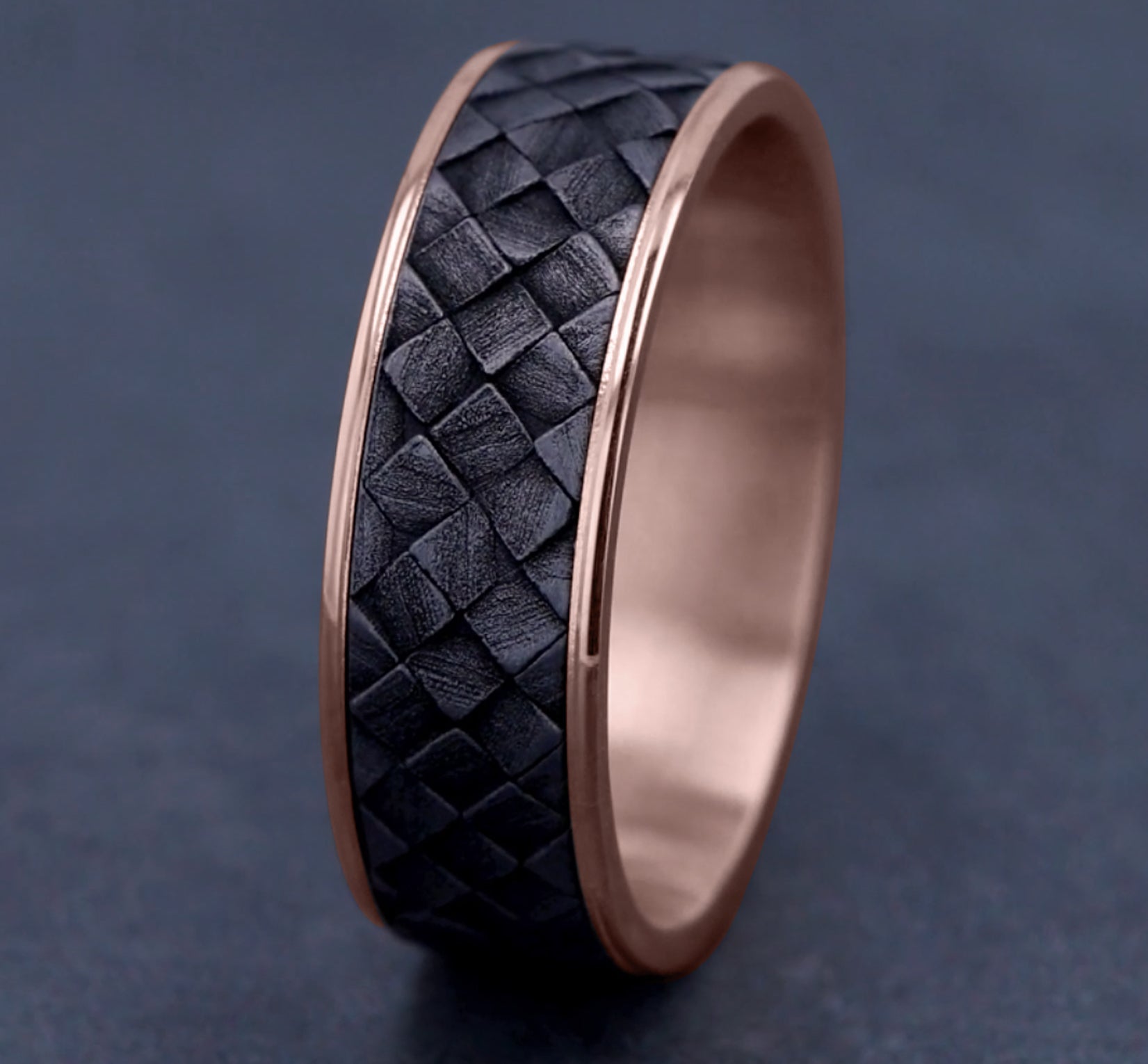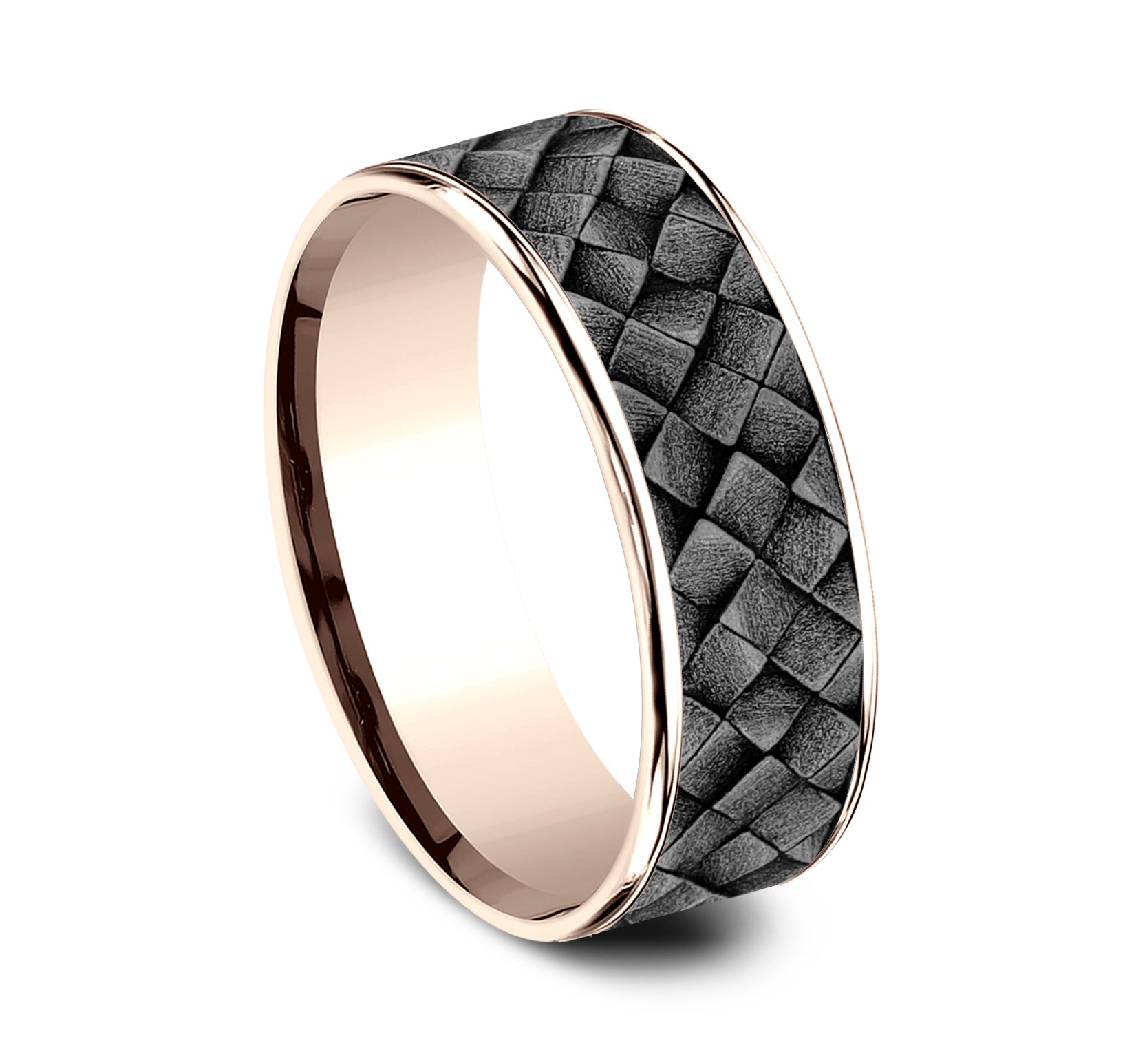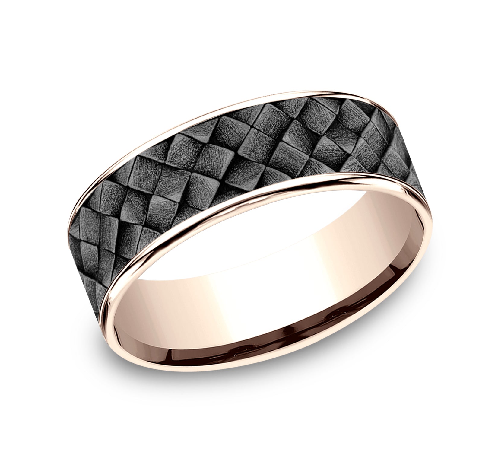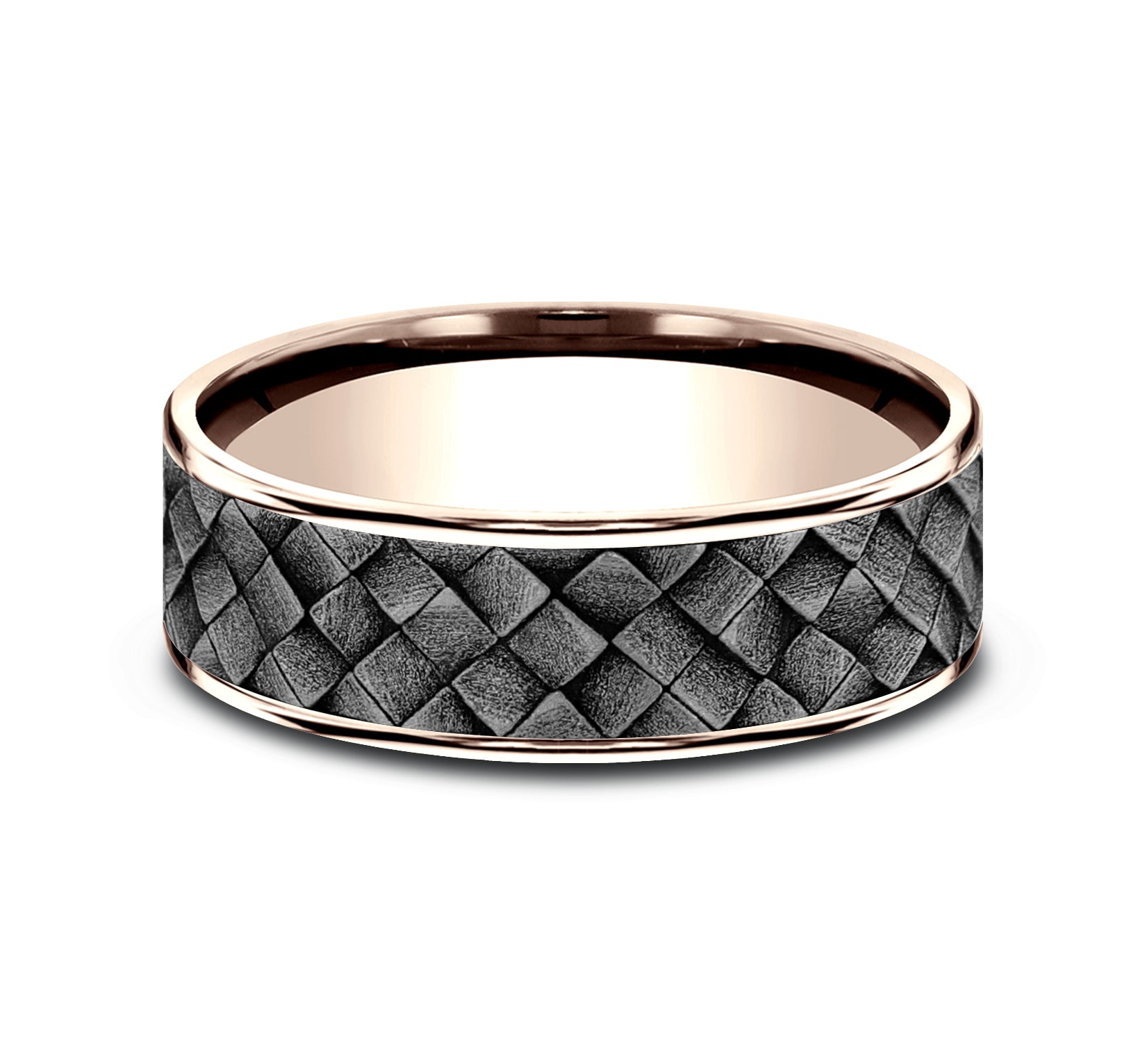 | Additional Description | 7.5mm, Comfort fit 14K Rose Gold and Grey Tantalum Cross hatch square pattern, thin edges |