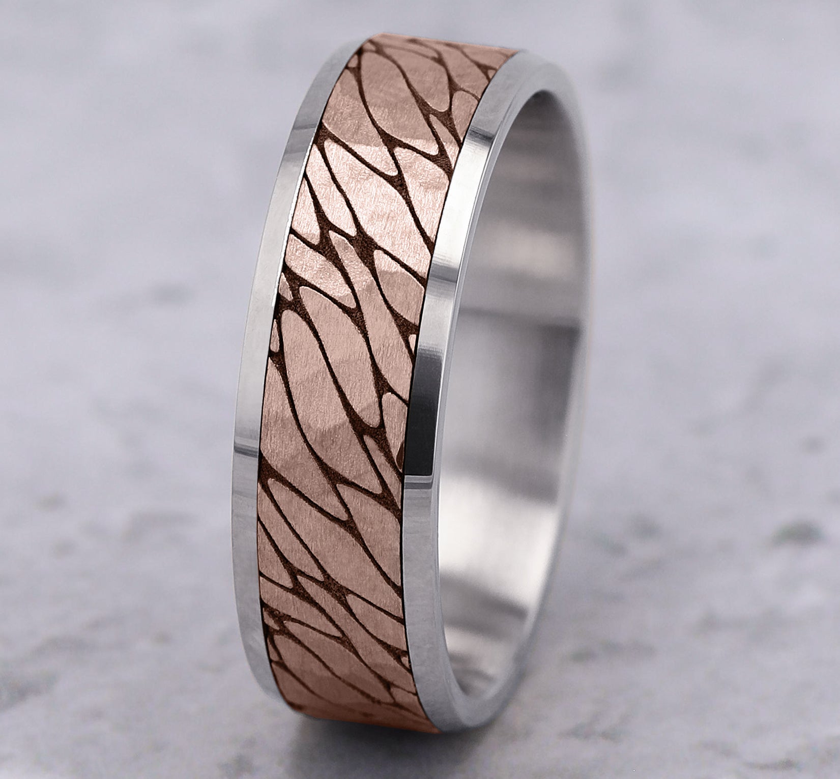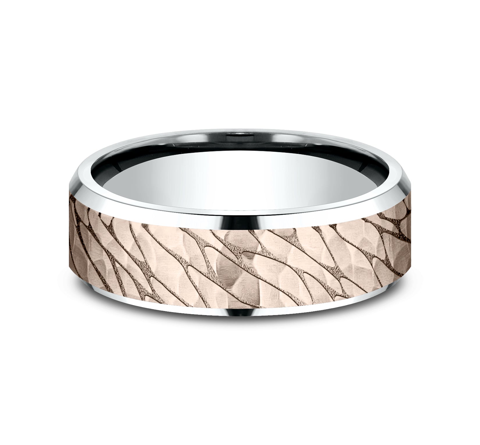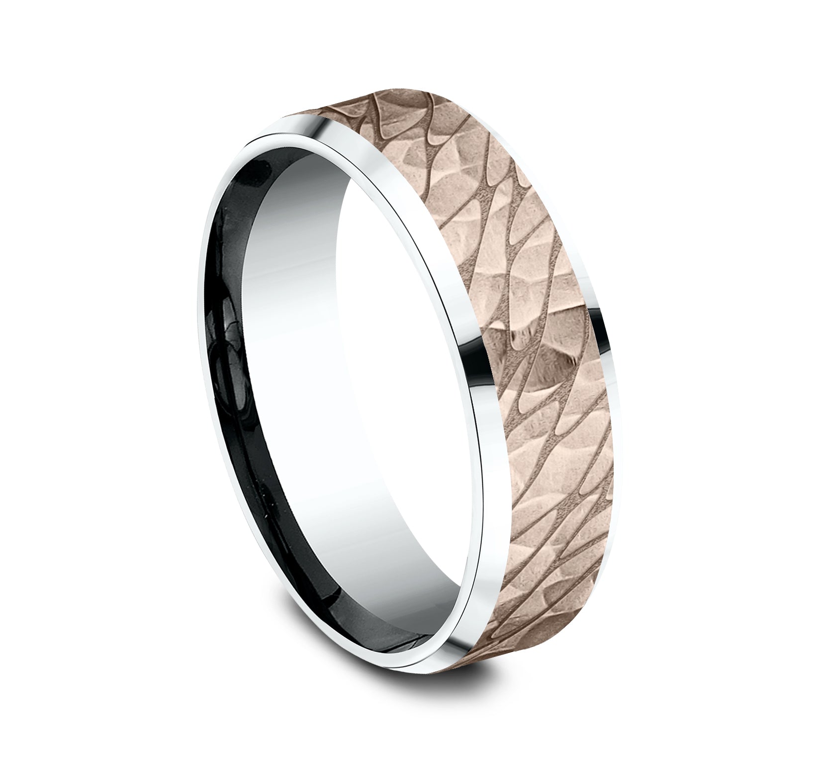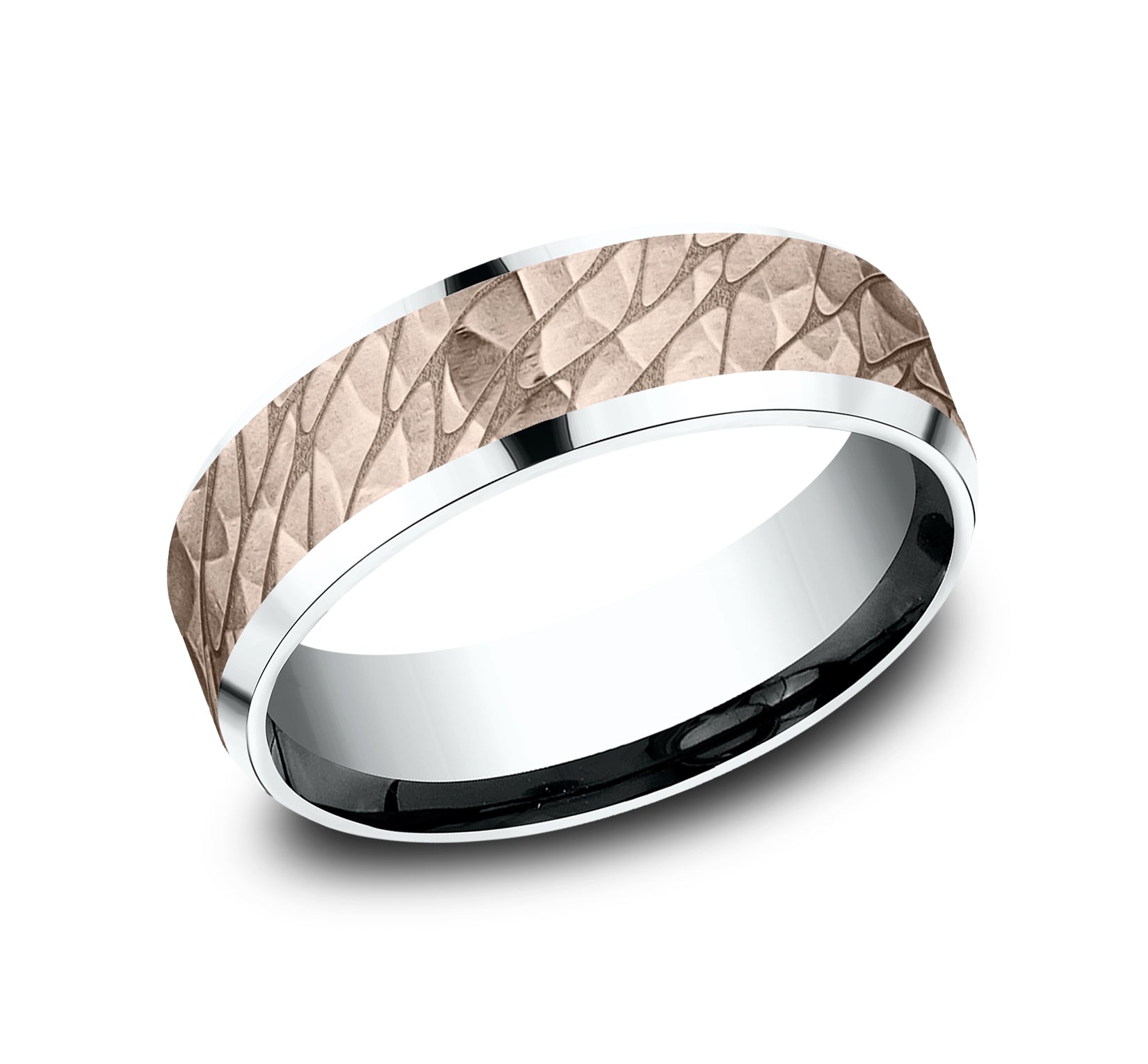 | Additional Description | 7mm, Lightweight comfort fit 14K White and Rose Gold Pebble pattern with hammered finish, polished bevel edges |