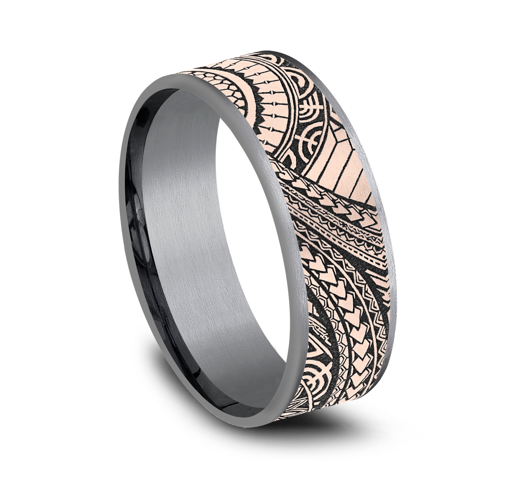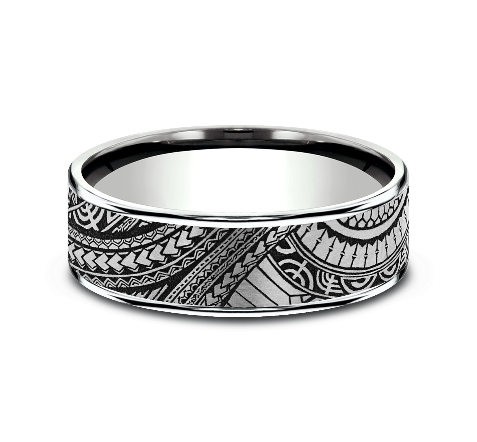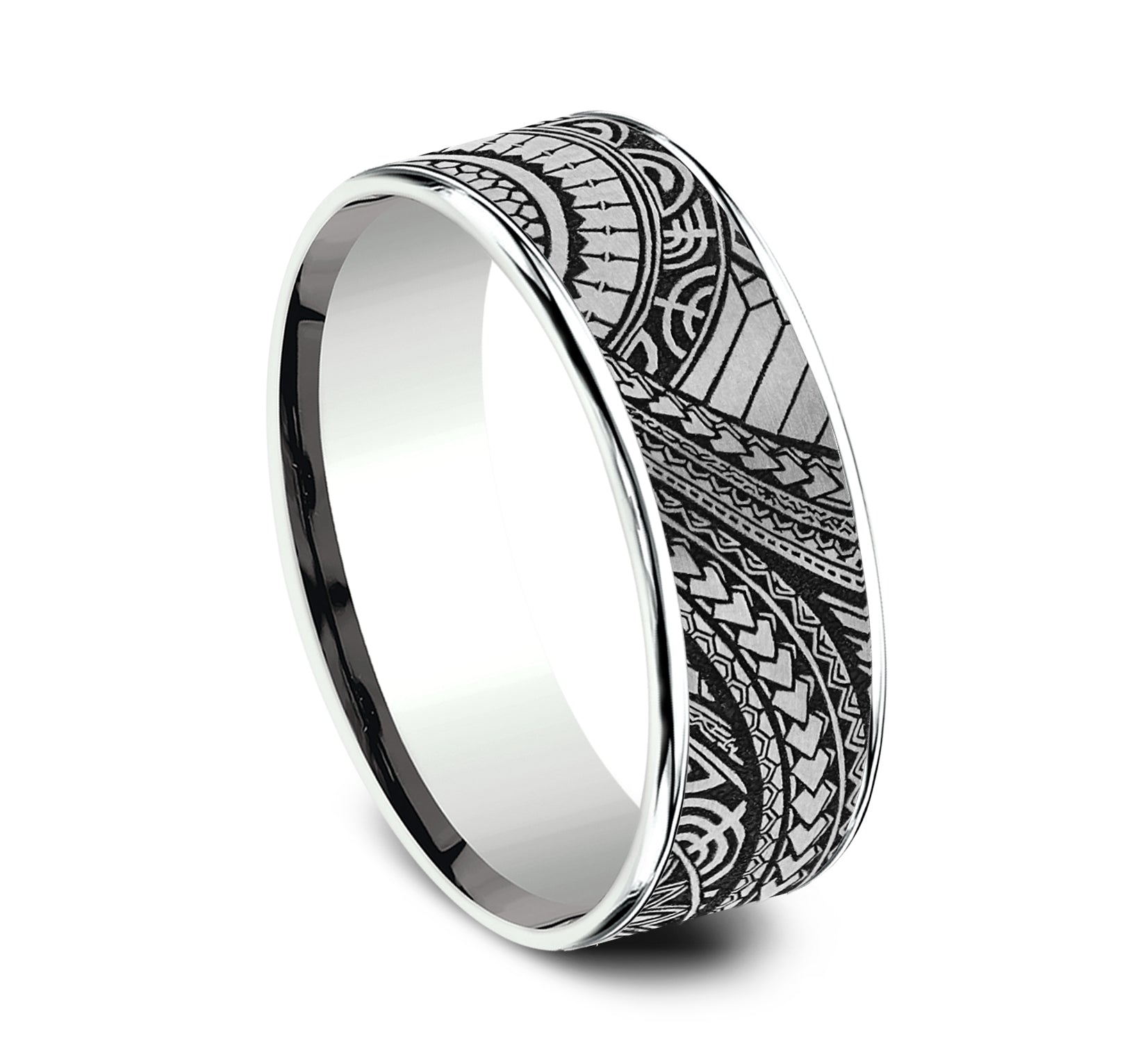 | Additional Description | 7.5mm, Comfort fit 14K White Gold and Grey-Black Titanium Polynesian inspired design, thin edges |