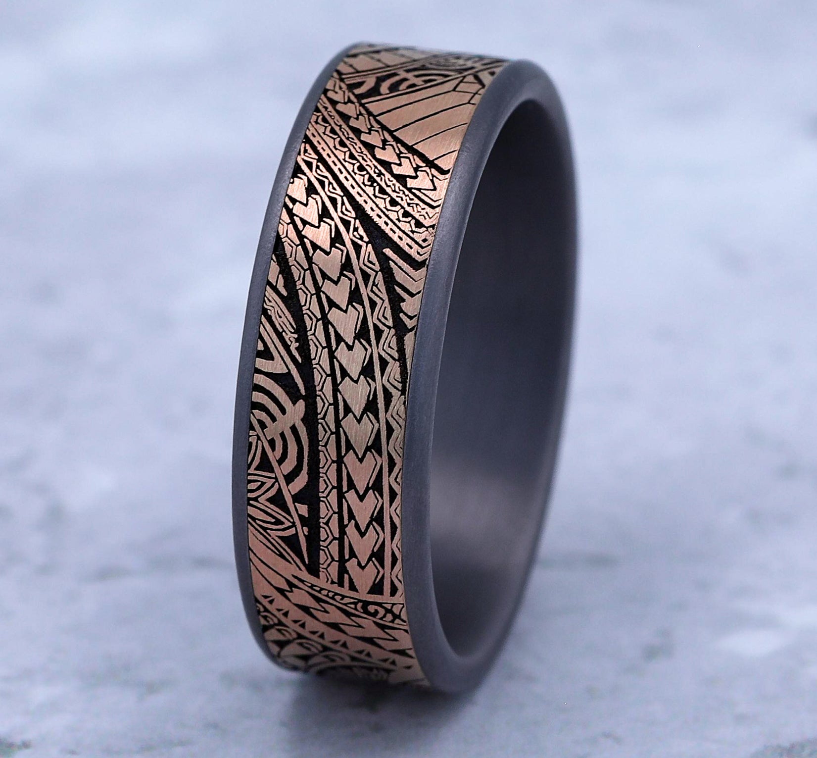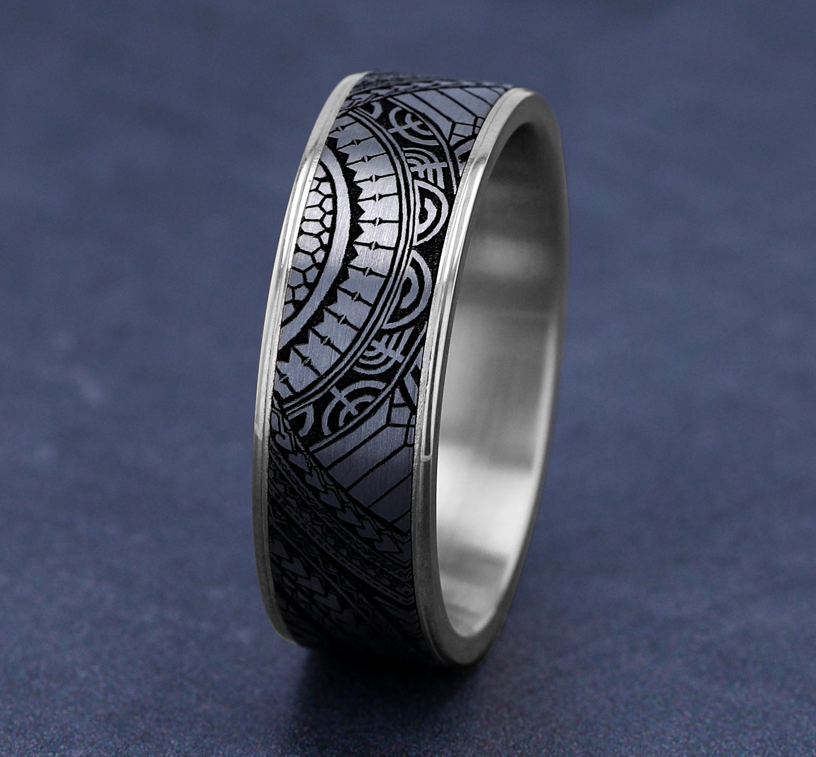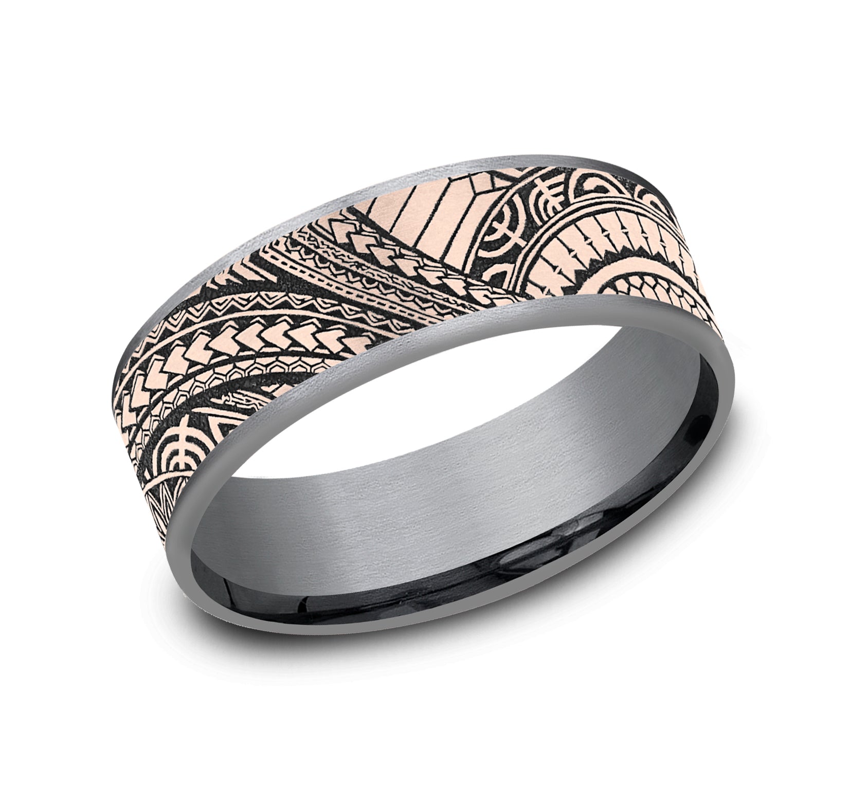 | Additional Description | 7.5mm, Comfort fit 14K White Gold and Grey-Black Titanium Polynesian inspired design, thin edges |