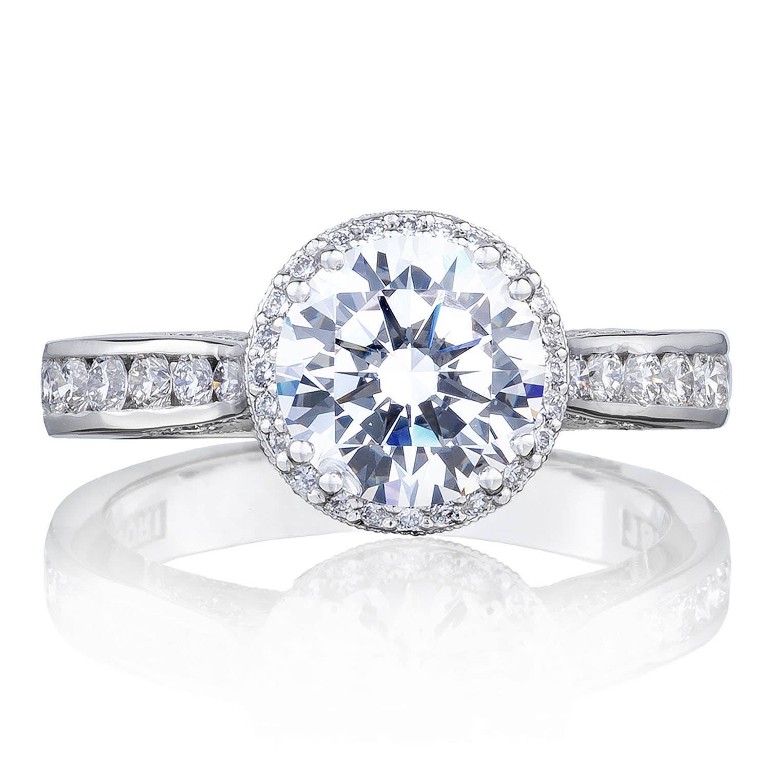| Additional Description | Channel-set round-brillant diamonds decorate the ceiling of the band. A cushion bloom enhances the solitaire, which rests on a lace-like Cathedral foundation of intricate milgrain detailing. |