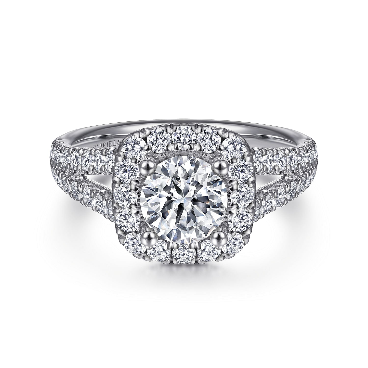 Topped by a lavish cushion shaped halo, this 0.78ct diamond engagement ring is an unparalleled showcase for your chosen 1ct round center stone. The platinum shank features two strands of delicate pav???????? diamonds that split as they ascend toward the halo. This effortlessly chic ring is as timeless as it gets.