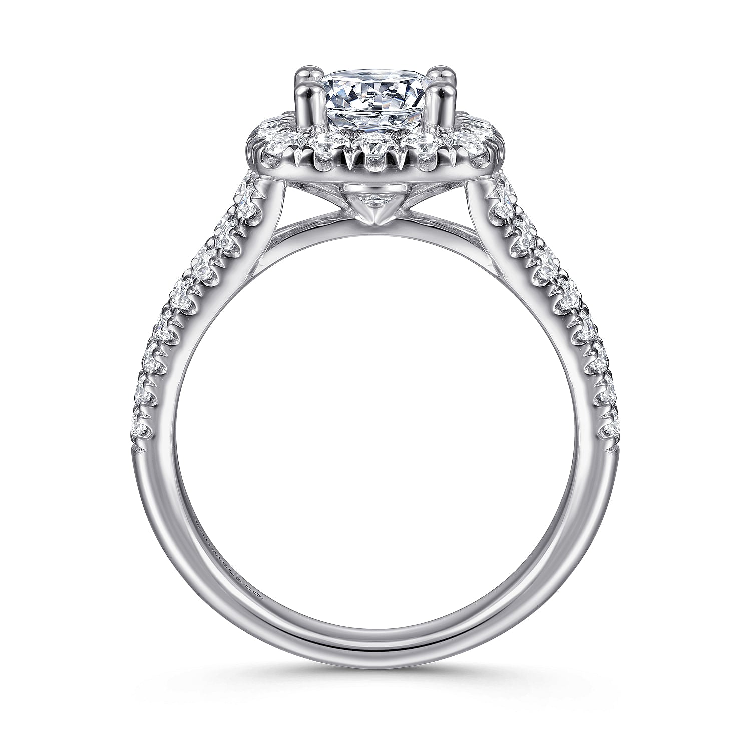 Topped by a lavish cushion shaped halo, this 0.78ct diamond engagement ring is an unparalleled showcase for your chosen 1ct round center stone. The 14K white gold shank features two strands of delicate pav???????? diamonds that split as they ascend toward the halo. This effortlessly chic ring is as timeless as it gets.