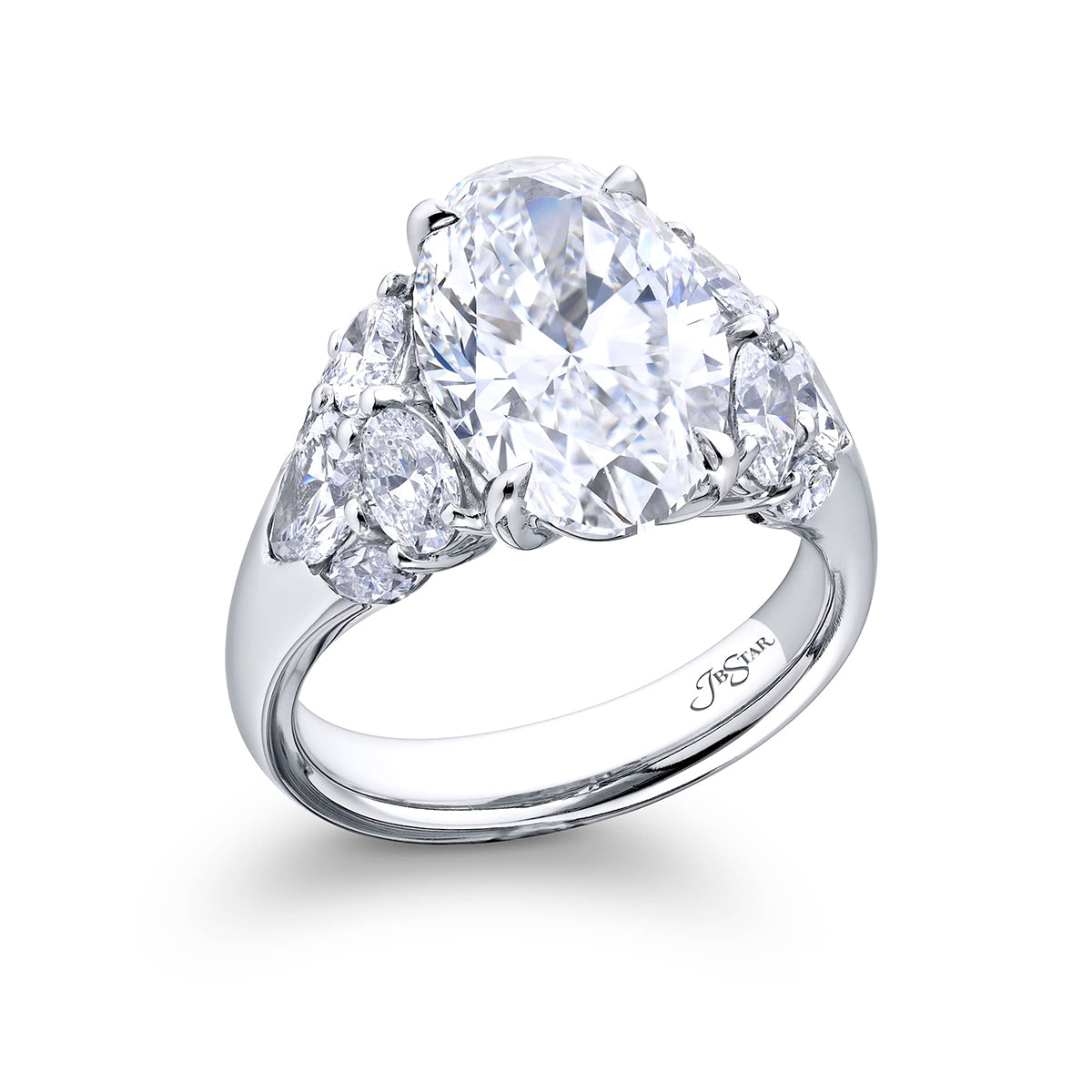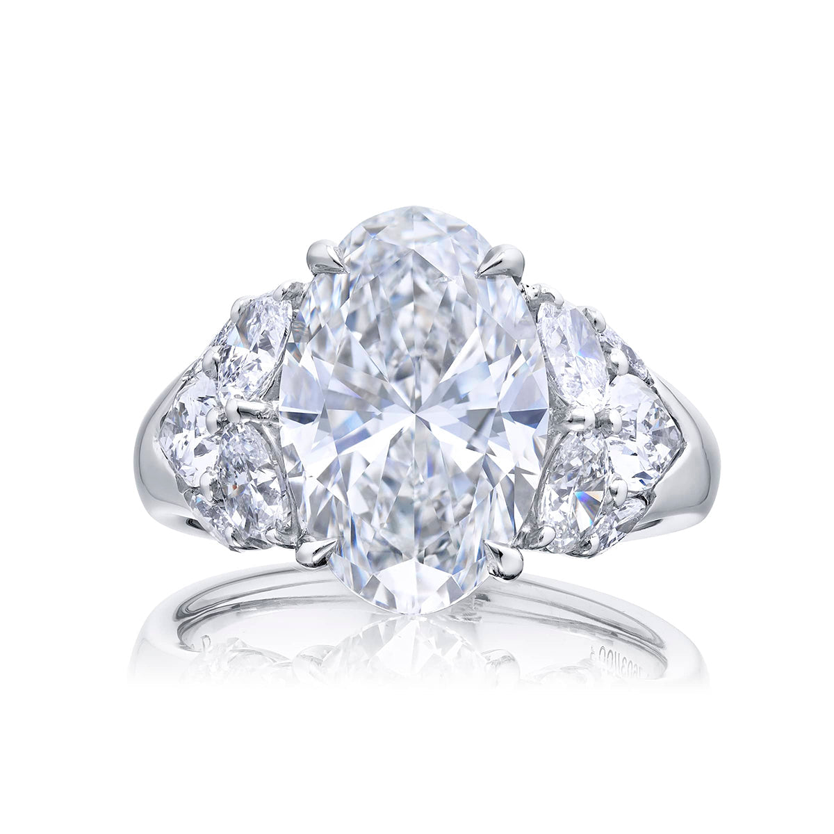 Dazzling diamond ring featuring a 5.01 ct. GIA certified oval-cut diamond center embraced by a cluster oval pear-shape of marquise diamonds. Handcrafted in pure platinum.