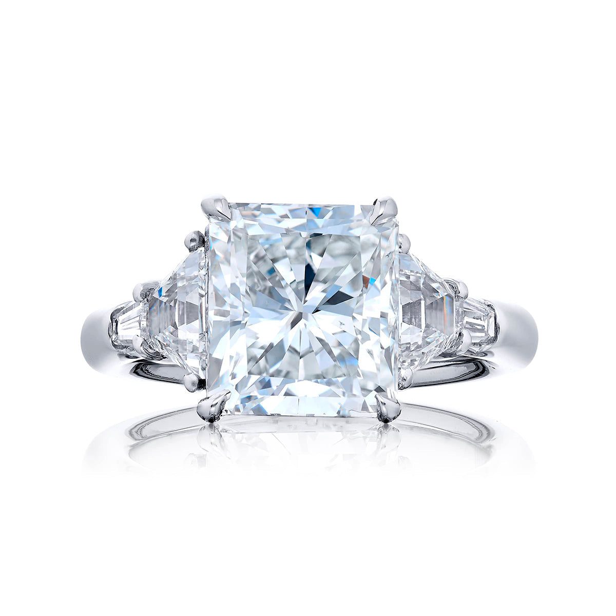Dazzling Brilliance: Our timeless 5.02 ct. GIA certified Diamond Ring. This beautiful radiant-cut diamond flanked by tapered baguette and trapezoid diamonds is handcrafted in pure platinum.
