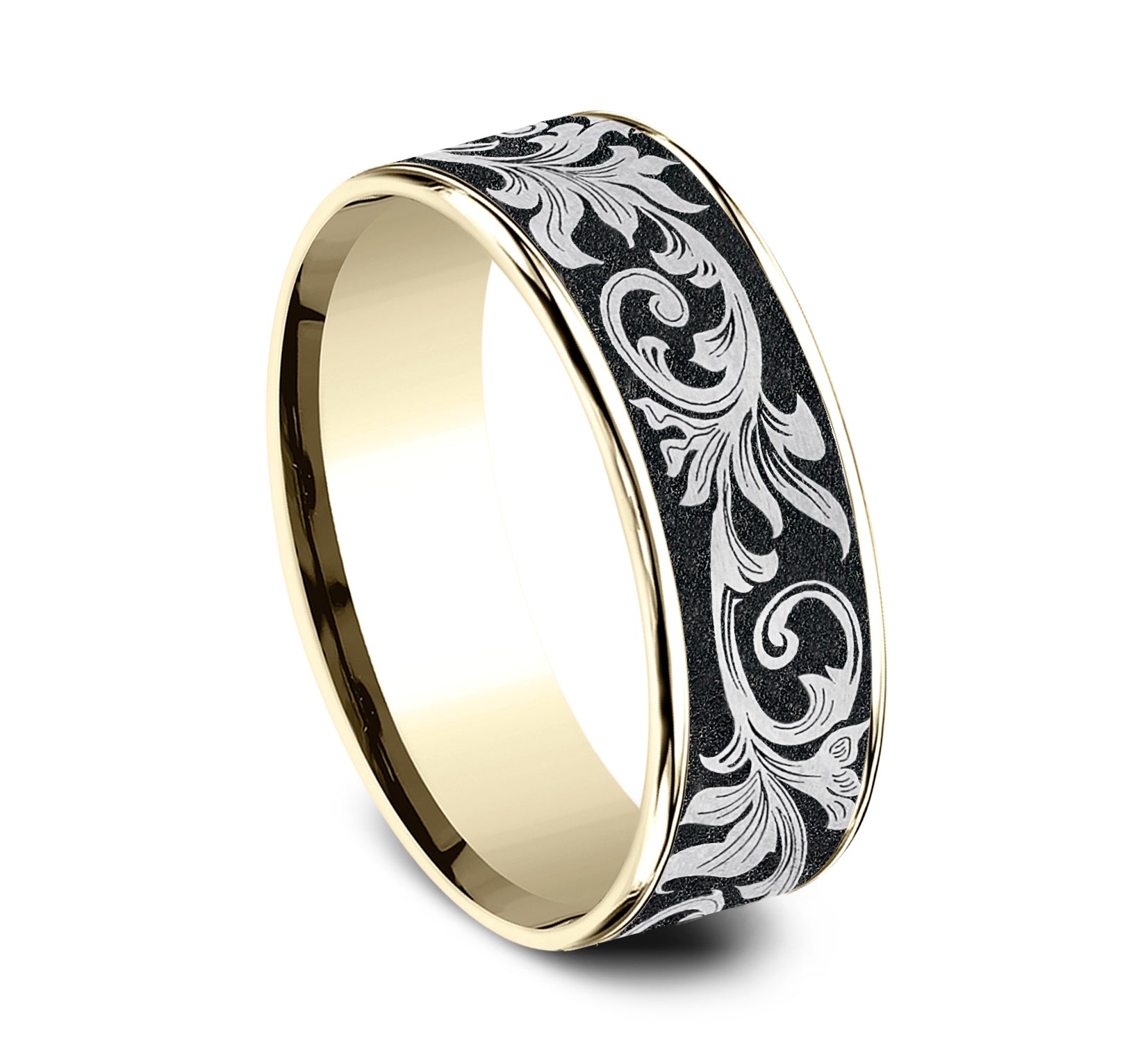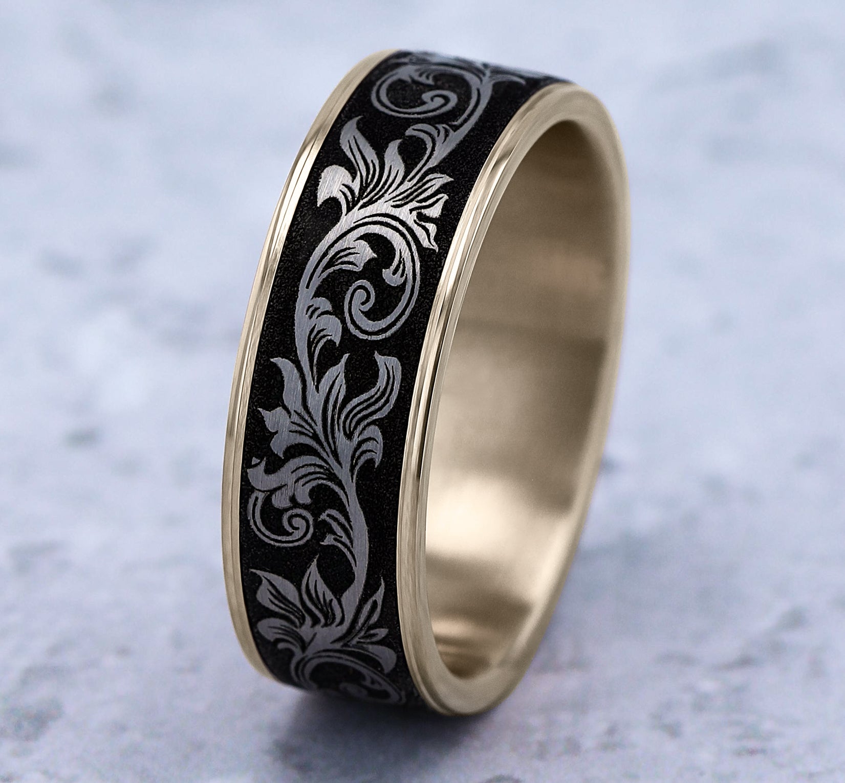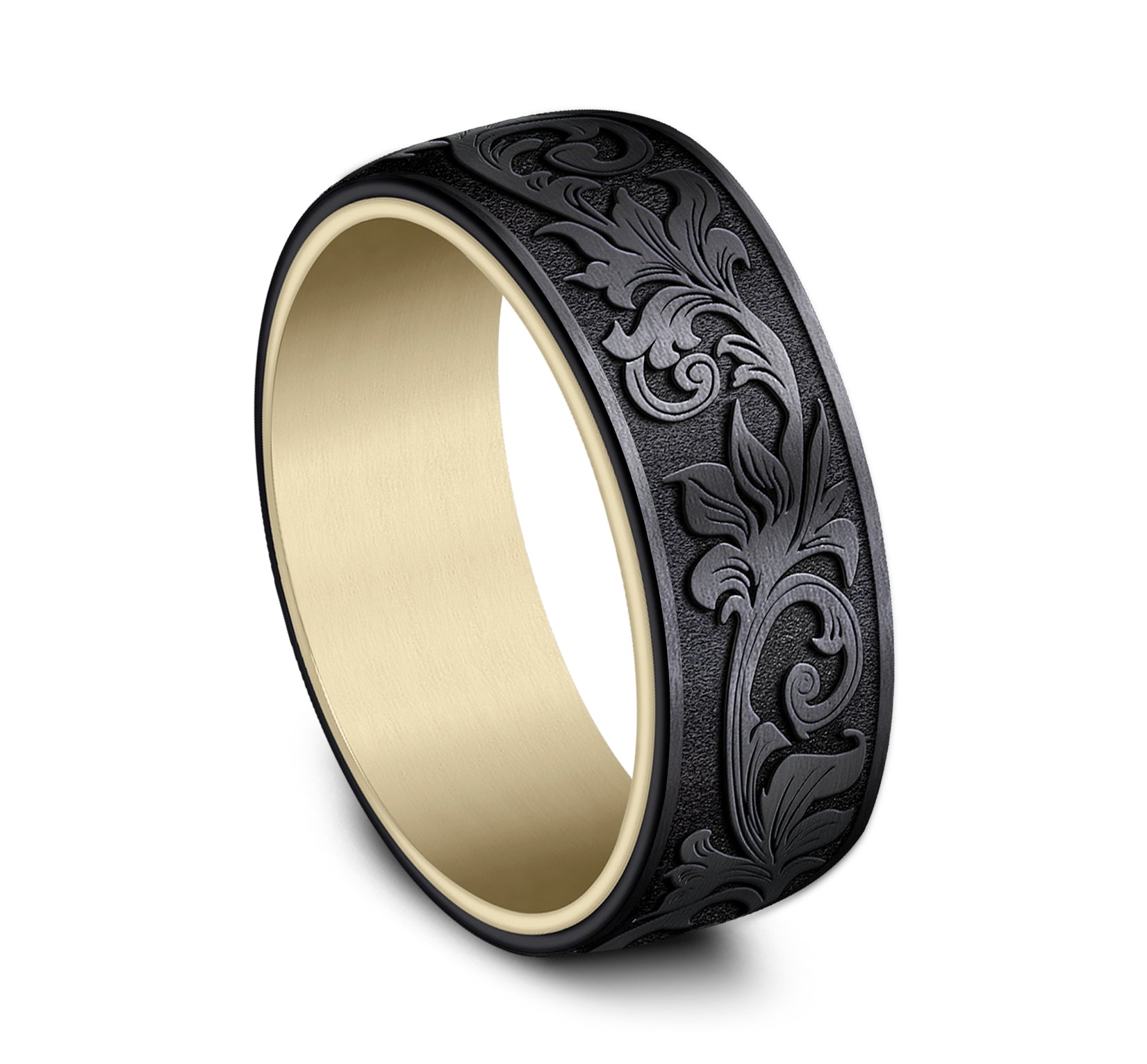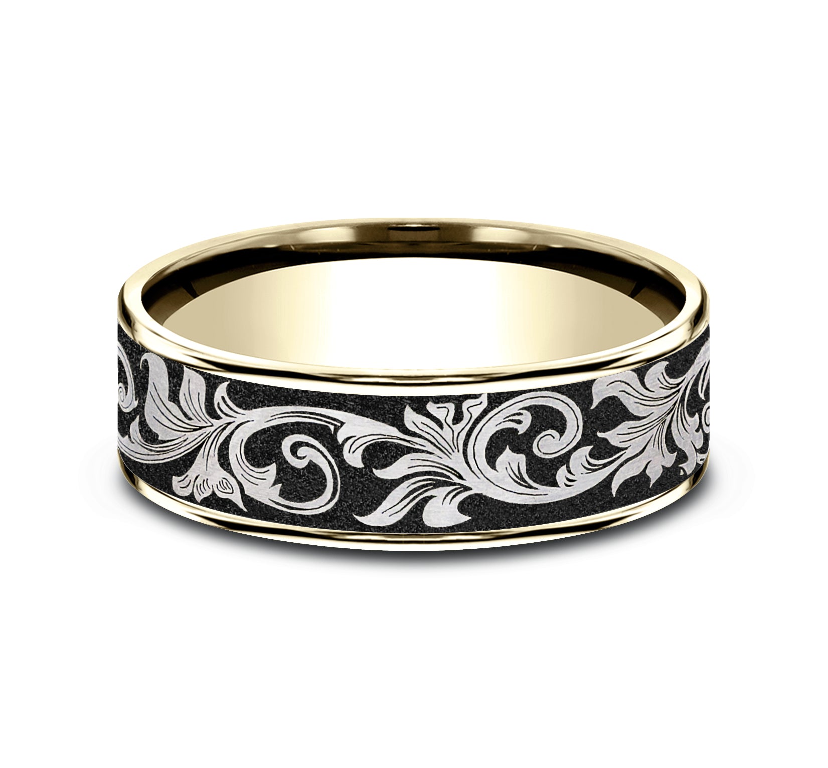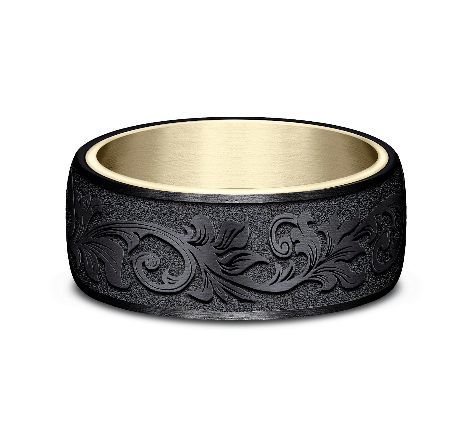 | Additional Description | 8mm, Comfort fit 14K Yellow Gold and Black Titanium Vintage script pattern |