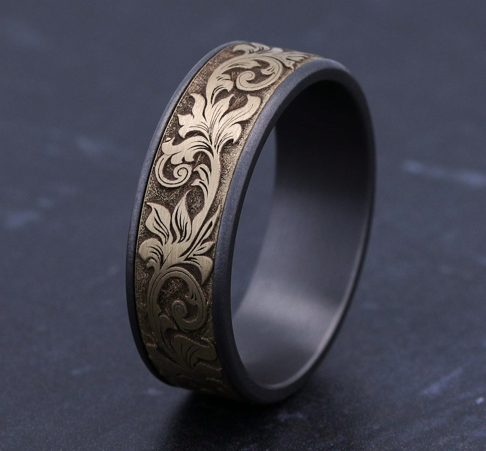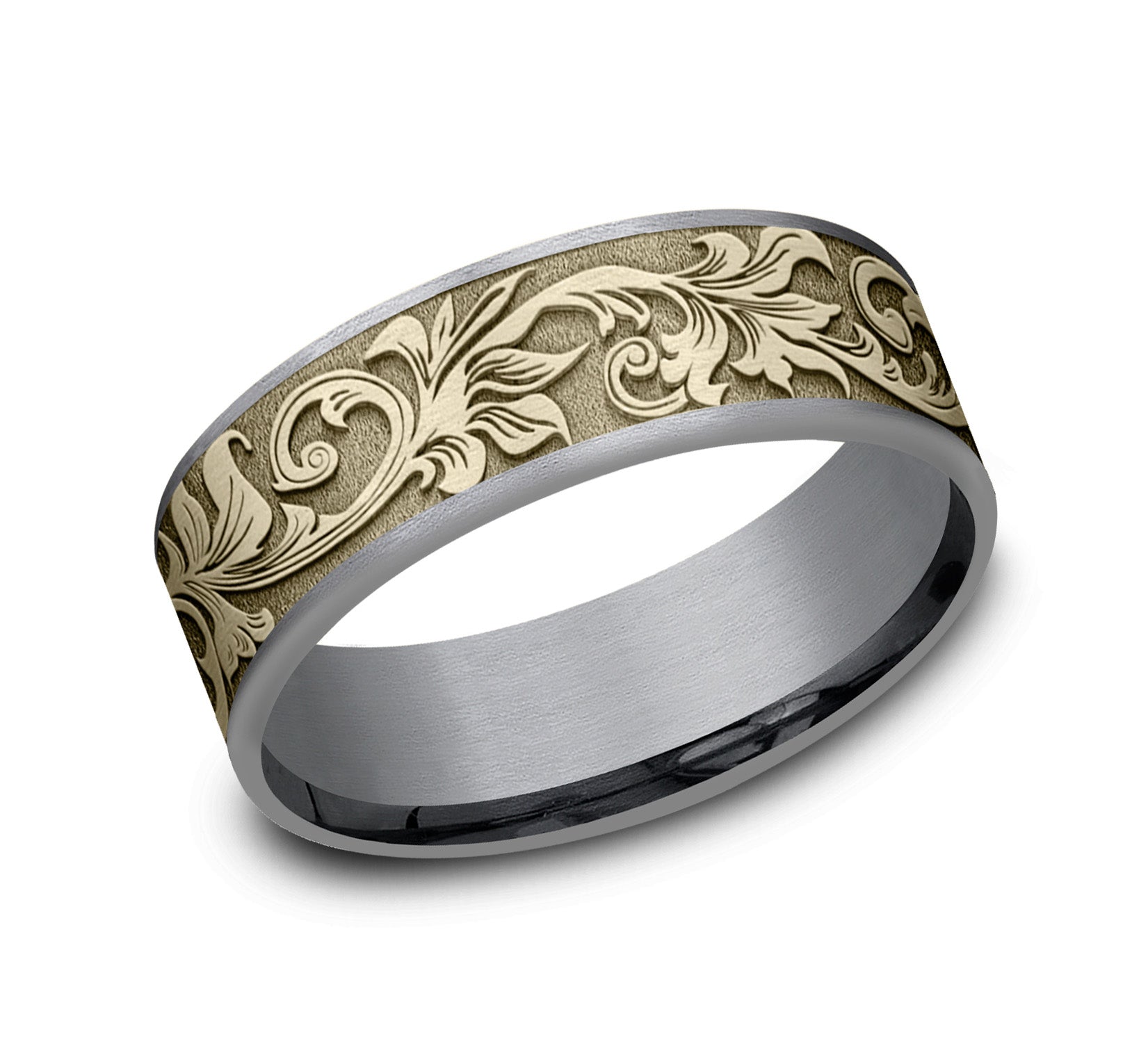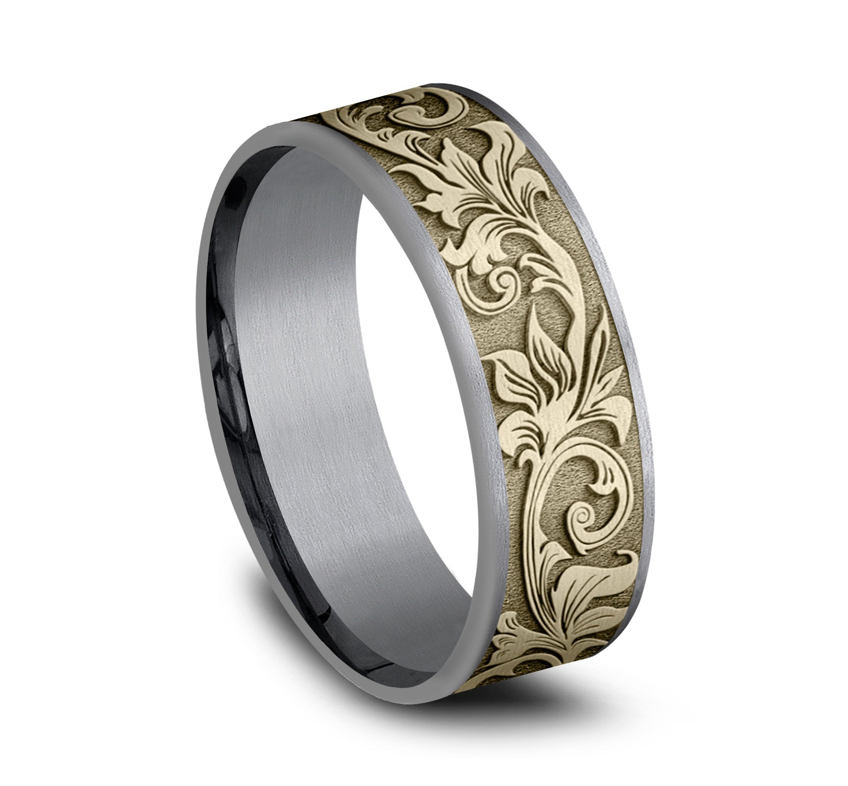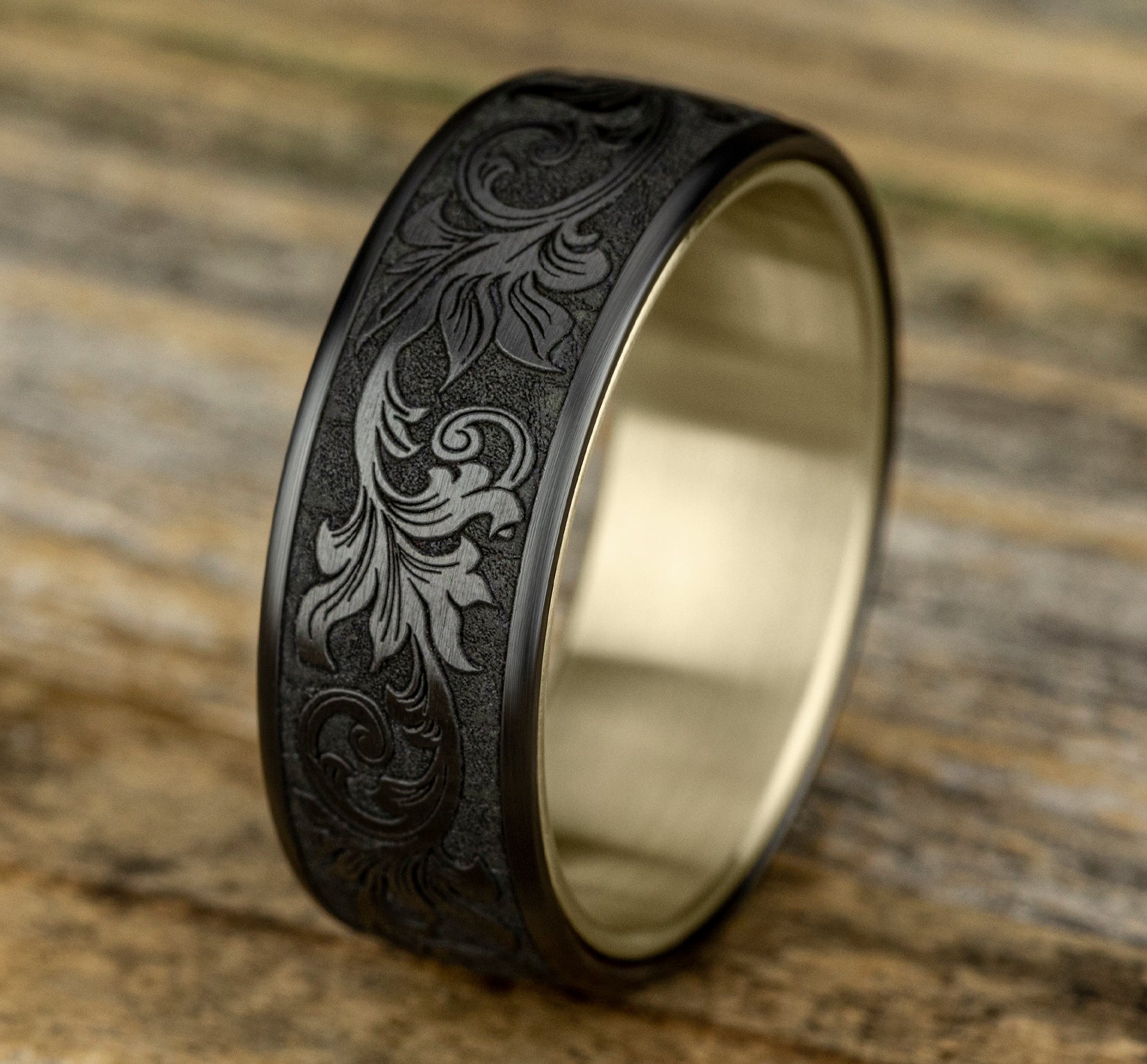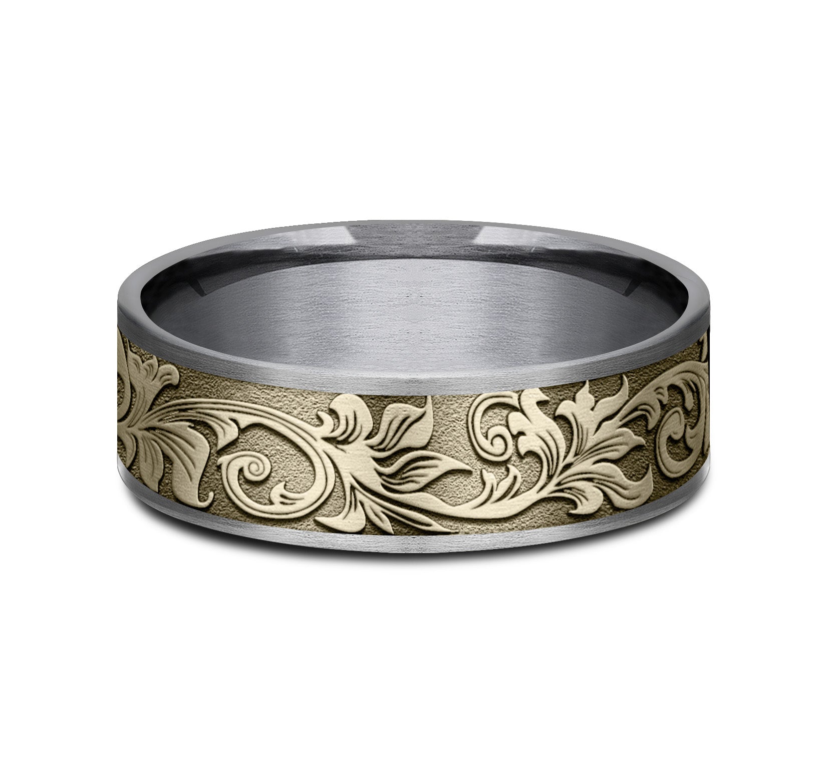| Additional Description | 8mm, Comfort fit 14K Yellow Gold and Black Titanium Vintage script pattern |