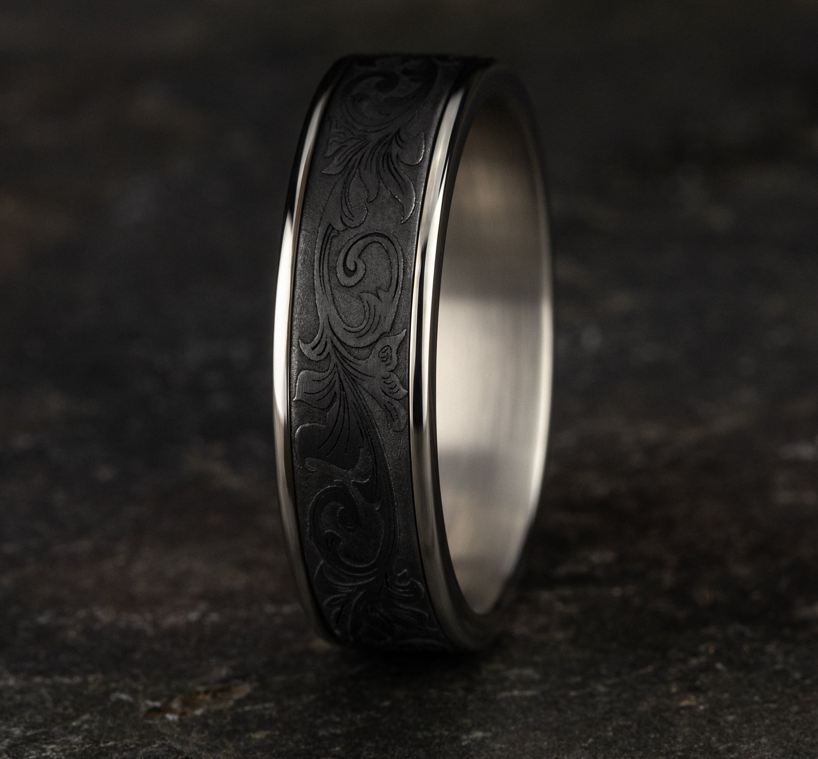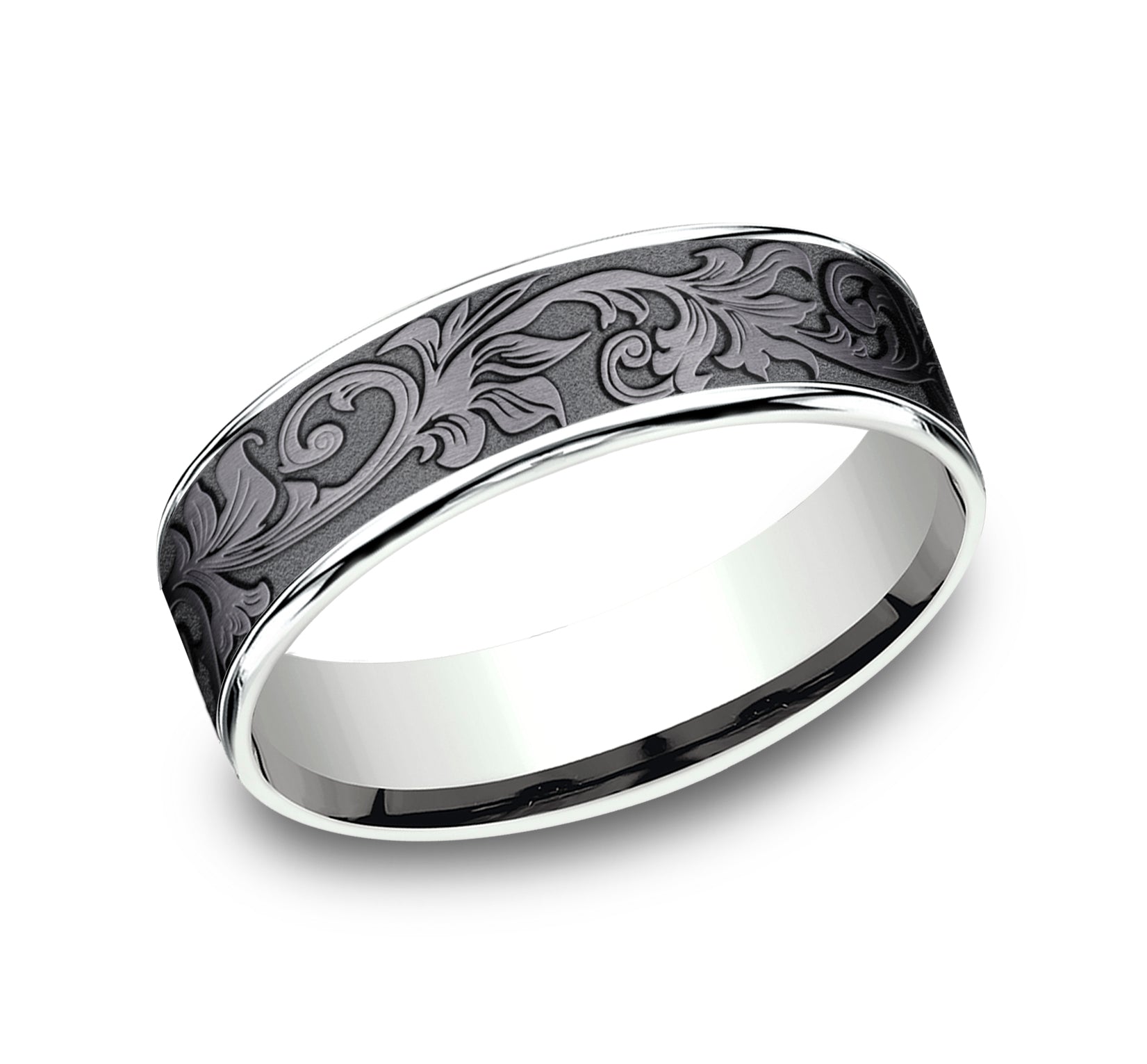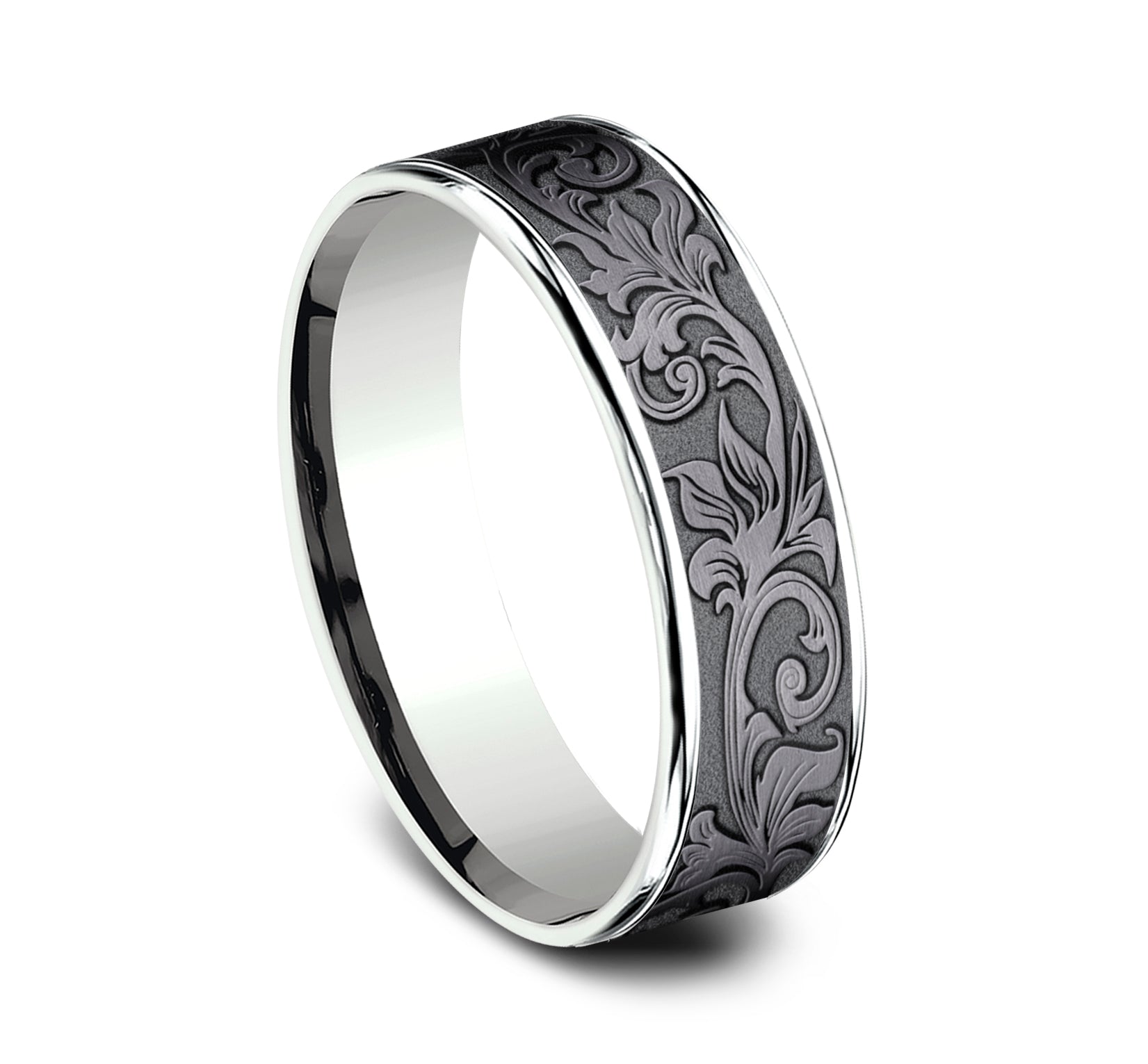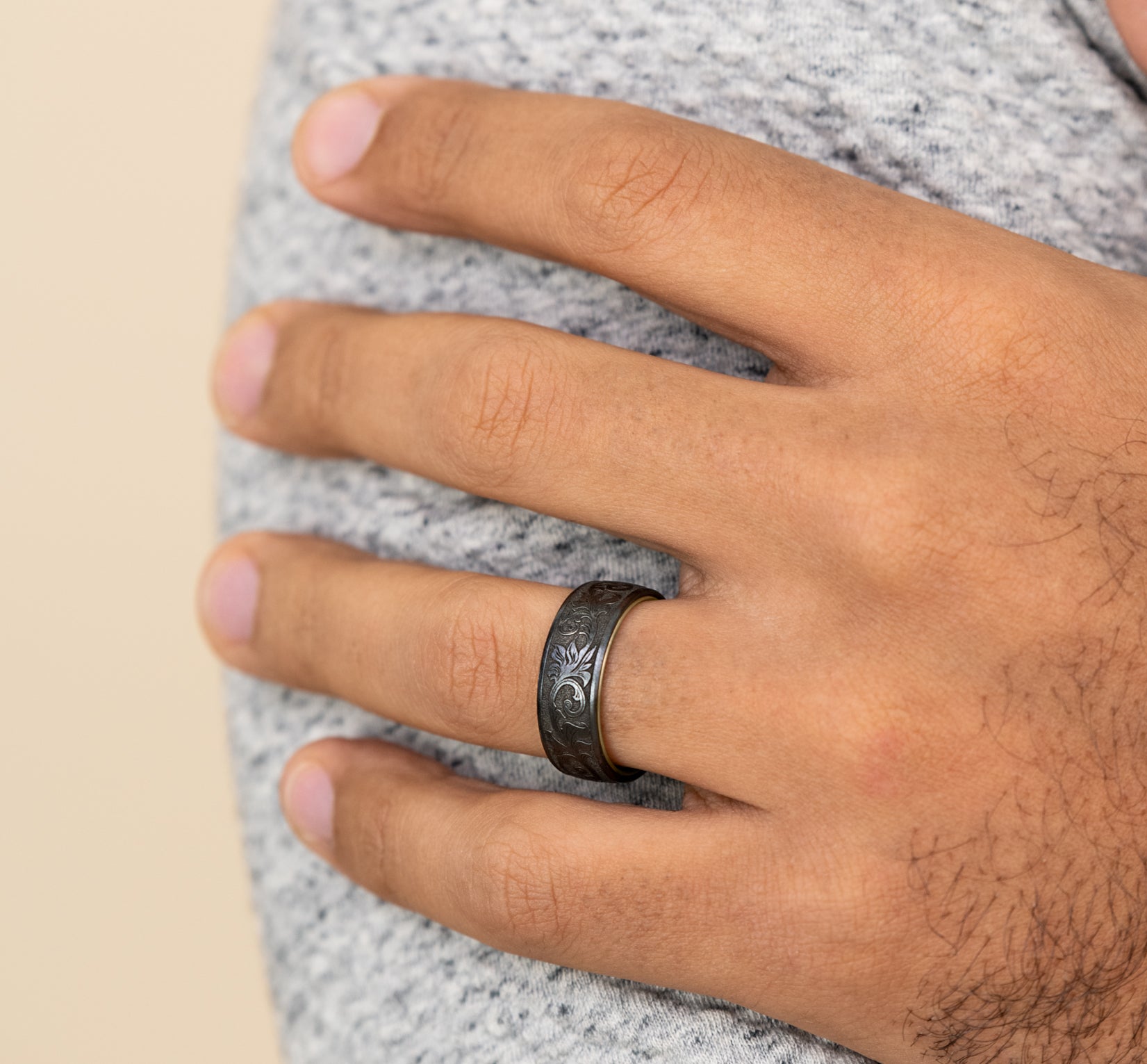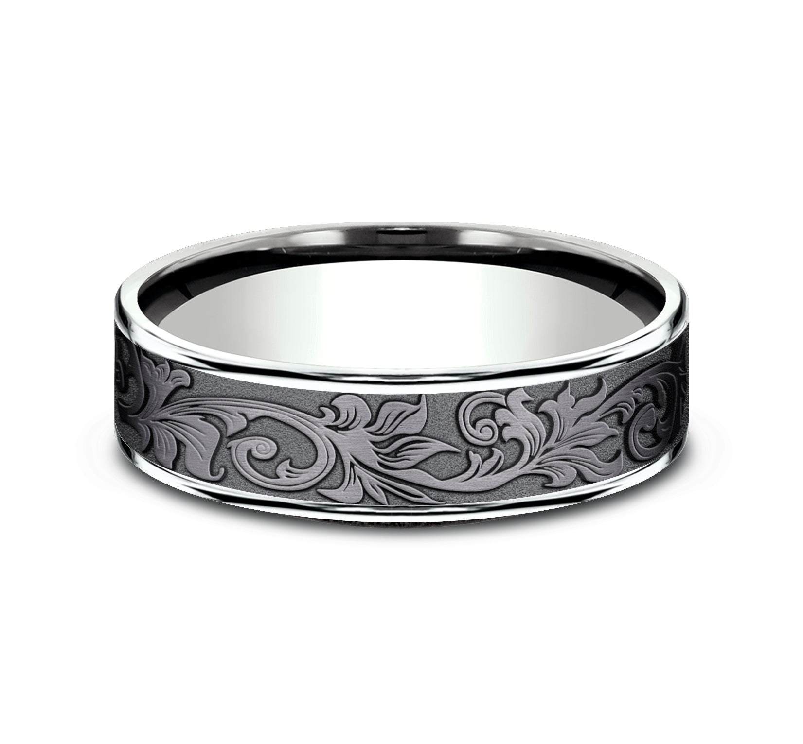 | Additional Description | 8mm, Comfort fit 14K Yellow Gold and Black Titanium Vintage script pattern |