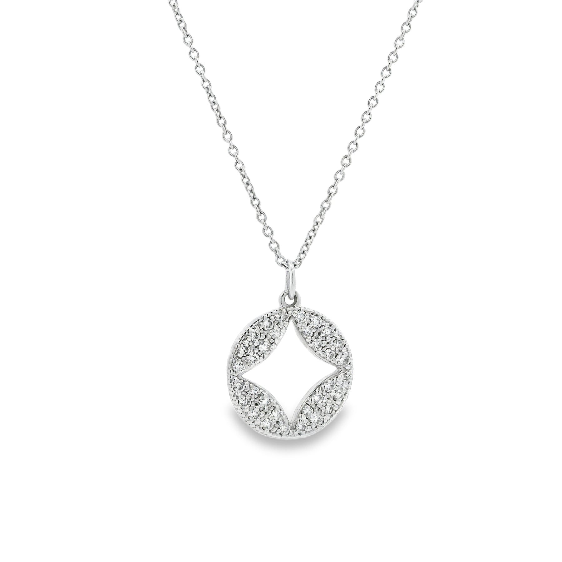 Elevate your elegance with this 14K white gold pave pendant necklace, featuring a total weight of 0.35 carats in sparkling diamonds. Its refined design offers a timeless luxury, perfect for adding subtle brilliance to any ensemble. The delicate pave setting enhances every movement, capturing light and attention with effortless sophistication.