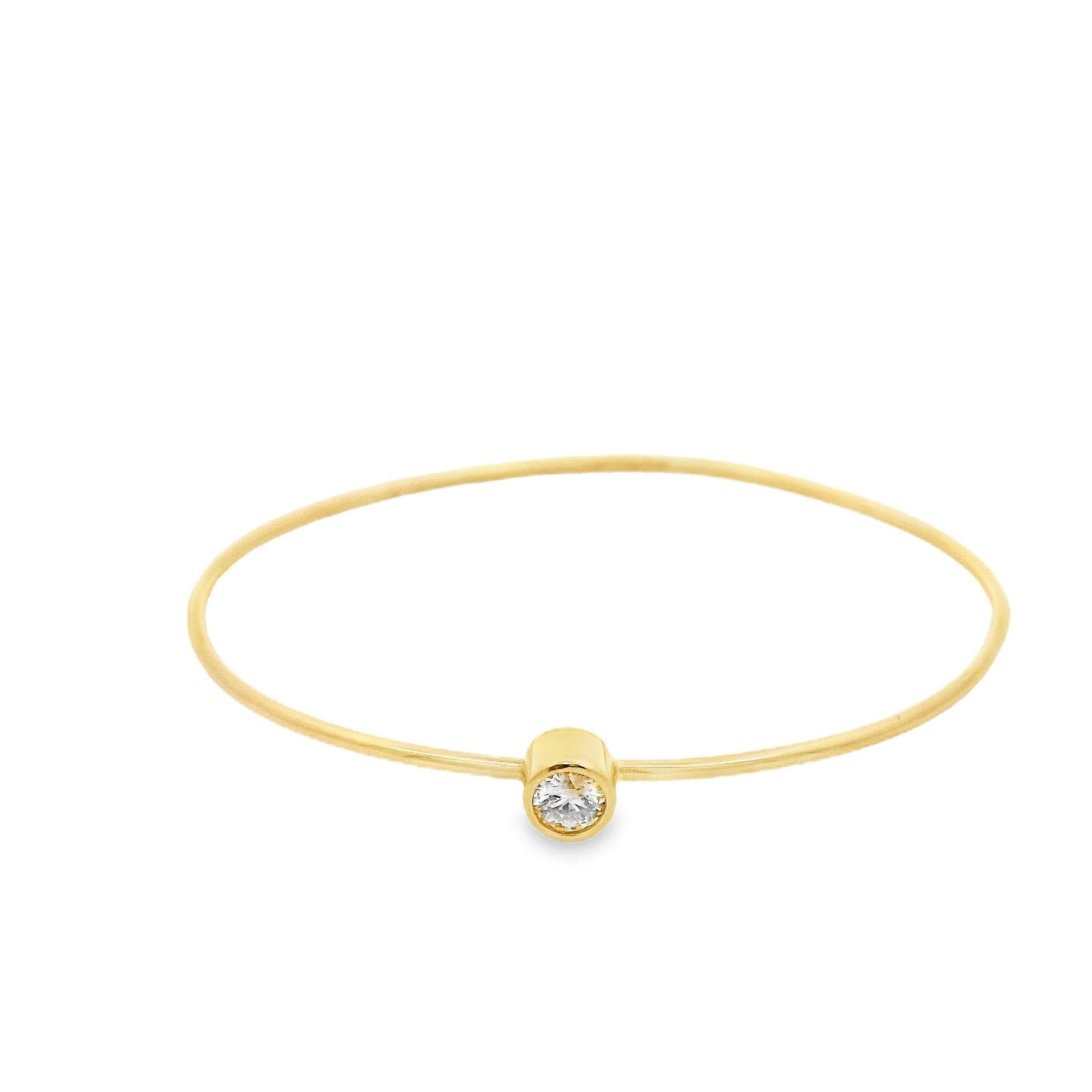 This Round Bezel Set Diamond Bangle in 14k yellow gold showcases an exquisite 0.60 carat diamond securely framed in a sleek bezel setting, radiating refined brilliance. Designed with a secure clasp opening, it offers effortless elegance and a comfortable fit, making it the perfect statement piece for any luxurious occasion.