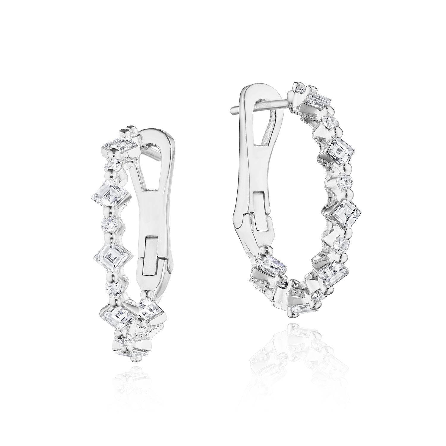 | Additional Description | Oval hoop earrings of 18k White Gold are meticulously hand-set with carré cut diamonds. Milgrain-studded TACORI Crescent detailing decorates the silhouette. |