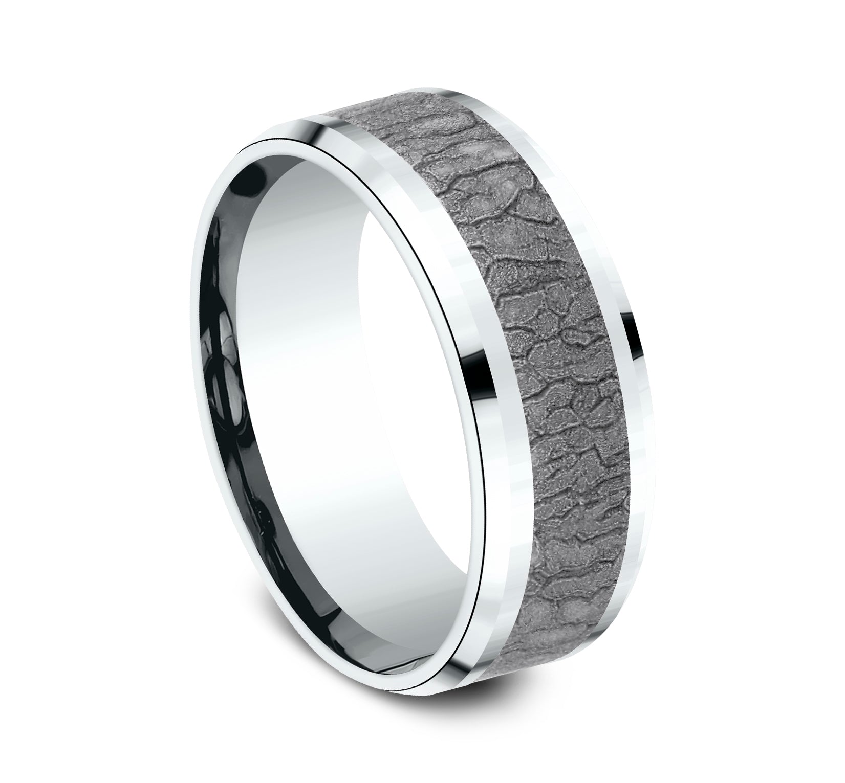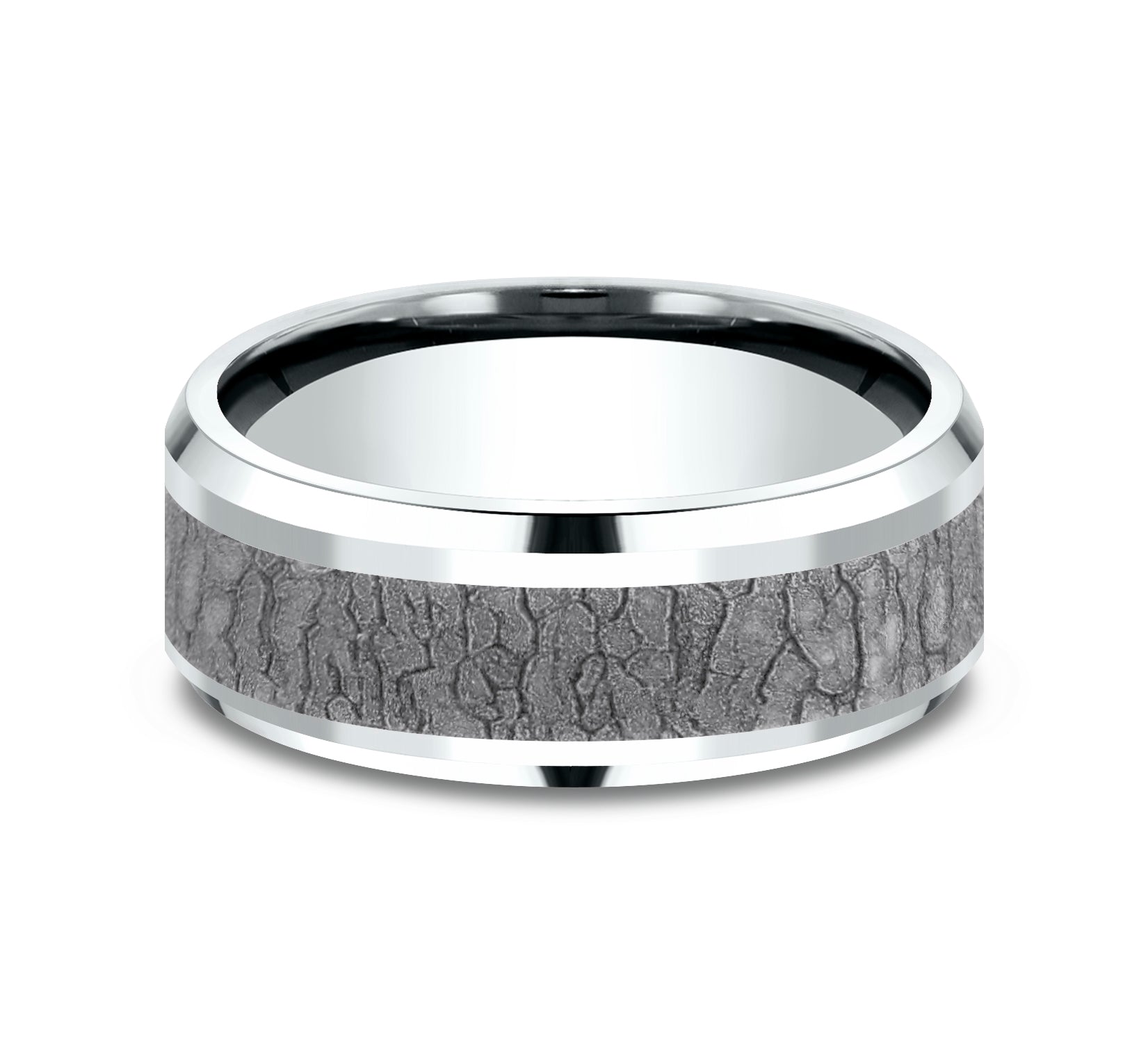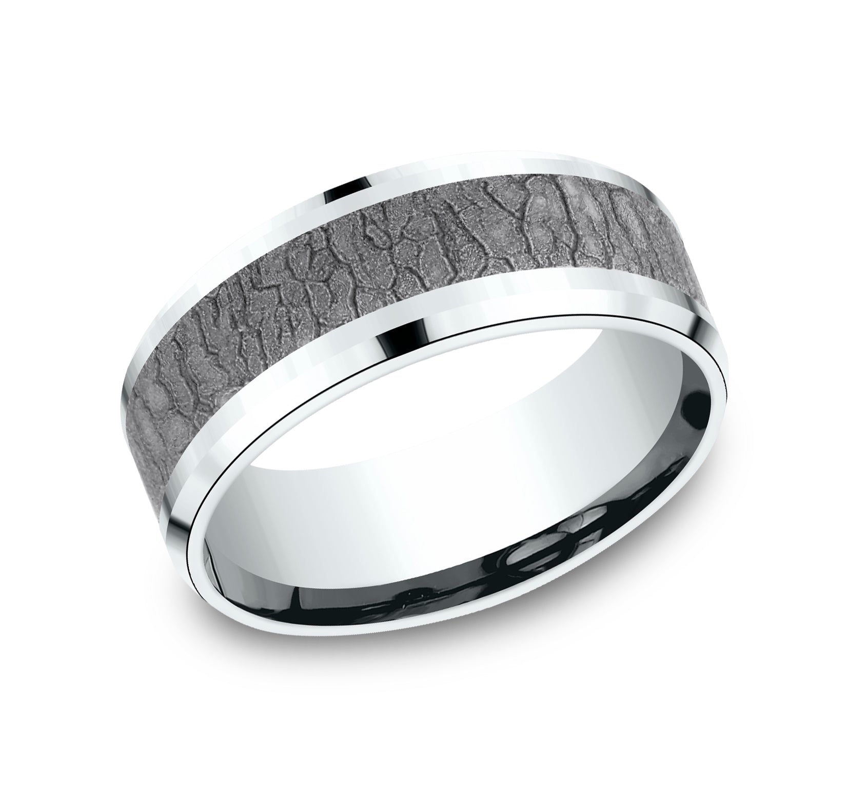| Additional Description | 8mm, Comfort fit 14K White Gold and Grey Tantalum Tree bark patterned center, polished drop bevel edges |