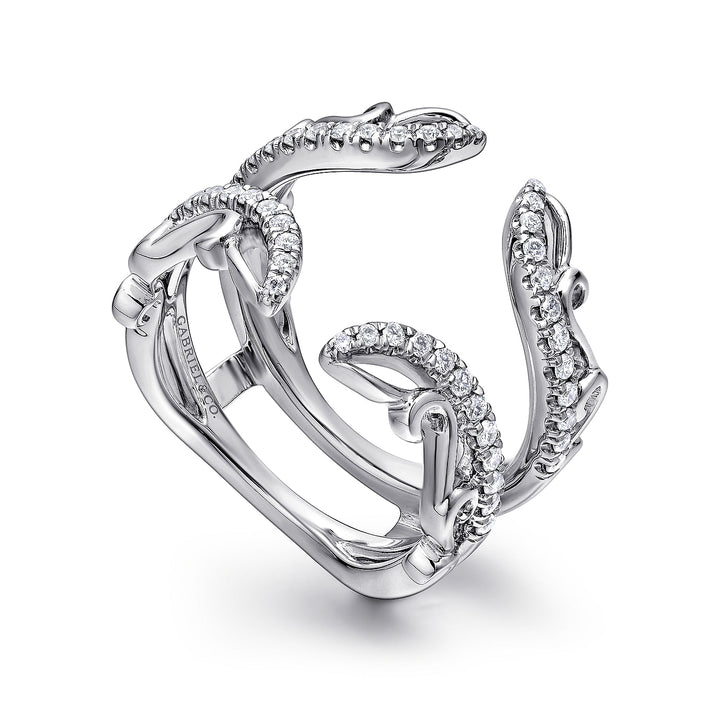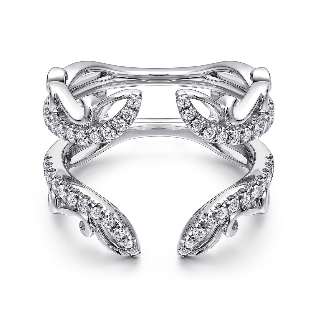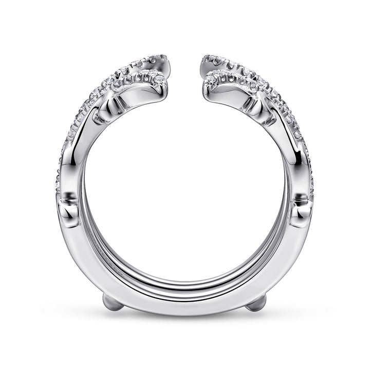 Sweeping tendrils of pave diamonds and polished gold scrolls create a magnificent frame for your engagement ring in this ring jacket.