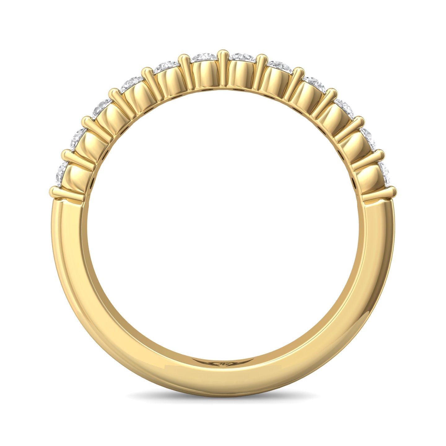 | Additional Description | Shimmering round diamonds are perfectly matched in this FlyerFit shared prong matching wedding band. |
