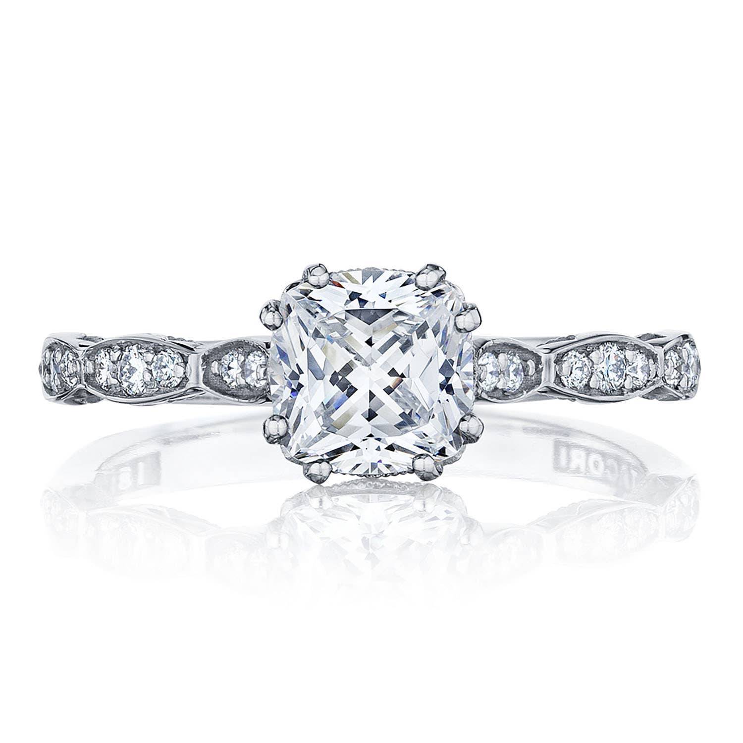 | Additional Description | Round-brilliant diamonds form marquise shapes along the ceiling of the ring, while the innerface is decorated with Sculpted Crescent fabric. The solitaire sits atop an intricate, milgrain-studded Cathedral foundation. |