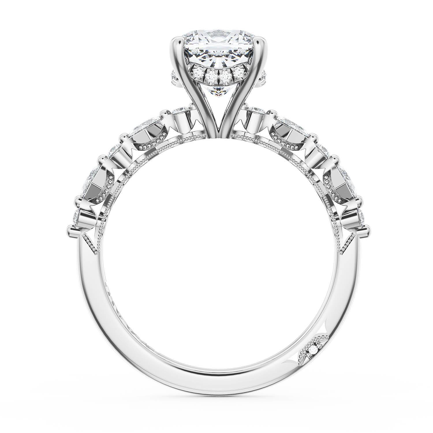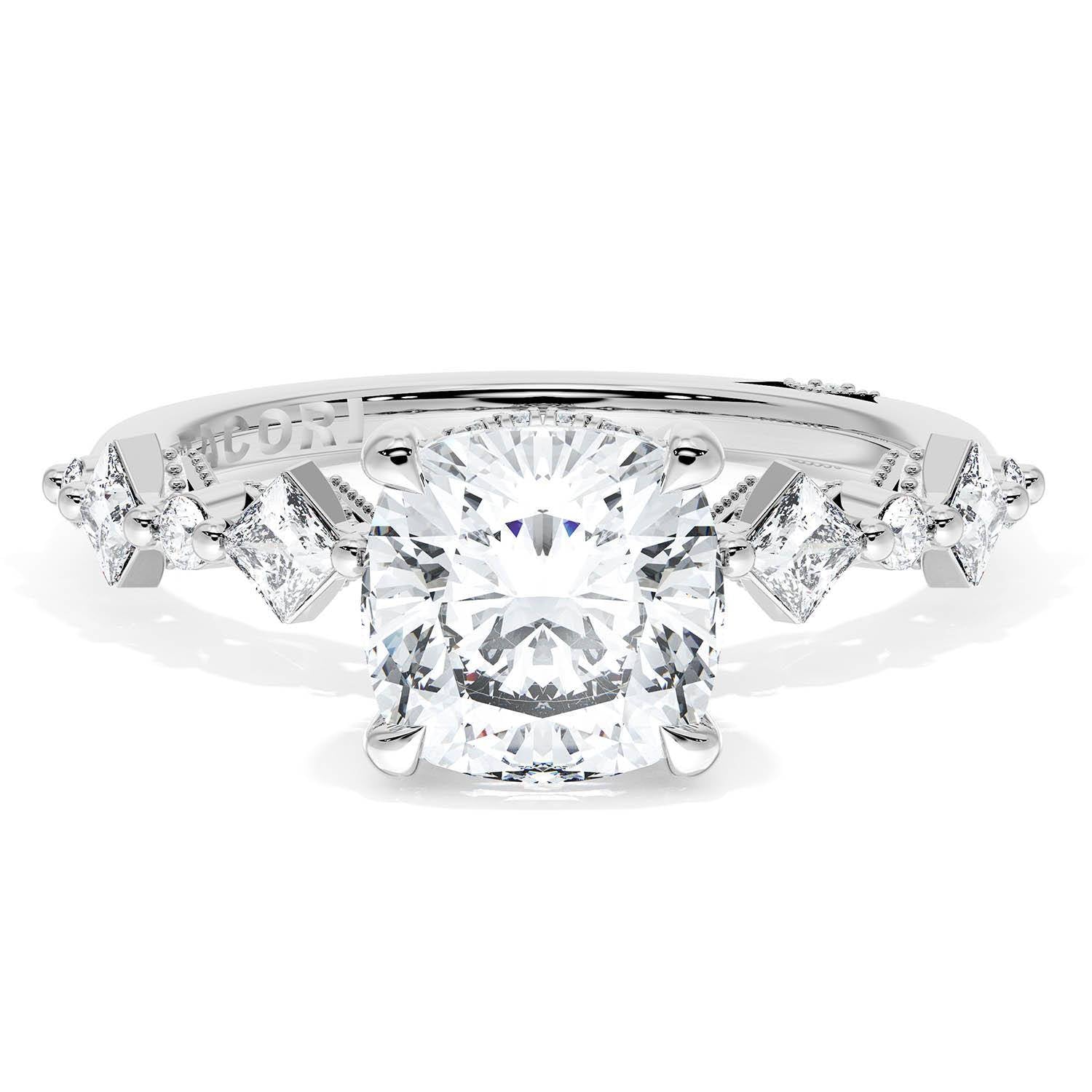 A Cushion Solitaire is set into an 18kt White Gold foundation. Alternating carré and round brilliant diamonds trace up the ceiling and hand-hewn beading adds texture to the silhouette.