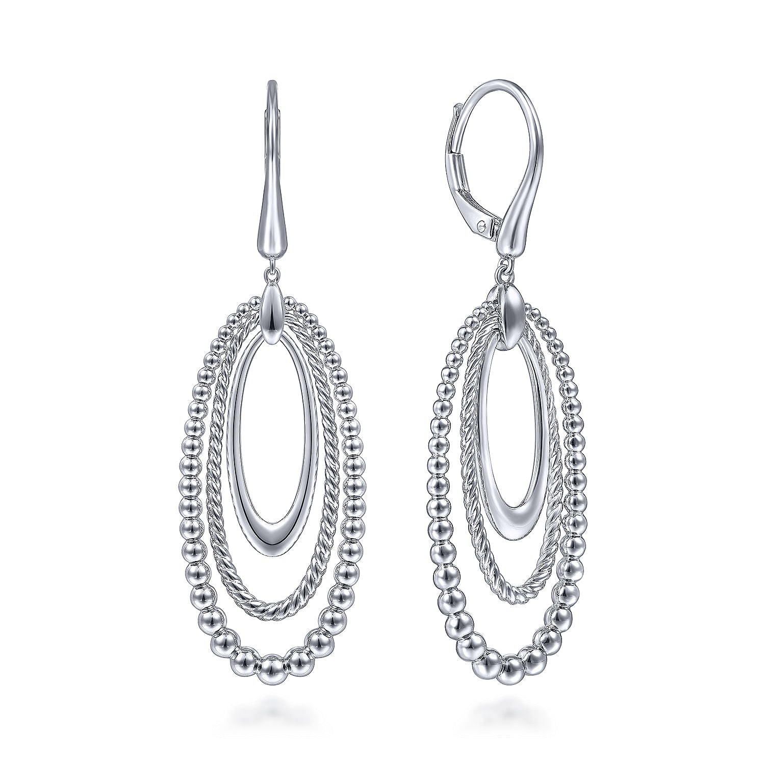 Create subtle movement that will capture the light and the room's attention when you don these 925 sterling silver drop earrings. Each leverback earring is adorned by three oval silhouettes in varying sizes. The smallest polished loop is nestled inside a rope of twisted silver, which is then suspended within a chain of graduated spheres.