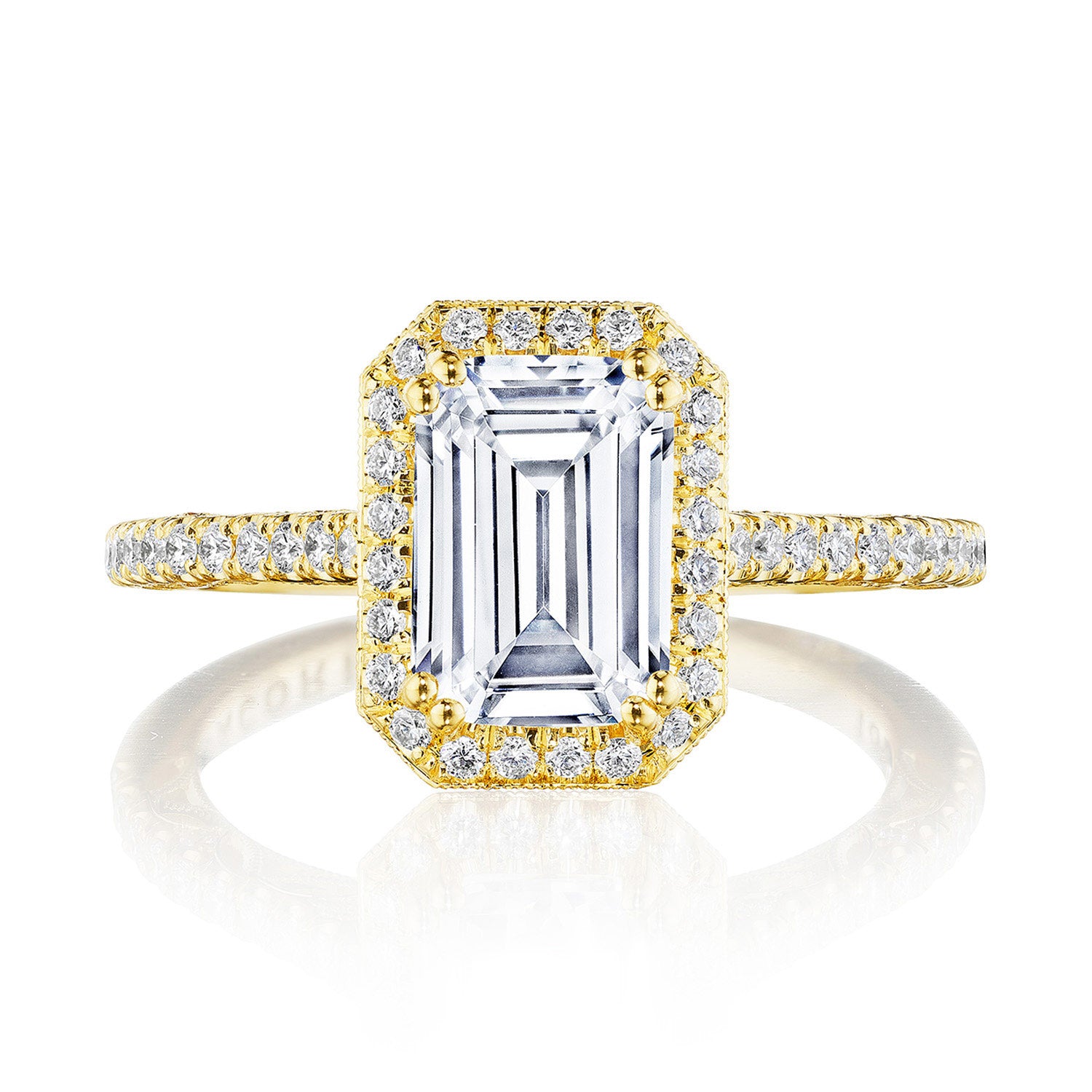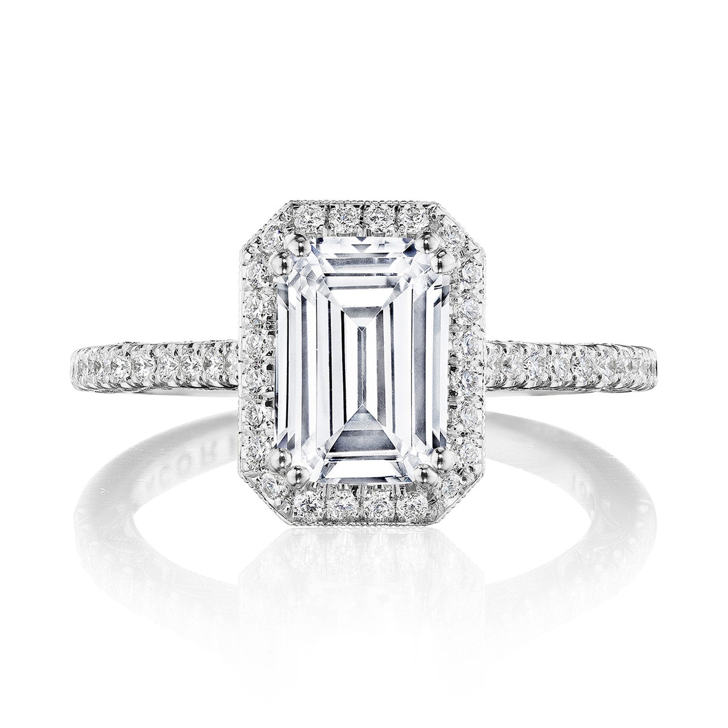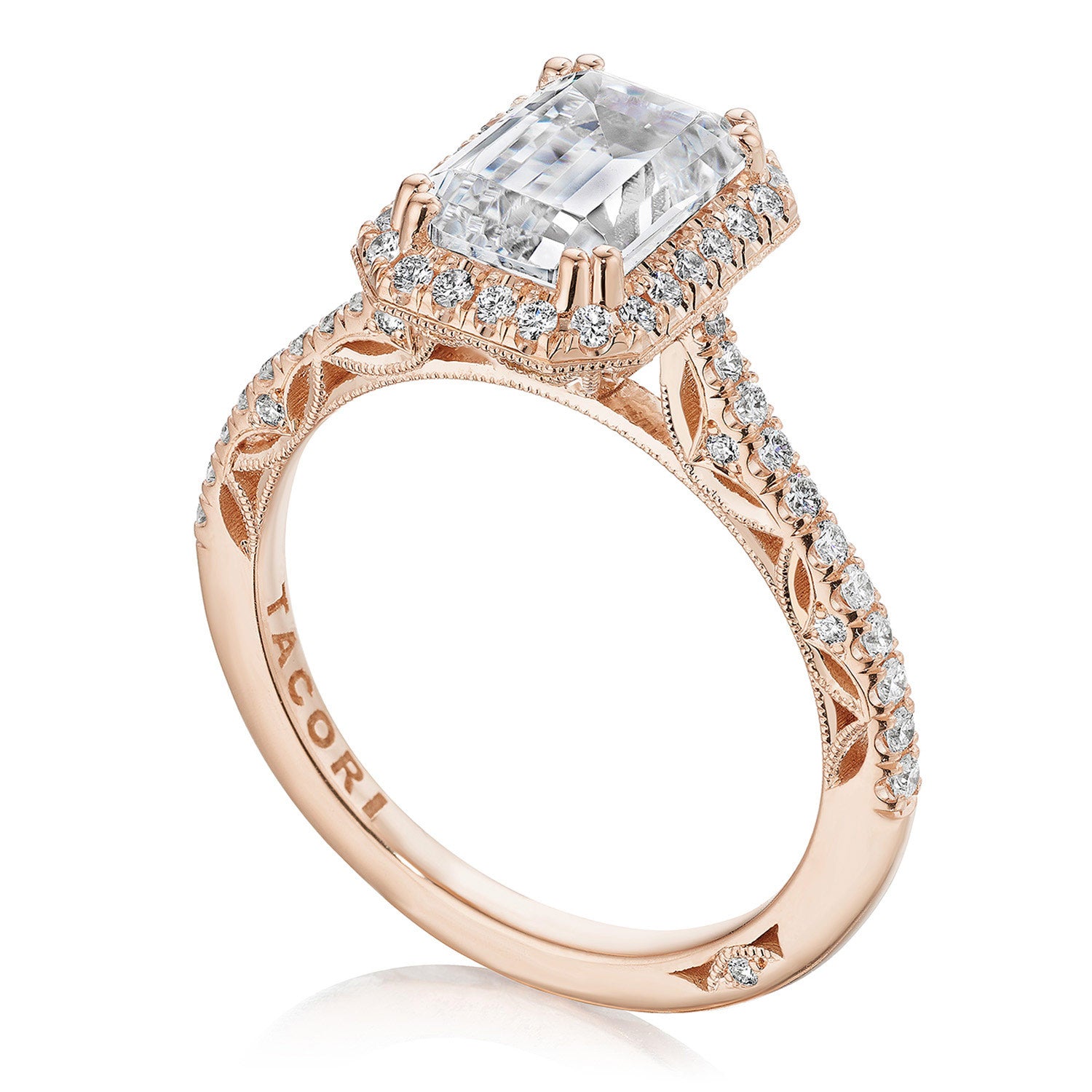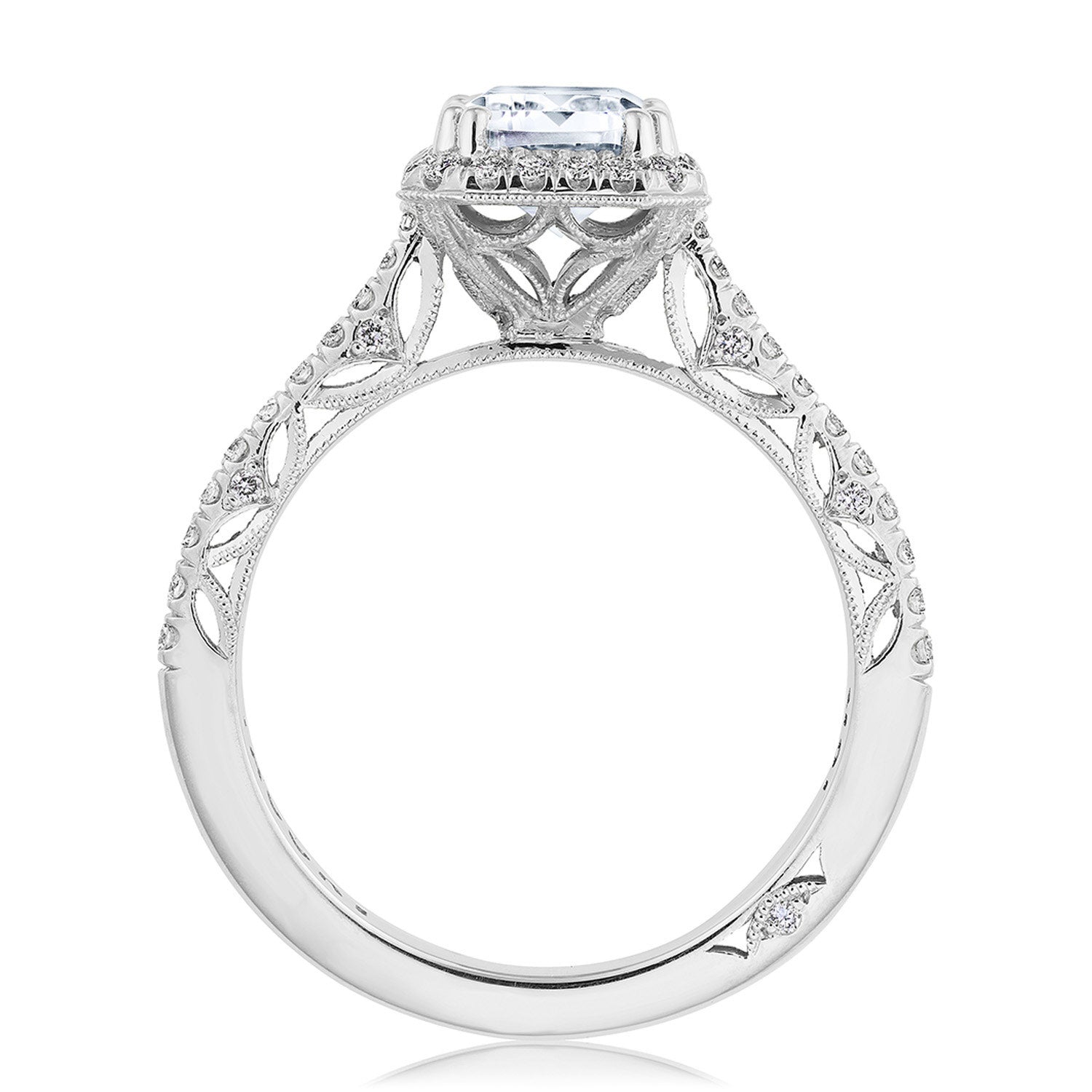 | Additional Description | A subtle Spotlight Bloom encircles the center stone, and more brilliance is added by the meticulous French pavé that leads up the ceiling. A lace-like Crescent Fabric, edged with milgrain, gives stunning texture to the inner face profile. |