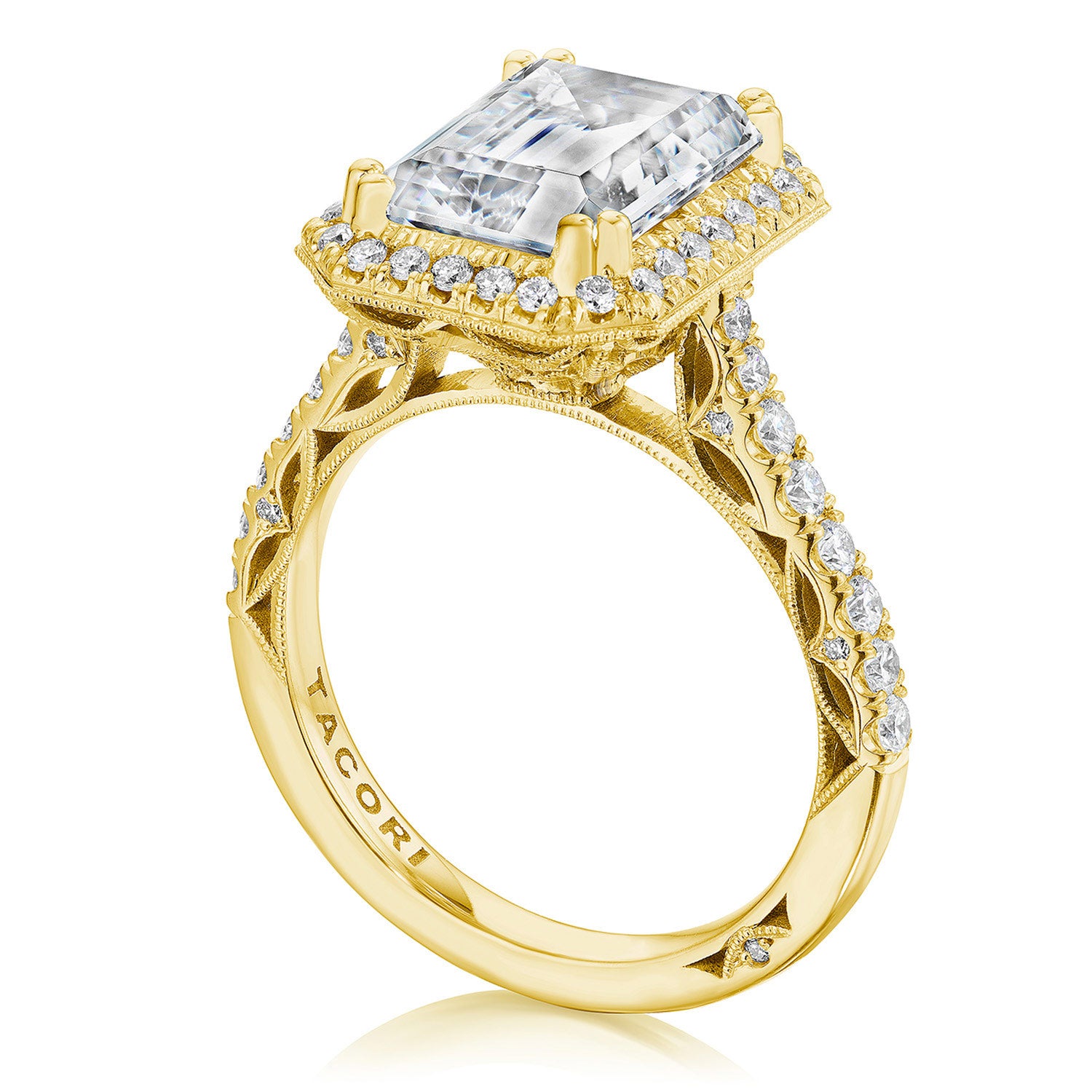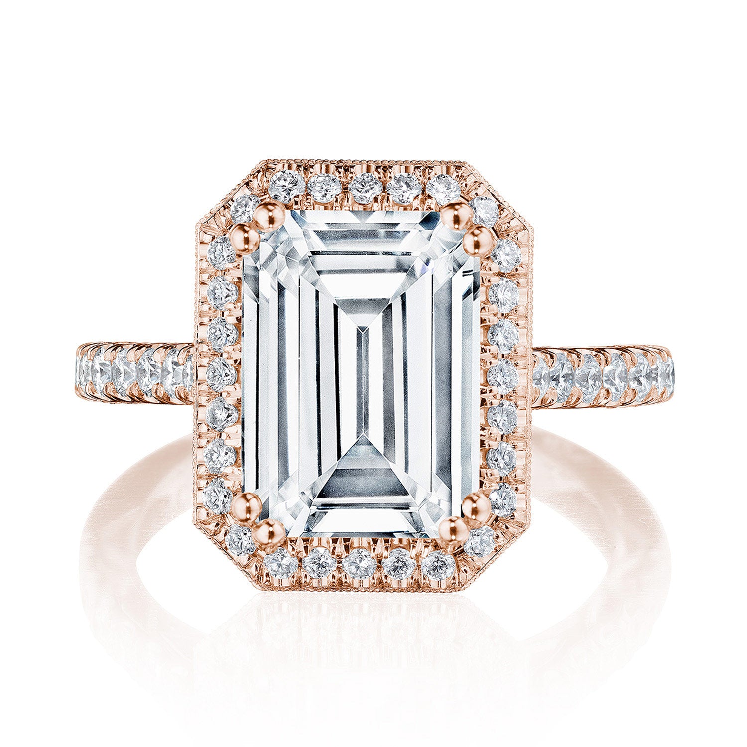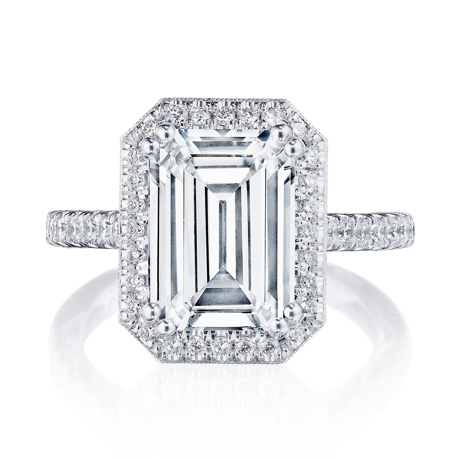 Additional Description A subtle Spotlight Bloom encircles the center stone, and more brilliance is added by the meticulous French pavé that leads up the ceiling. A lace-like Crescent Fabric, edged with milgrain, gives stunning texture to the inner face profile.