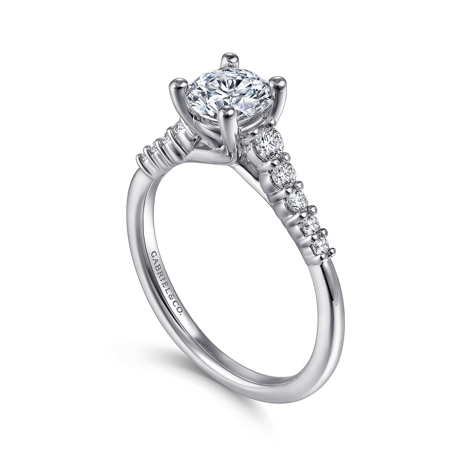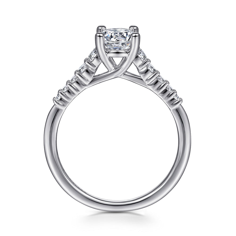 Astonishing 0.24ct accent diamonds in shared prong settings line the reverse tapered shank of this sophisticated engagement ring designed for a 0.75ct round center stone. The graduated diamonds create a look that is modern and sleek.????????Finished with a criss cross gallery, this 14K white gold ring has an enduring allure.