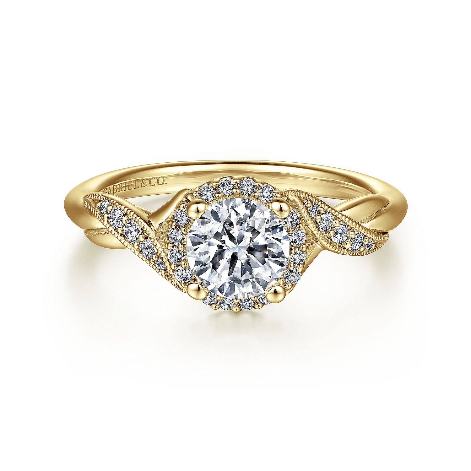 The band of this romantic engagement ring features braided strands of smooth and pave diamond encrusted yellow gold. A round halo completes the design.