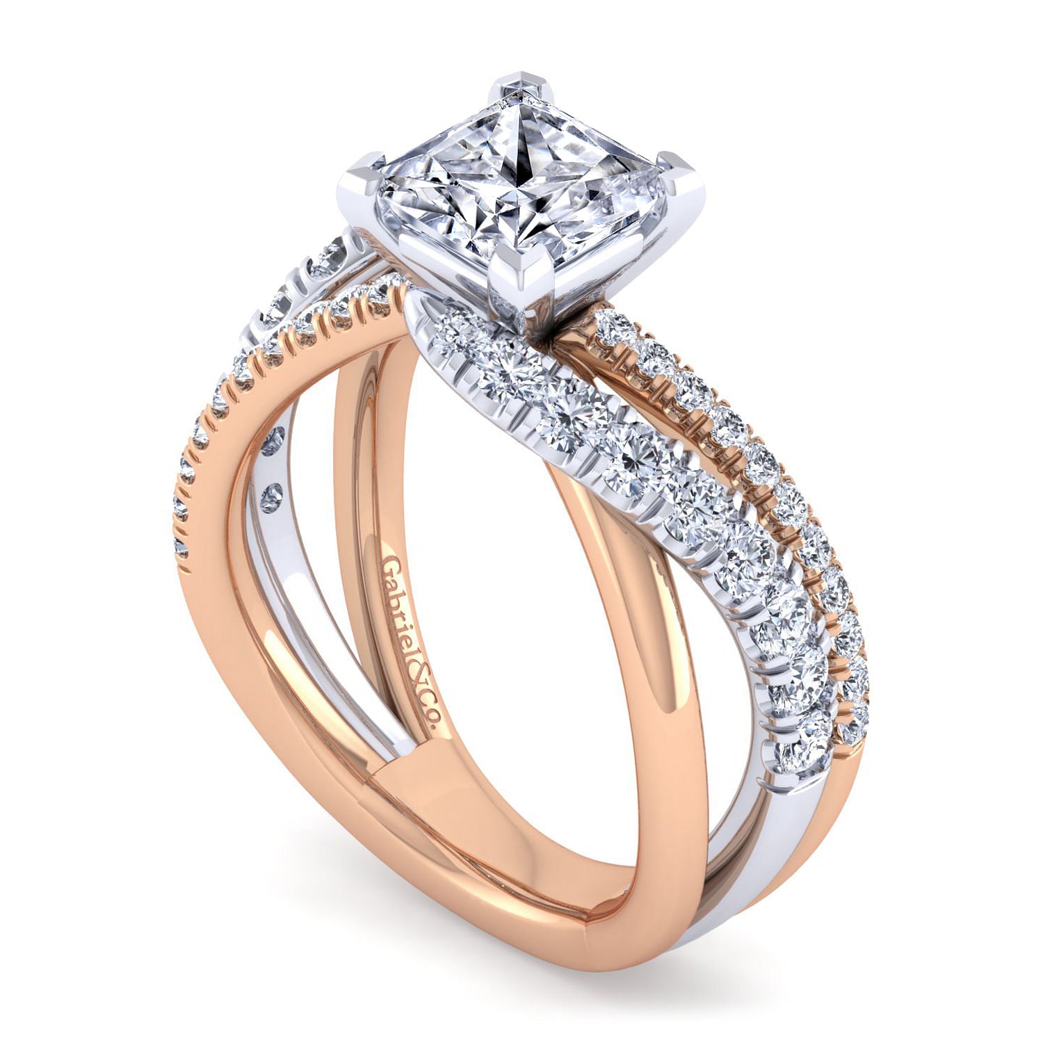 This distinctive two tone engagement ring, crafted from a unique mix of white and rose gold and studded with accent diamonds, is ideal for the woman who always stands out from the crowd.