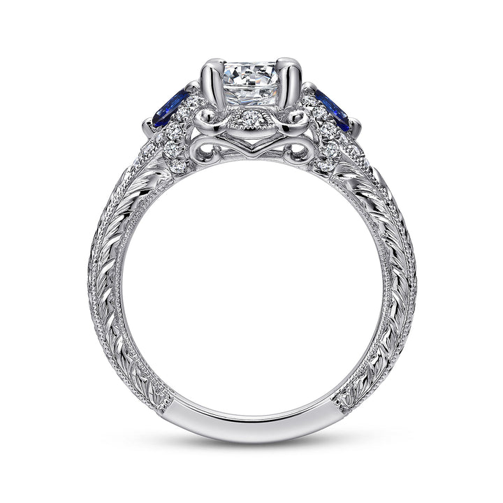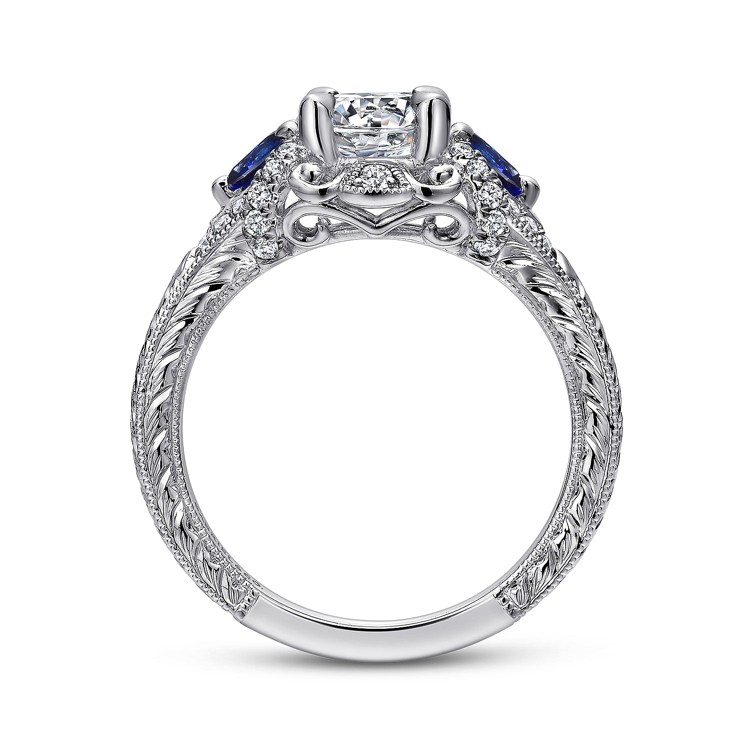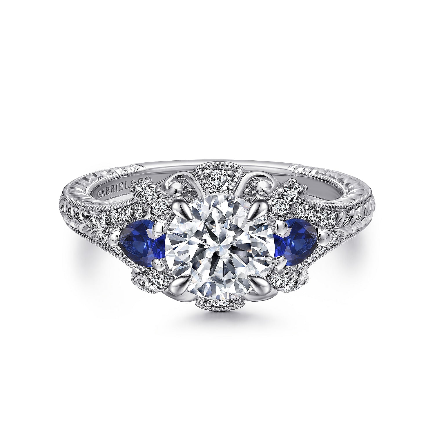This antique-style round engagement ring is richly detailed, from the hand-engraved shank to the flourishes in the gallery. Two velvety blue sapphire side stones in a contrasting pear shape are joined by glistening 0.21ct accent diamonds to create a coveted 3 stone halo silhouette. Crafted from 14K white gold, this setting boasts a colorful vintage vibe.