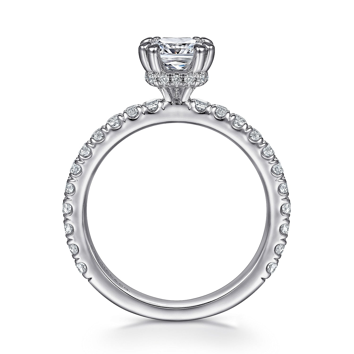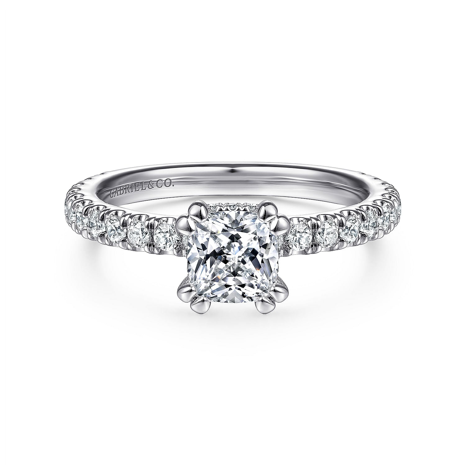 With each movement, this 0.5ct diamond engagement ring setting creates eye-catching splendor. The straight 14K white gold shank is encrusted with three-fourths of the way around with gleaming accent diamonds. A hidden halo encircling your cushion cut center stone adds surprise sparkle to this simple yet stunning ring.