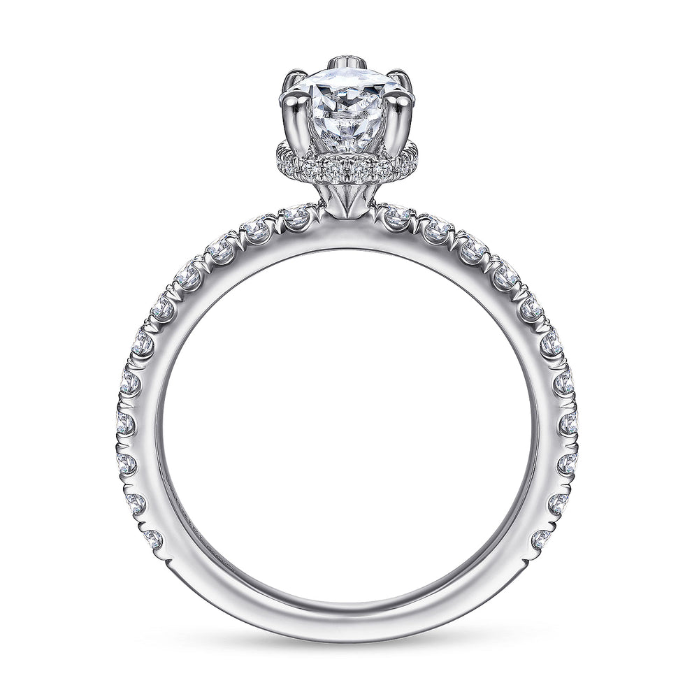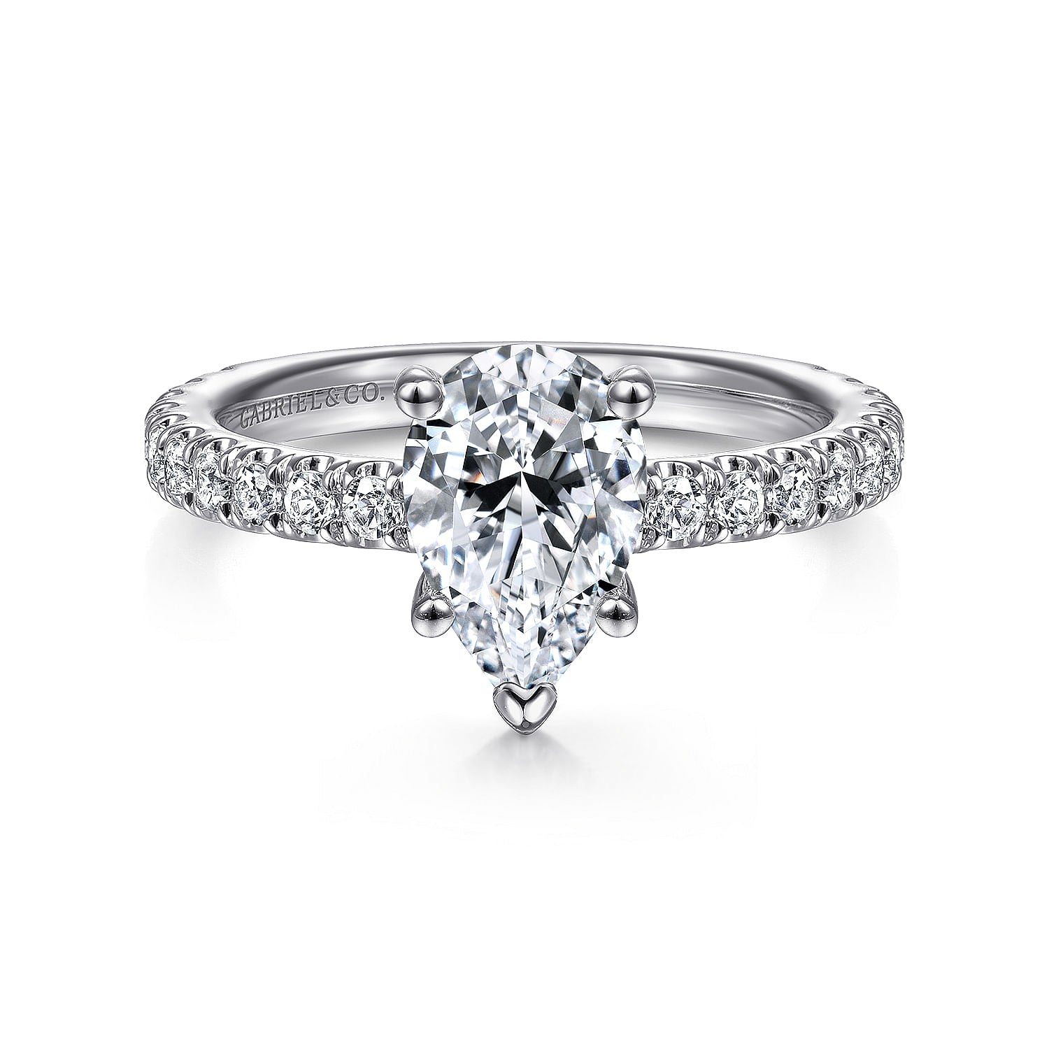 With each movement, this 0.51ct diamond engagement ring setting creates eye-catching splendor. The straight 14K white gold shank is encrusted with three-fourths of the way around with gleaming accent diamonds. A hidden halo encircling your pear shaped center stone adds surprise sparkle to this simple yet stunning ring.