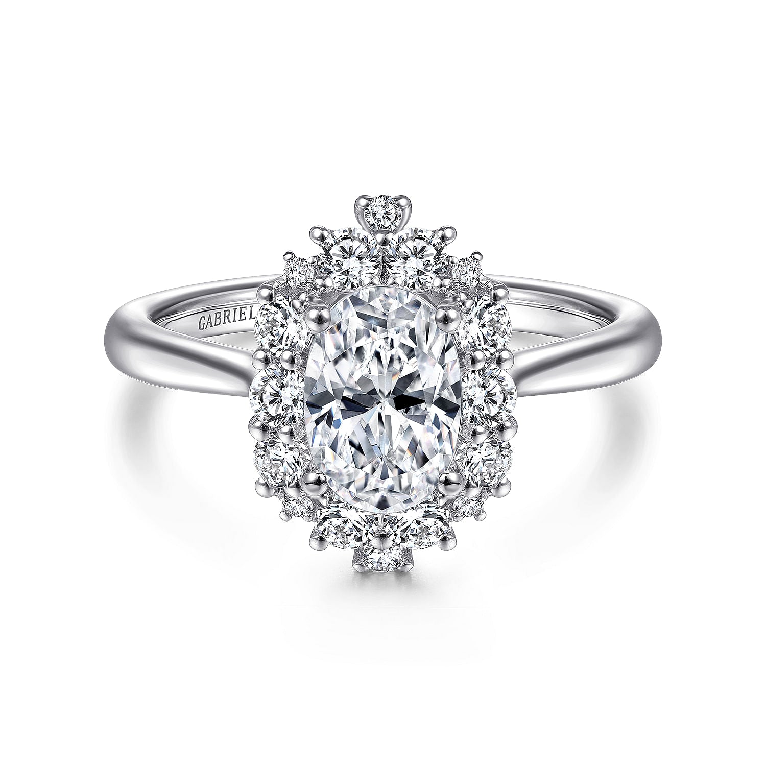 A shimmering starburst adorned with 0.50cts of prong set round diamonds is the crowning glory of this oval cut halo engagement ring. A tapered shank crafted from gleaming 14k white gold, provides a delicate backdrop for the glitz and glamour of this dazzling diamond setting.