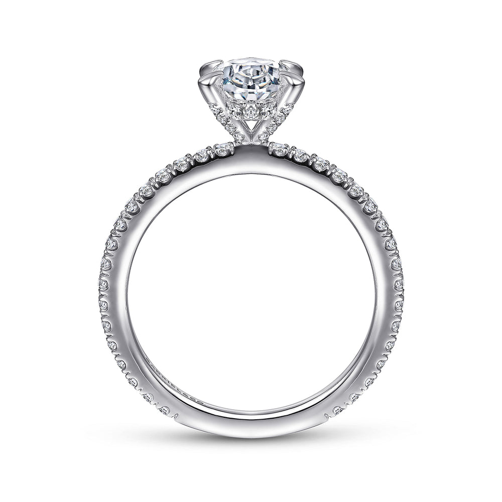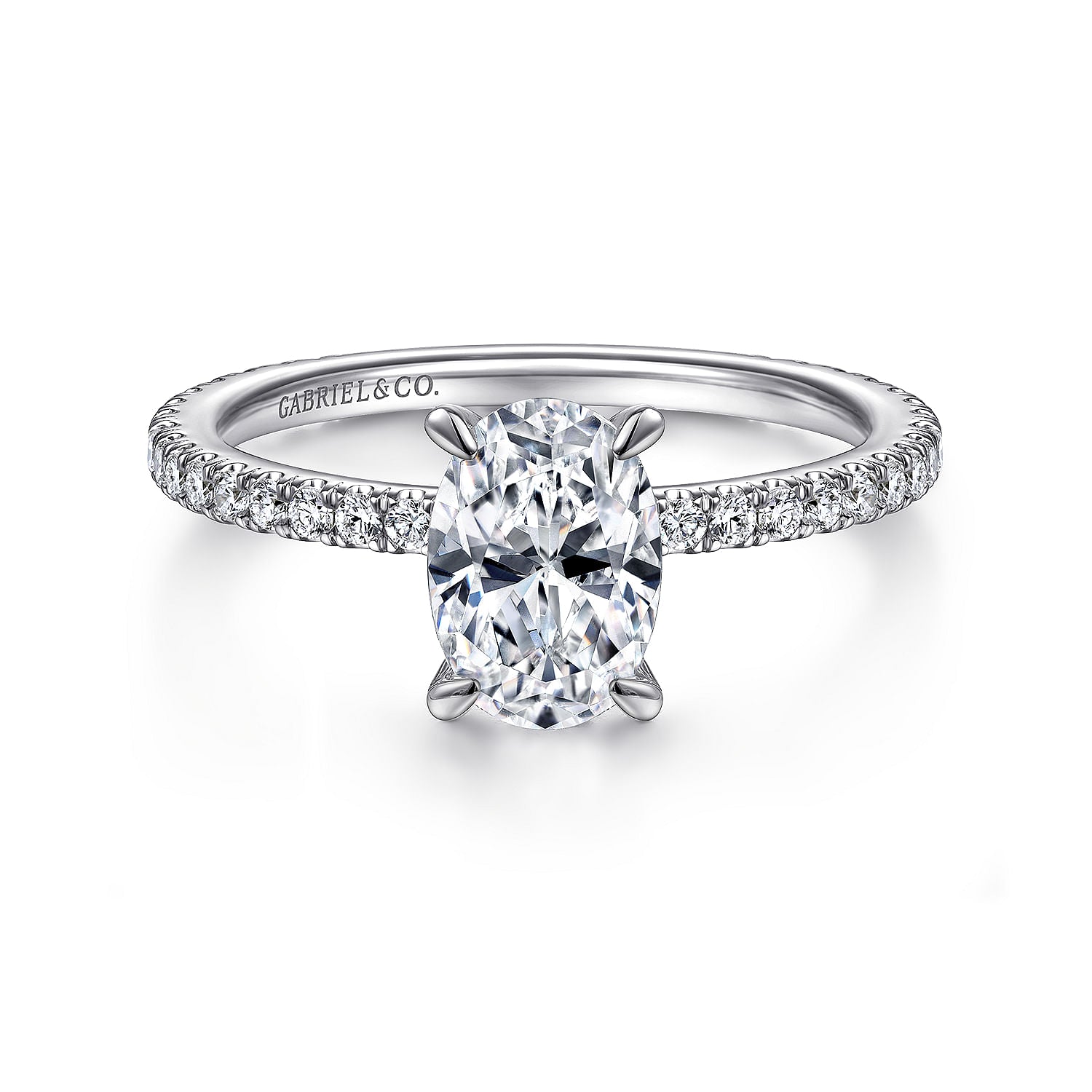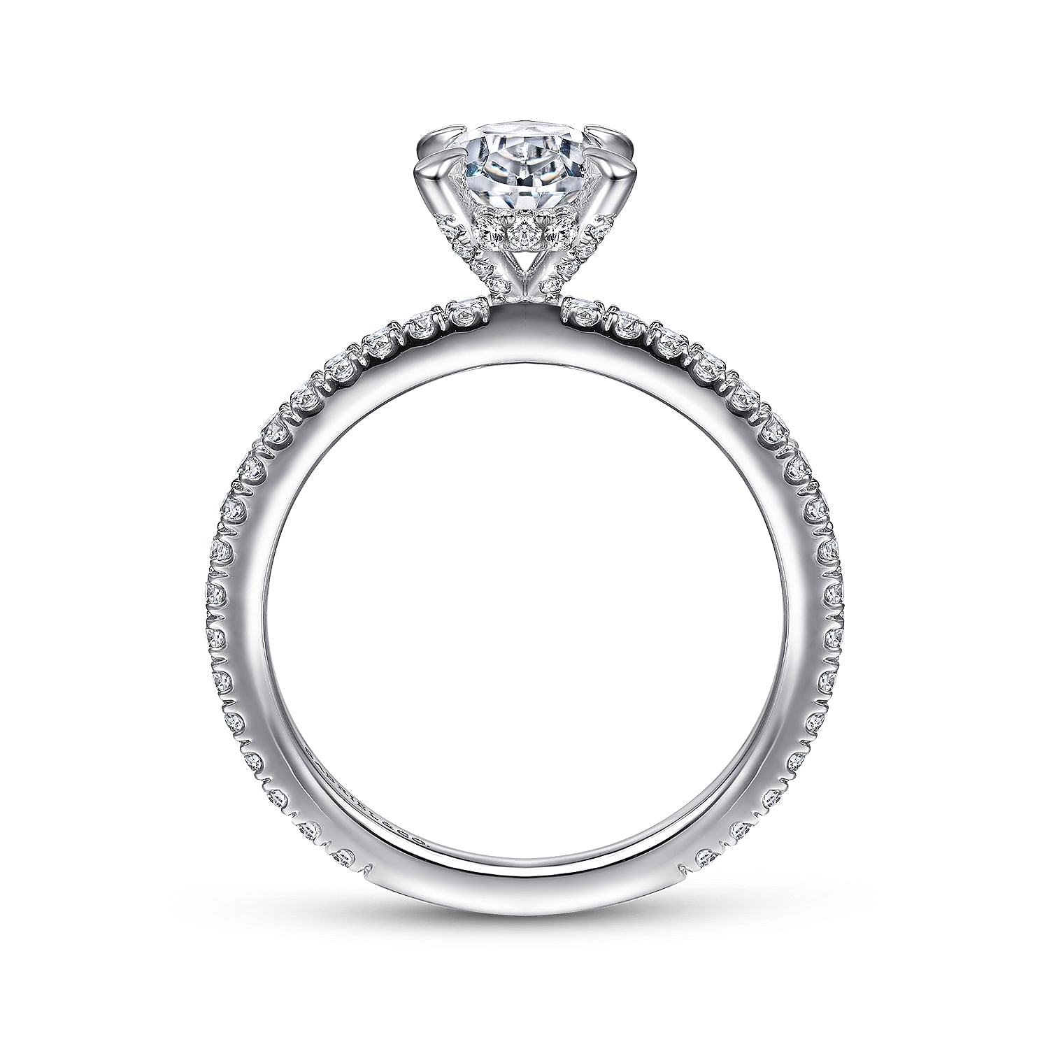 Allow your chosen 1ct oval center stone to truly shine with this understated 0.42ct diamond setting. Pavee???? set accent diamonds outline almost the entire 14K white gold shank which has a classic slim and straight silhouette. Surprise diamonds on the basket put the finishing touch on this skillfully crafted engagement ring.