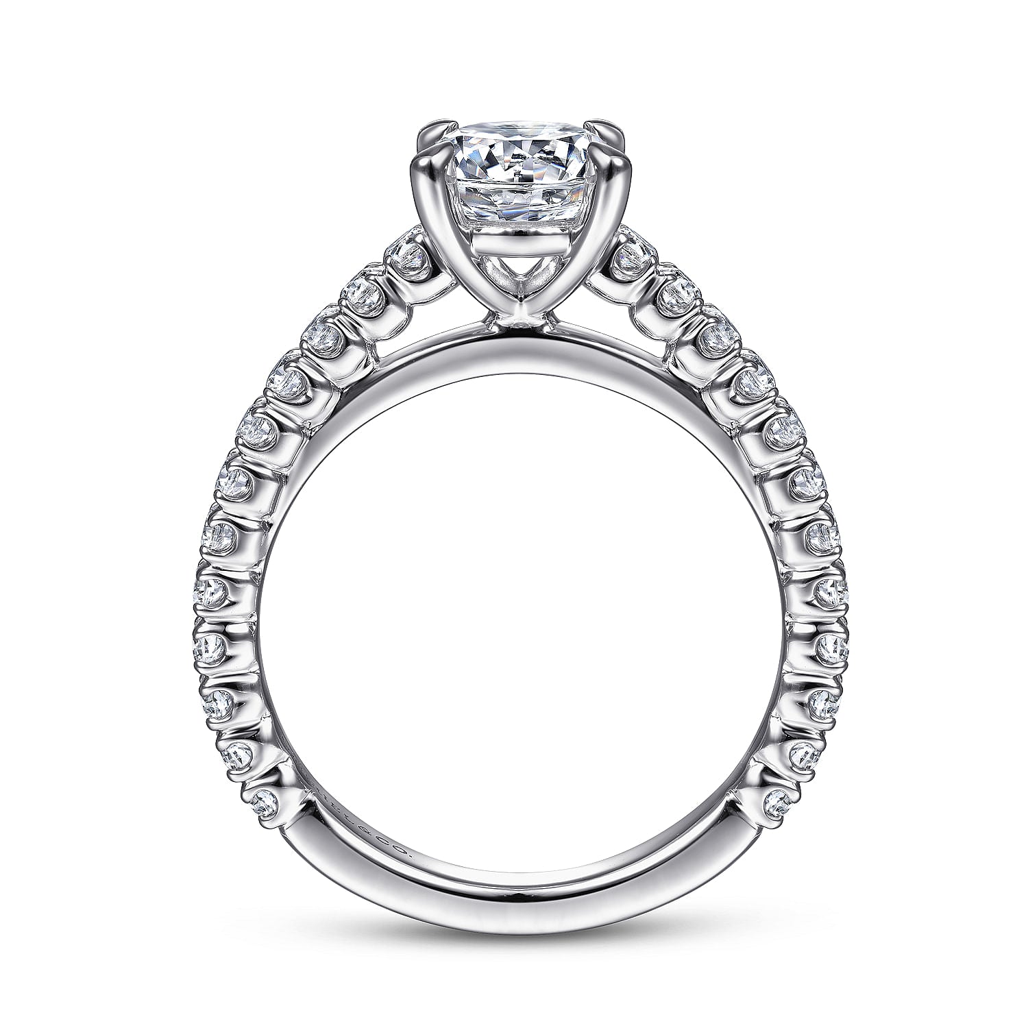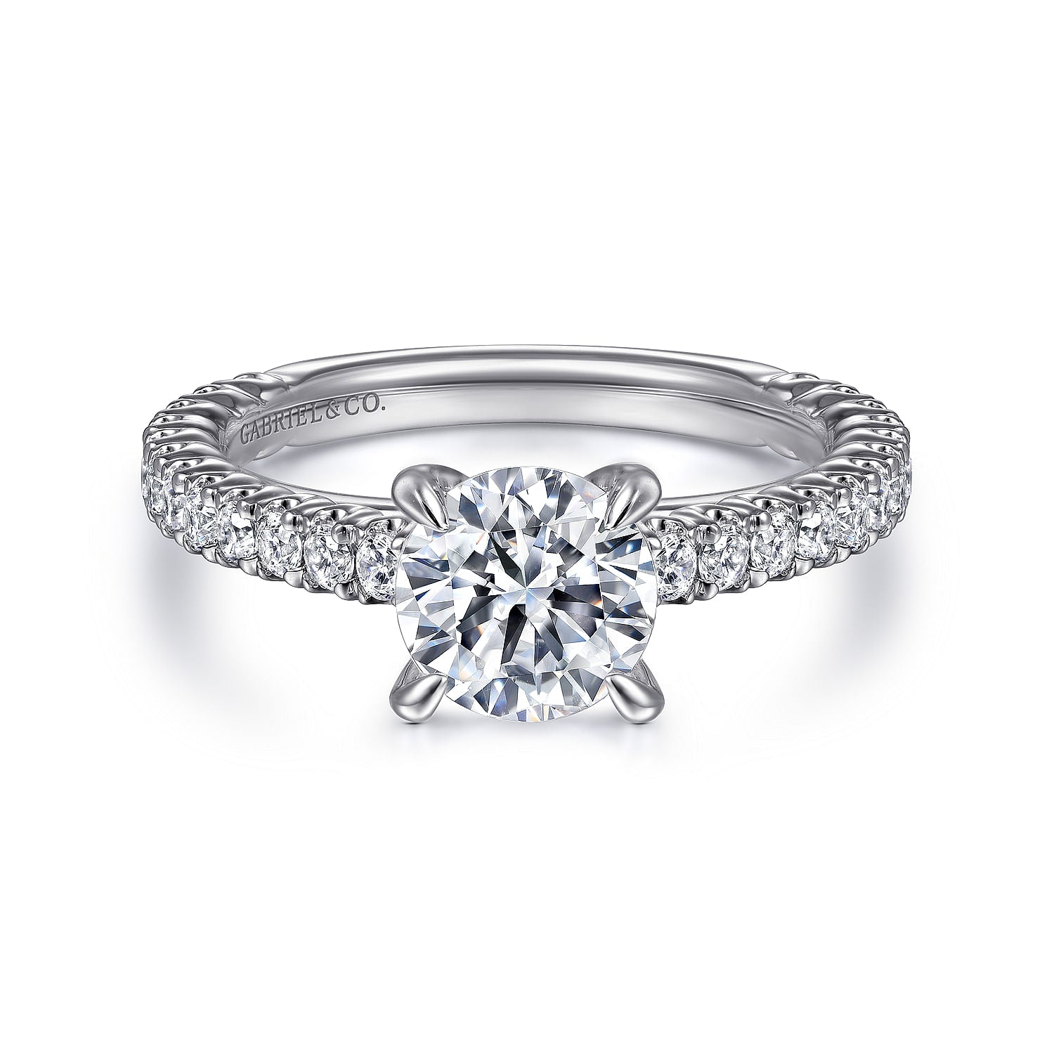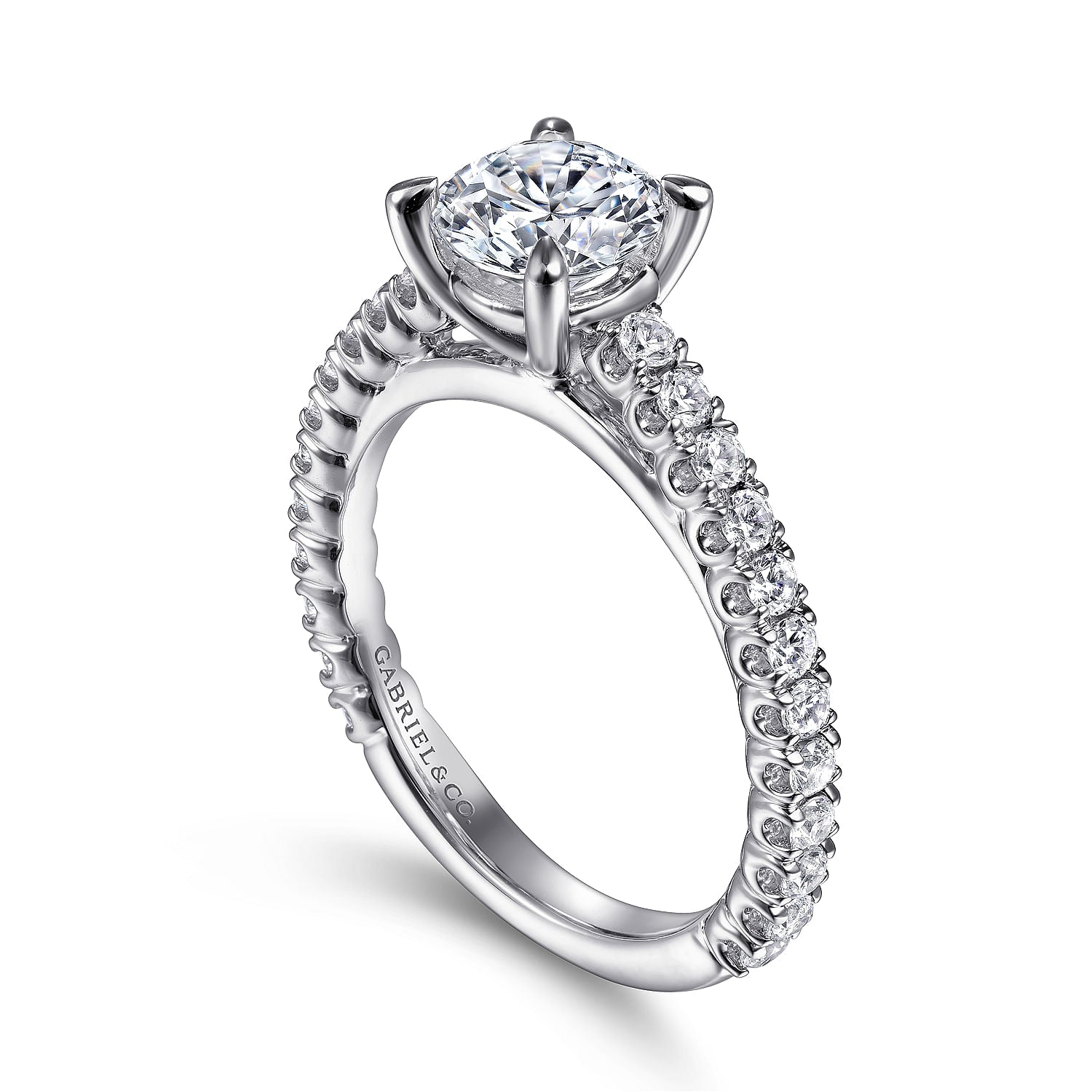 Radiate timeless simplicity with this sparkling 0.50ct diamond engagement ring setting crafted to showcase a round cut center stone. The straight 14K white gold shank features a scalloped profile garnished with columns of round cut accent diamonds. Decades from now this cathedral style ring will feel as classic and beautiful as it does today.