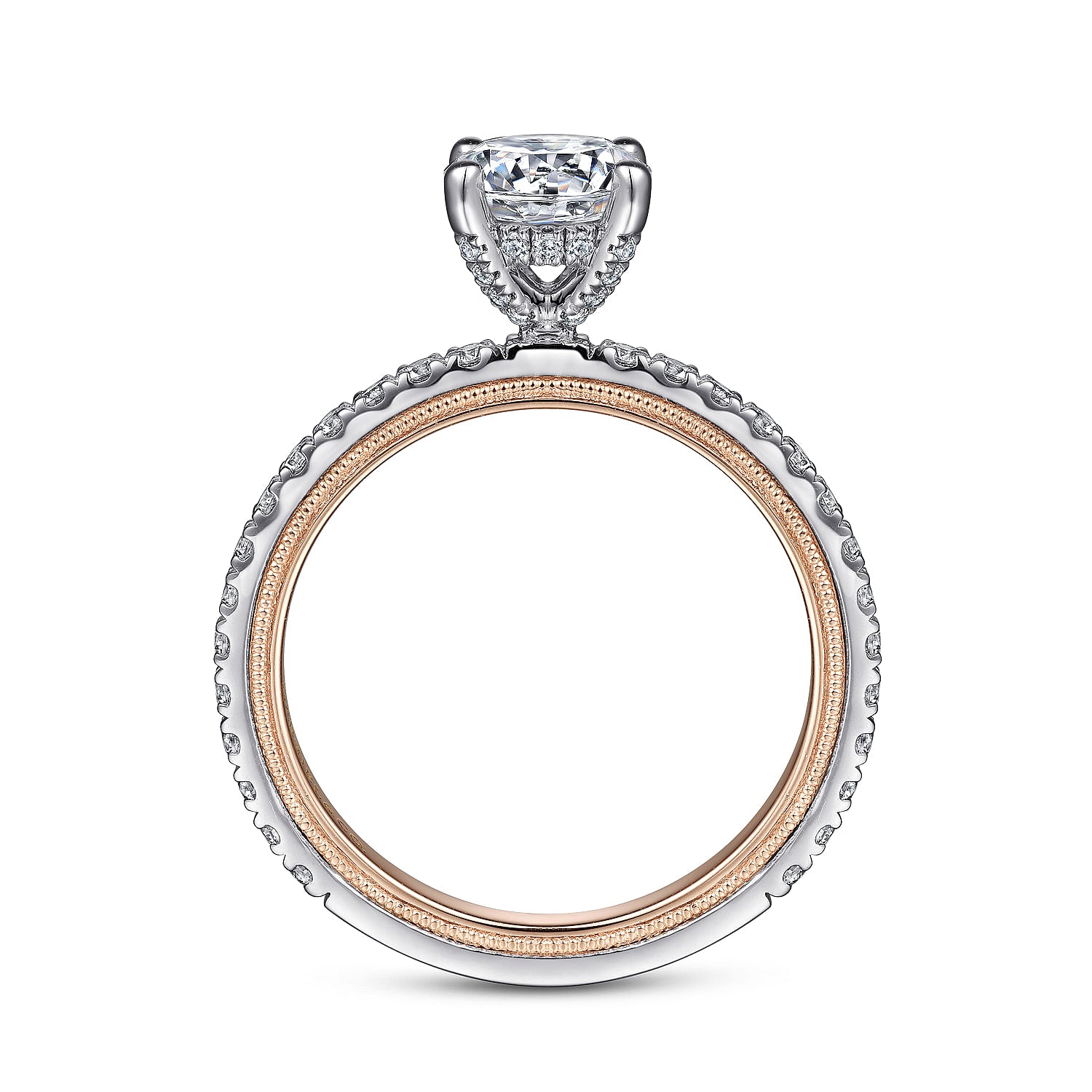 Timeless and elegant, this 1ct round engagement ring setting creates an understated look that will never go out of style. Cool 14K white gold prongs secure your precious center stone, while the slim straight shank is crafted from warm 14K rose gold for an unexpectedly stylish upgrade. This modern 0.43ct diamond setting masters the mixed metal look.