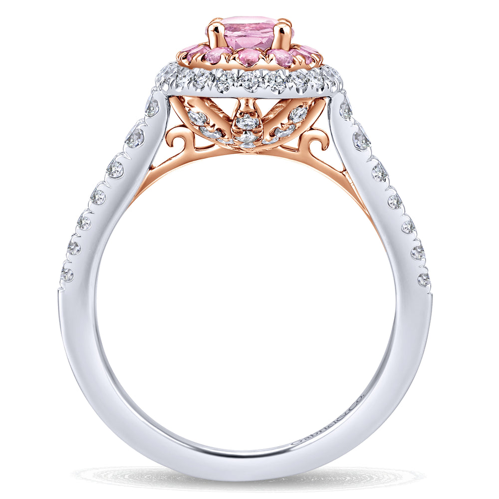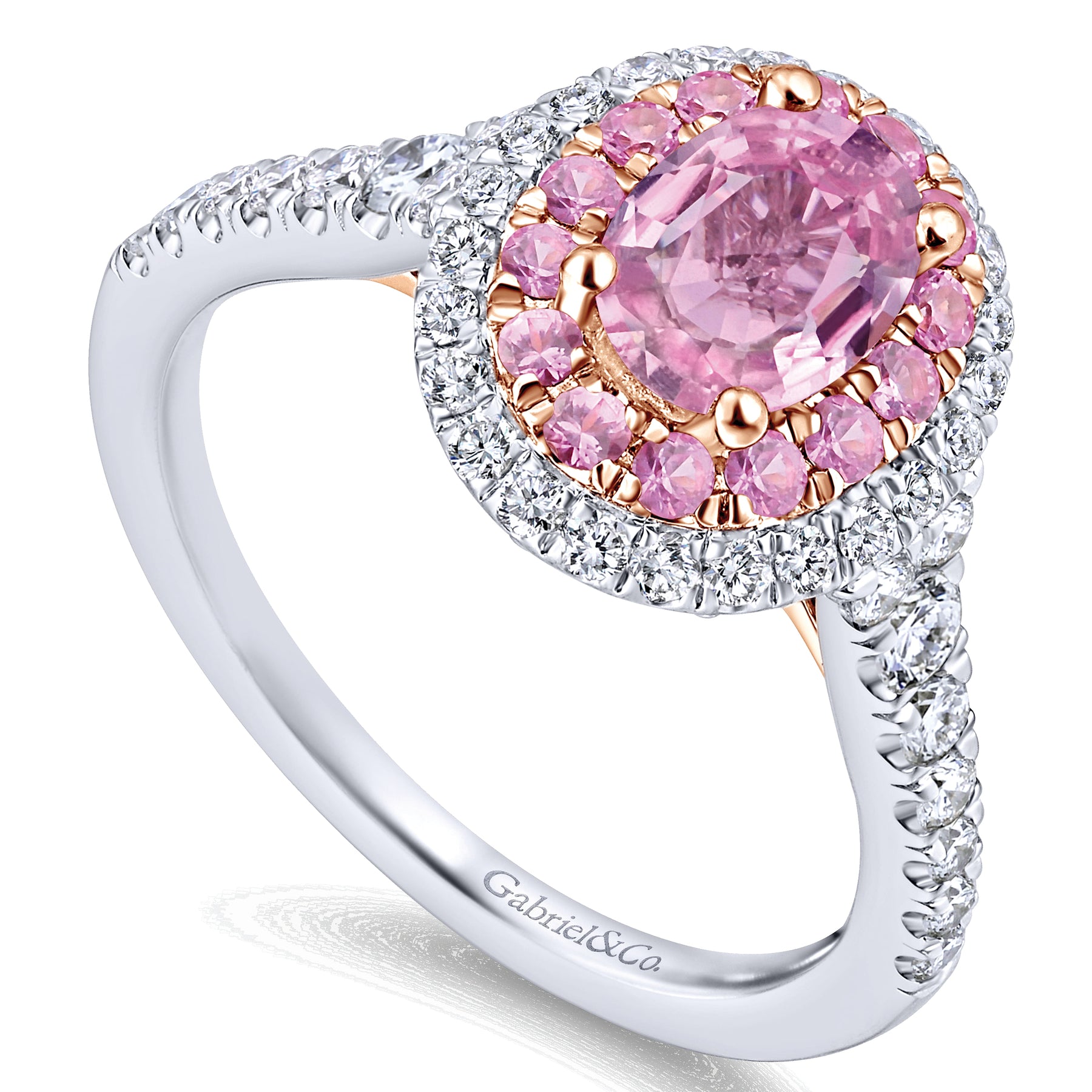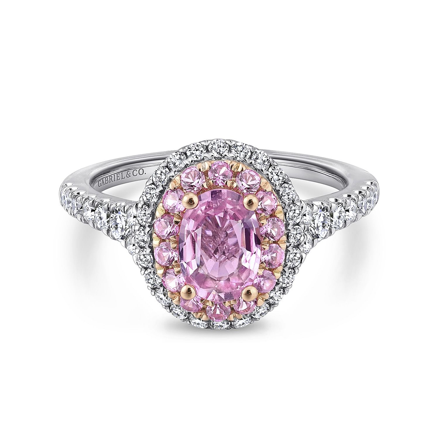 An oval cut pink sapphire is the feminine focal point of this truly original engagement ring with both diamond and pink sapphire halos.