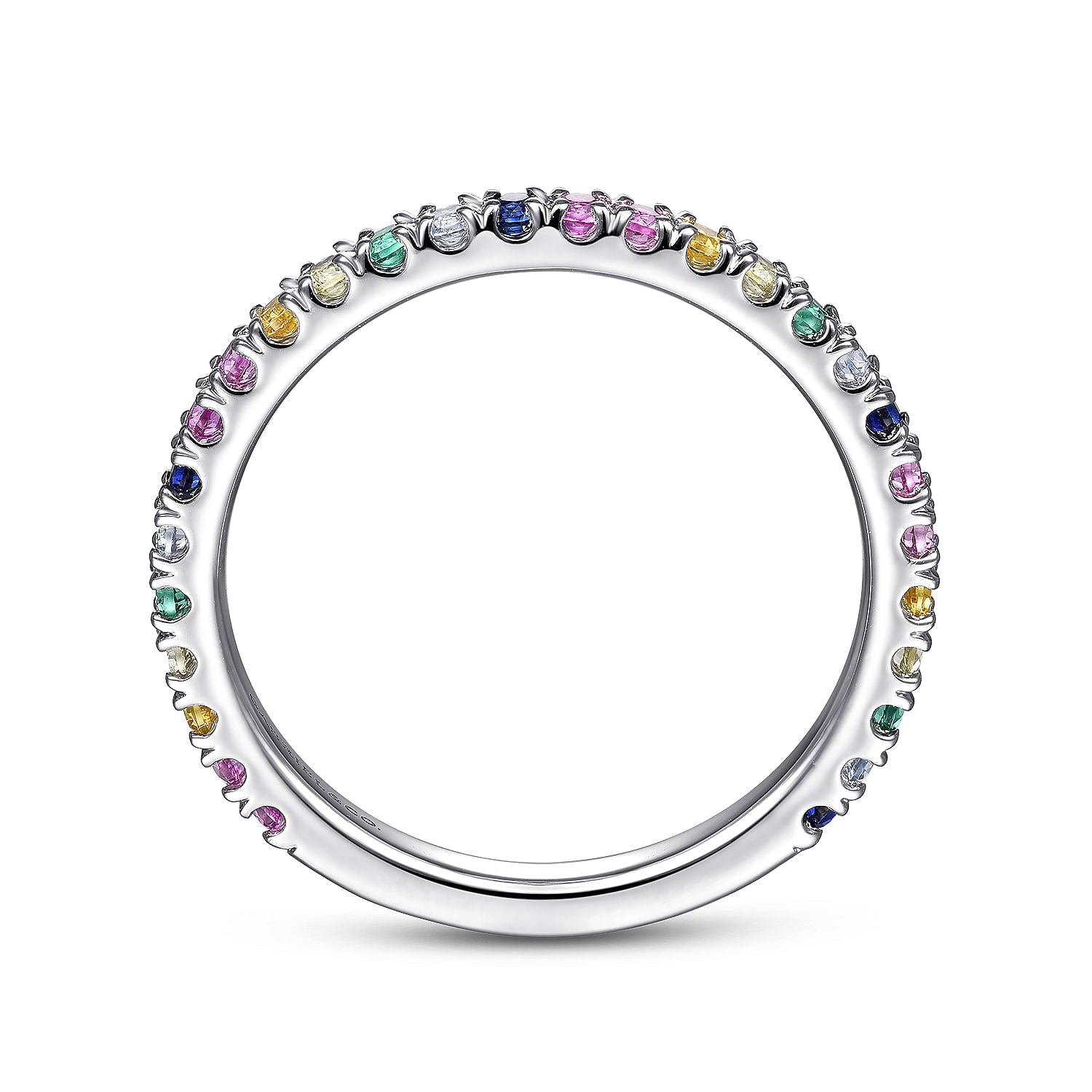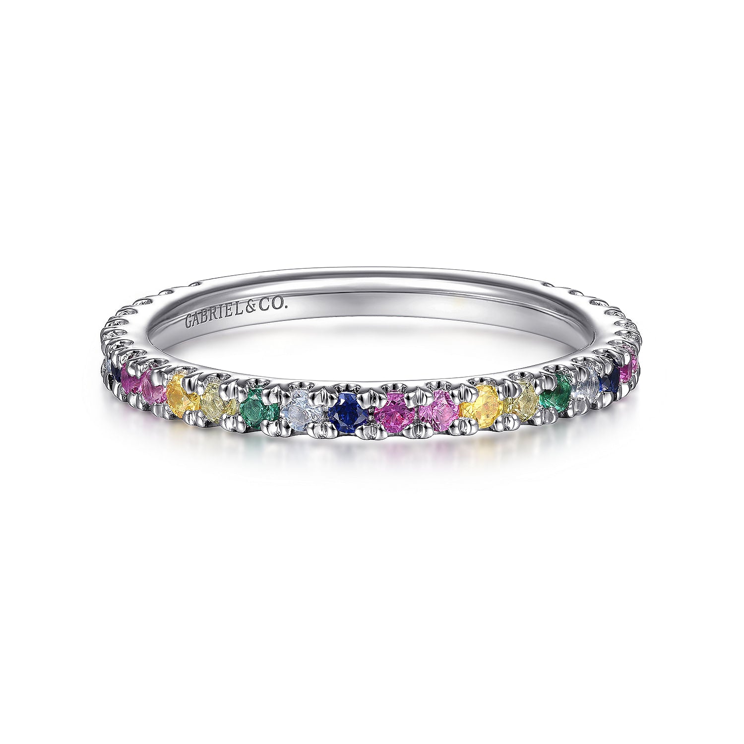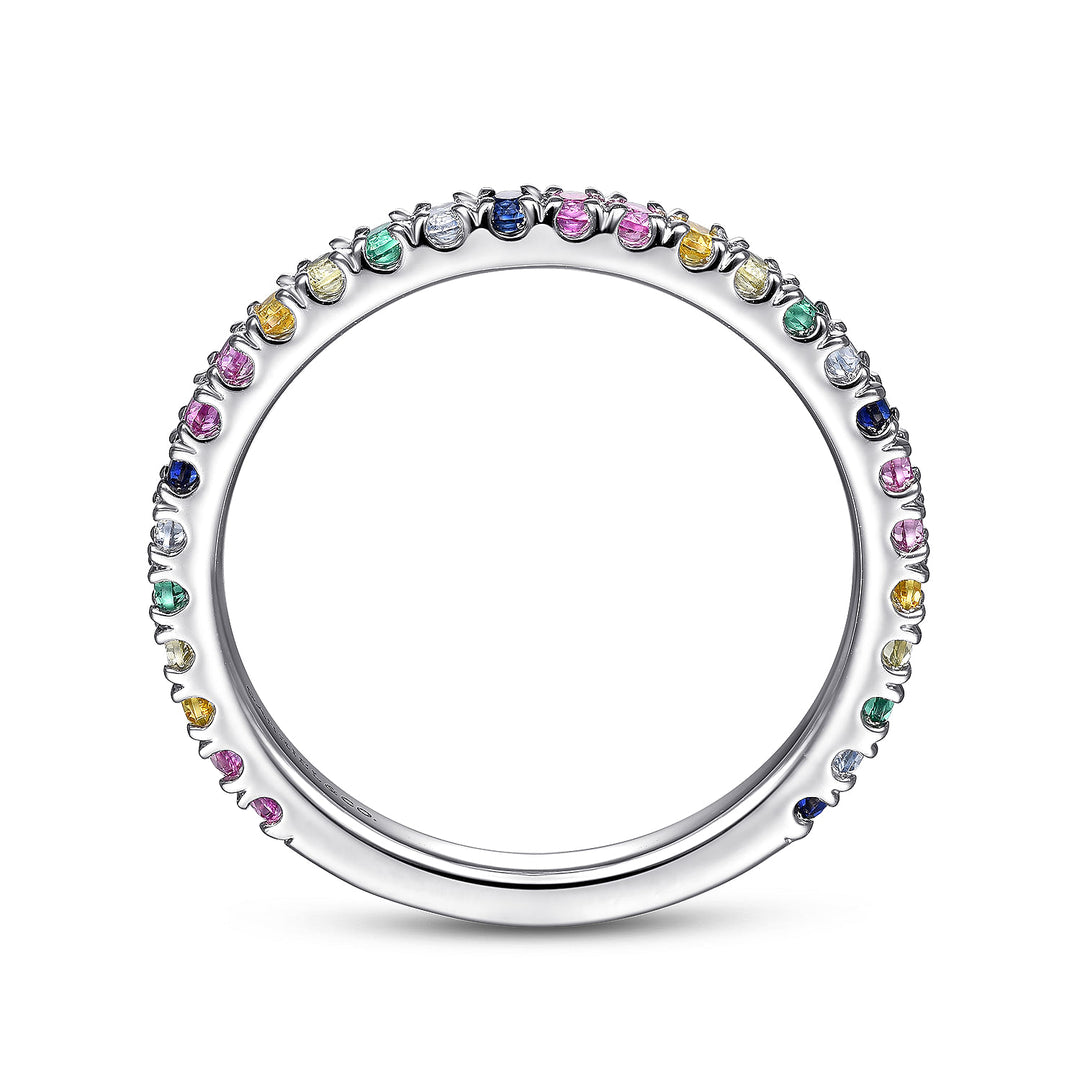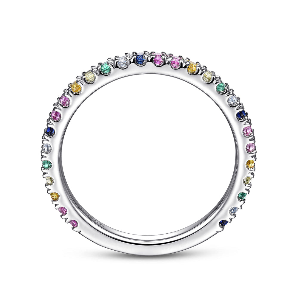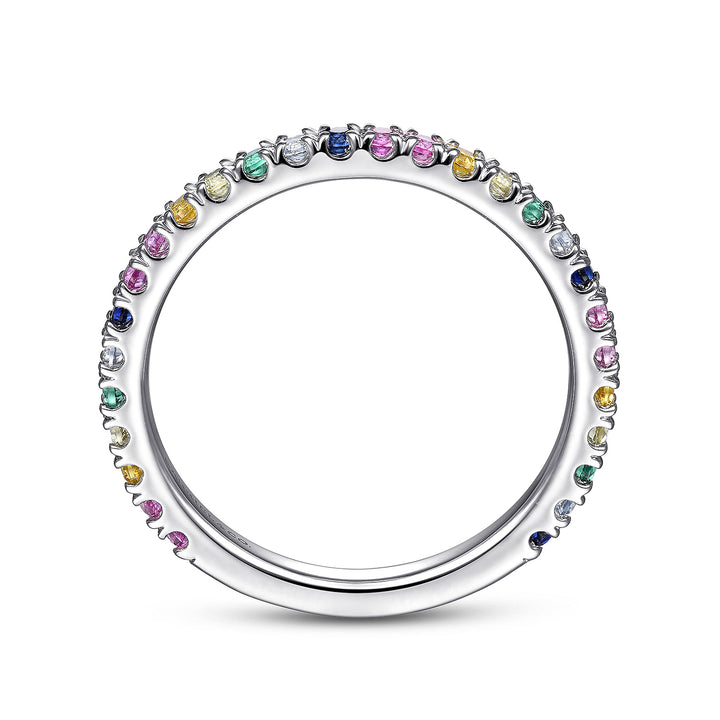 A timeless stackable ring with a sleek straight silhouette and dozens of vivid gemstones. Dainty round sapphire, blue topaz, emerald, peridot, yellow sapphire, ruby and pink tourmaline stones are pav???????? set throughout the band. Crafted from luxe 14K white gold, this multicolored ring effuses any ensemble with a rainbow of can't miss colors.