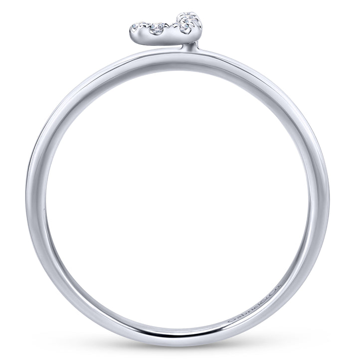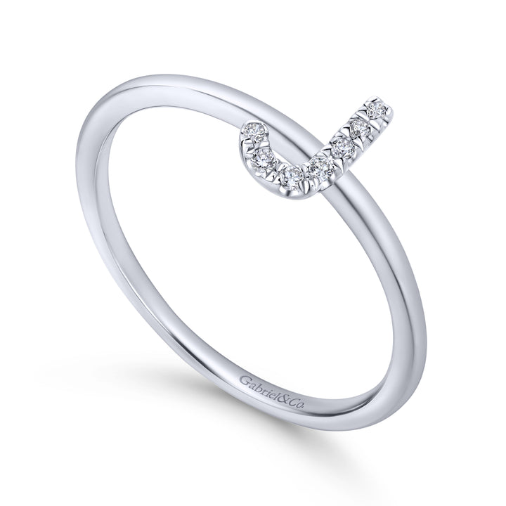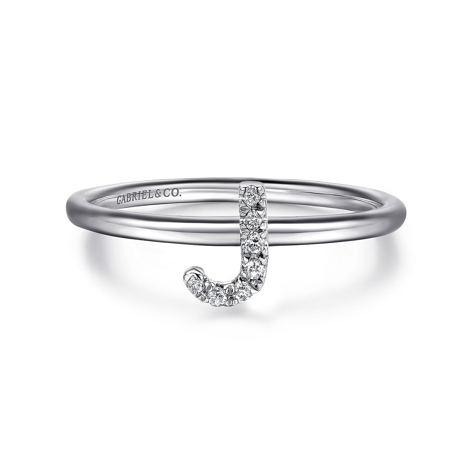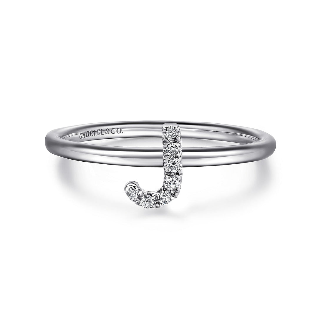 A capital letter "J" in a clean block font adorns this essential initial ring. Brighten up your ring stack thanks to 0.02cts of glistening pav???????? diamonds. A simple band of polished 14K white gold completes this stackable ring.
