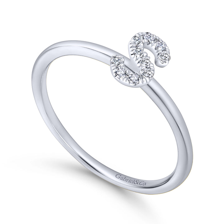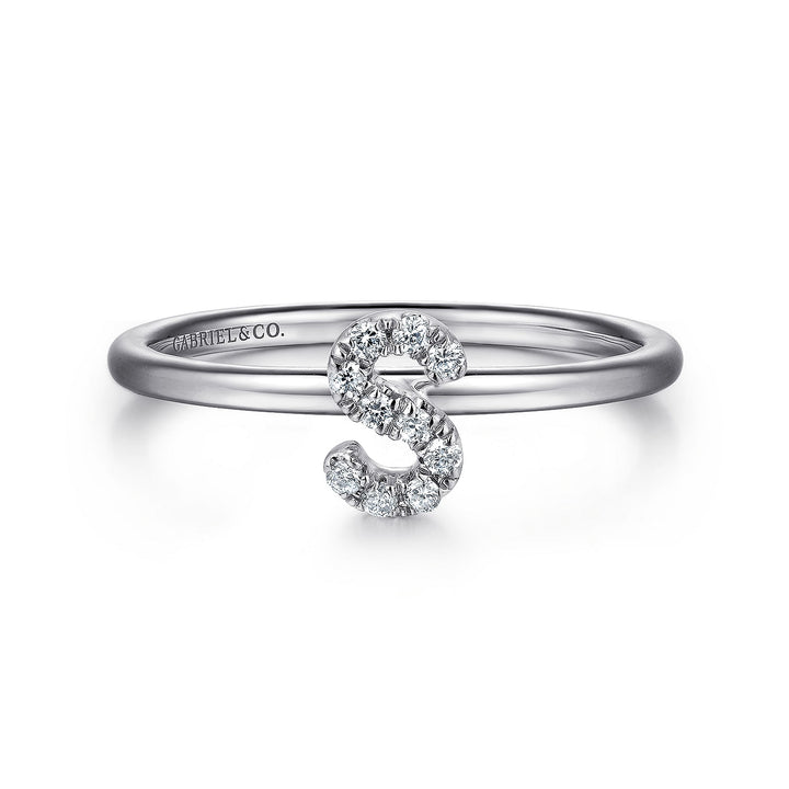 Indulge in a little personalized sparkle thanks to this 0.06ct diamond initial ring. Part of our stackable collection, we love it layered with other rings or worn alone. A simple band of polished 14K white gold is the perfect backdrop for the diamond encrusted "S" initial.