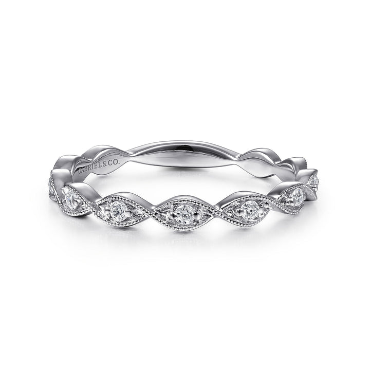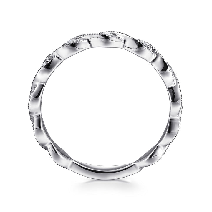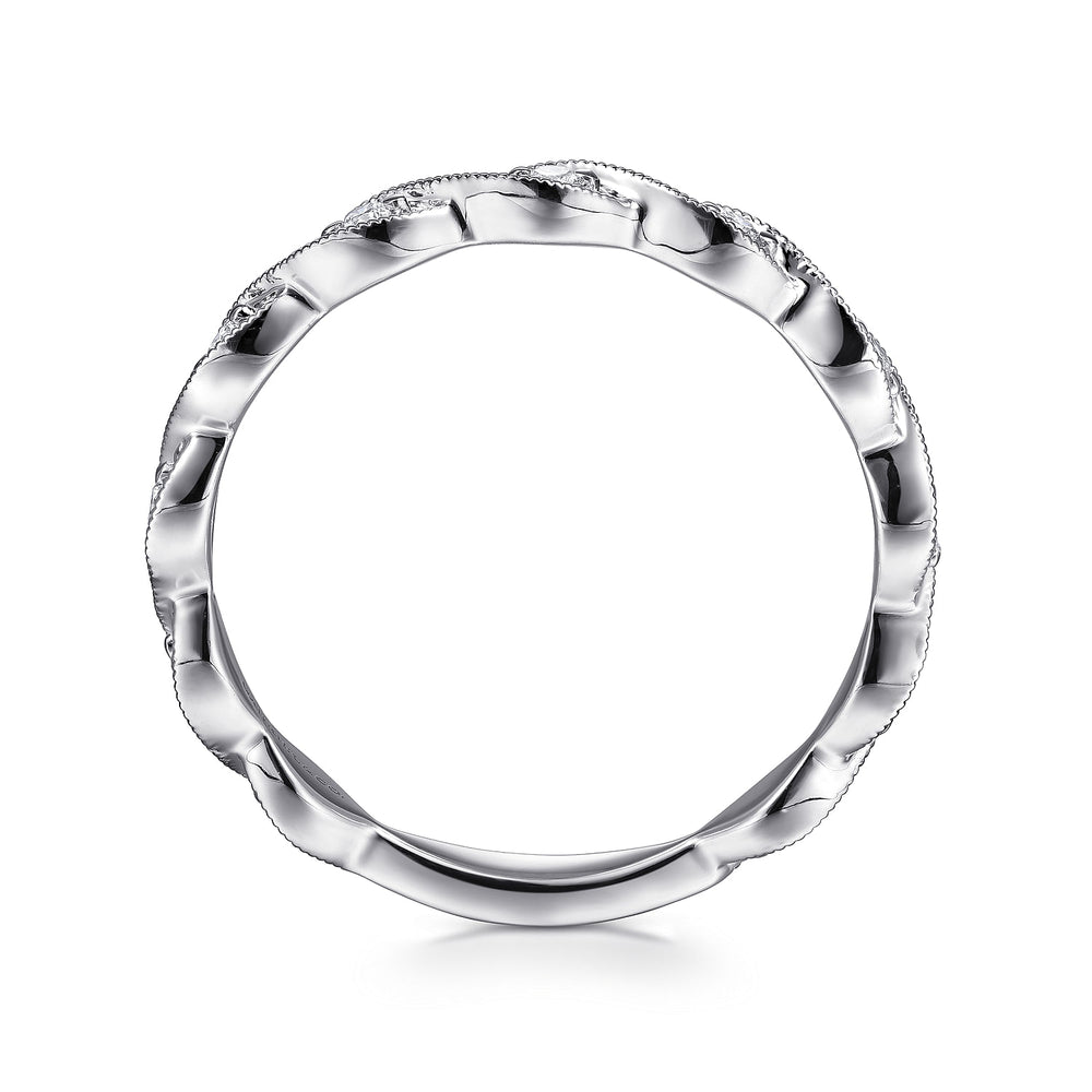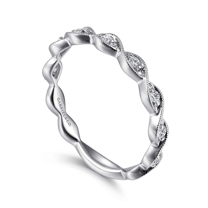 Twisted ribbons of milgrain-detailed 14K white gold form a gracefully scalloped stackable ring. Nestled in between, 0.13cts of dazzling round diamonds will immediately effuse any look with eye-catching shimmer.
