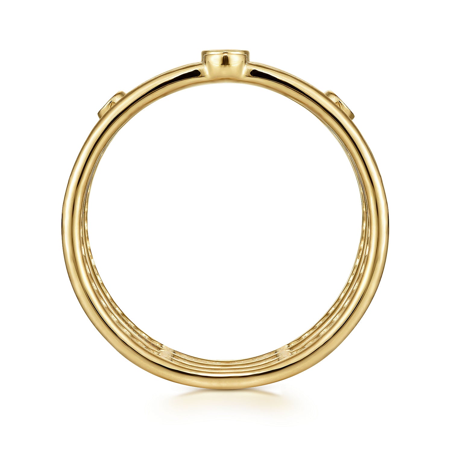 Four rows of 14K yellow gold with alternating smooth and beaded finishes comprise the band of this gleaming Bujukan ring. Bezel set round diamonds are sprinkled throughout the layers, adding a touch of subtle 0.05ct sparkle.