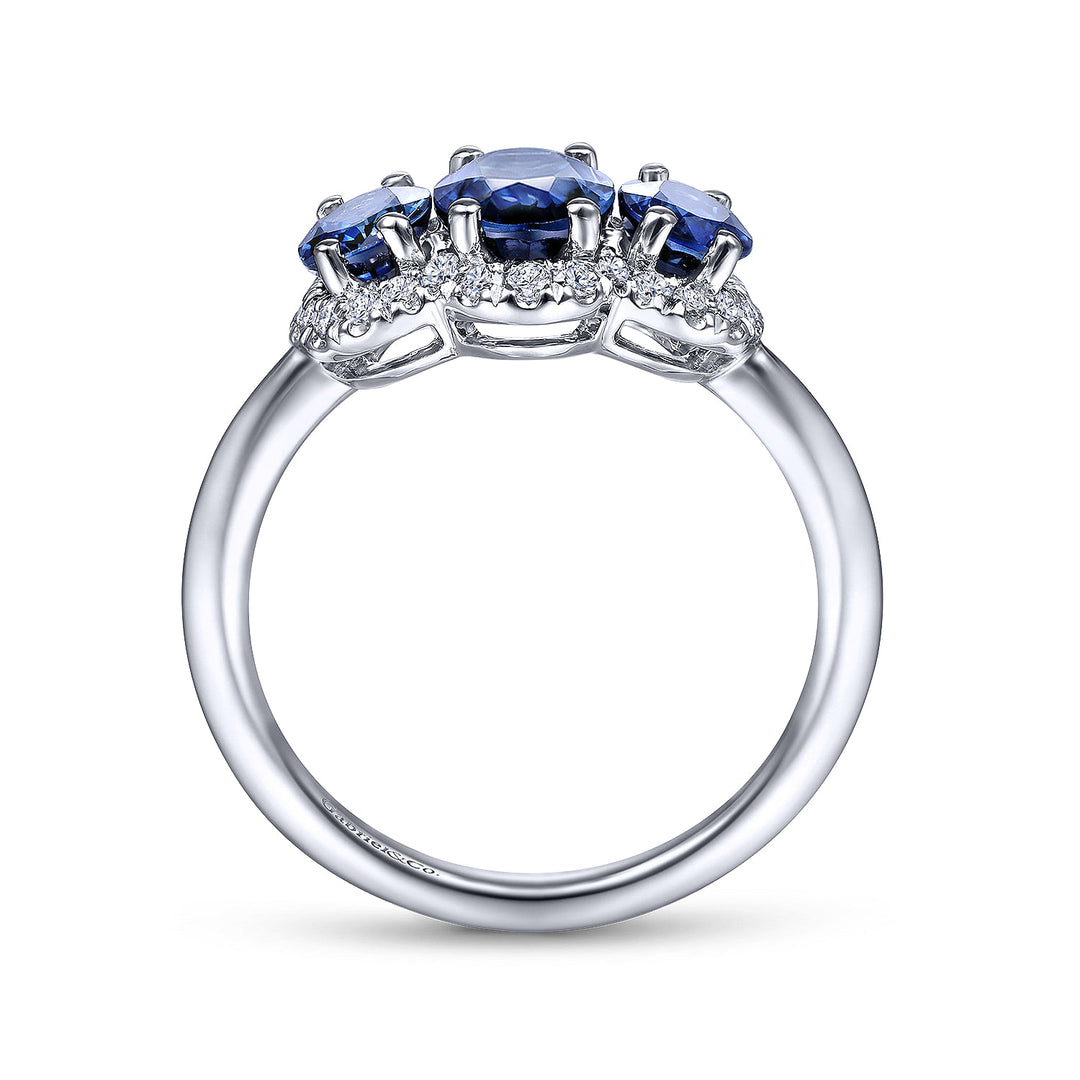 A three stone halo style with vibrant color and impressive sparkle, this fashion ring is an incredibly romantic gift. The central trio of stones are velvety blue oval cut sapphires, which symbolize loyalty and commitment. A halo of 0.20ct pav???????? diamonds surrounds the September birthstones. A slim, polished 14K white gold shank completes this elegant design.