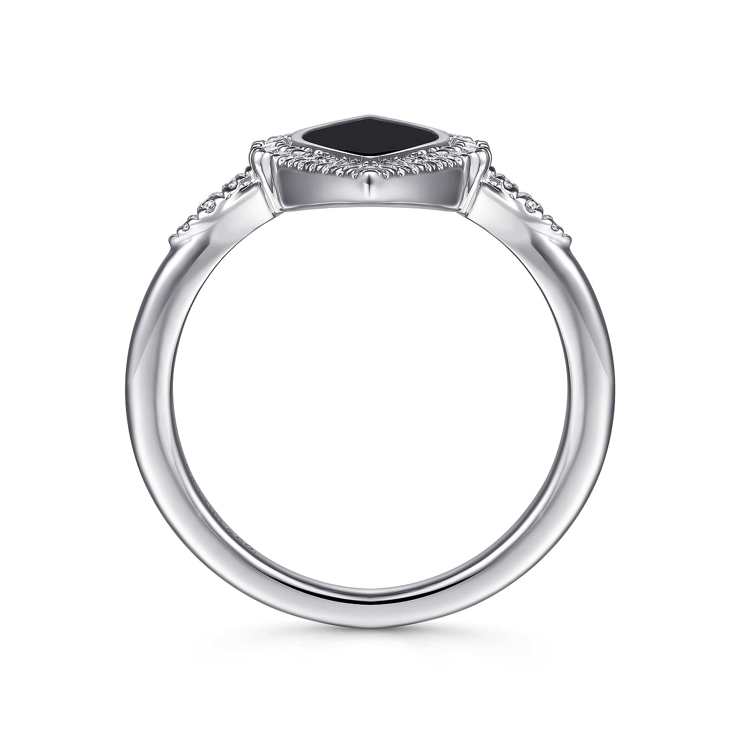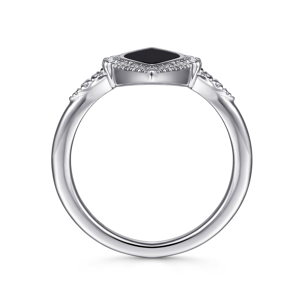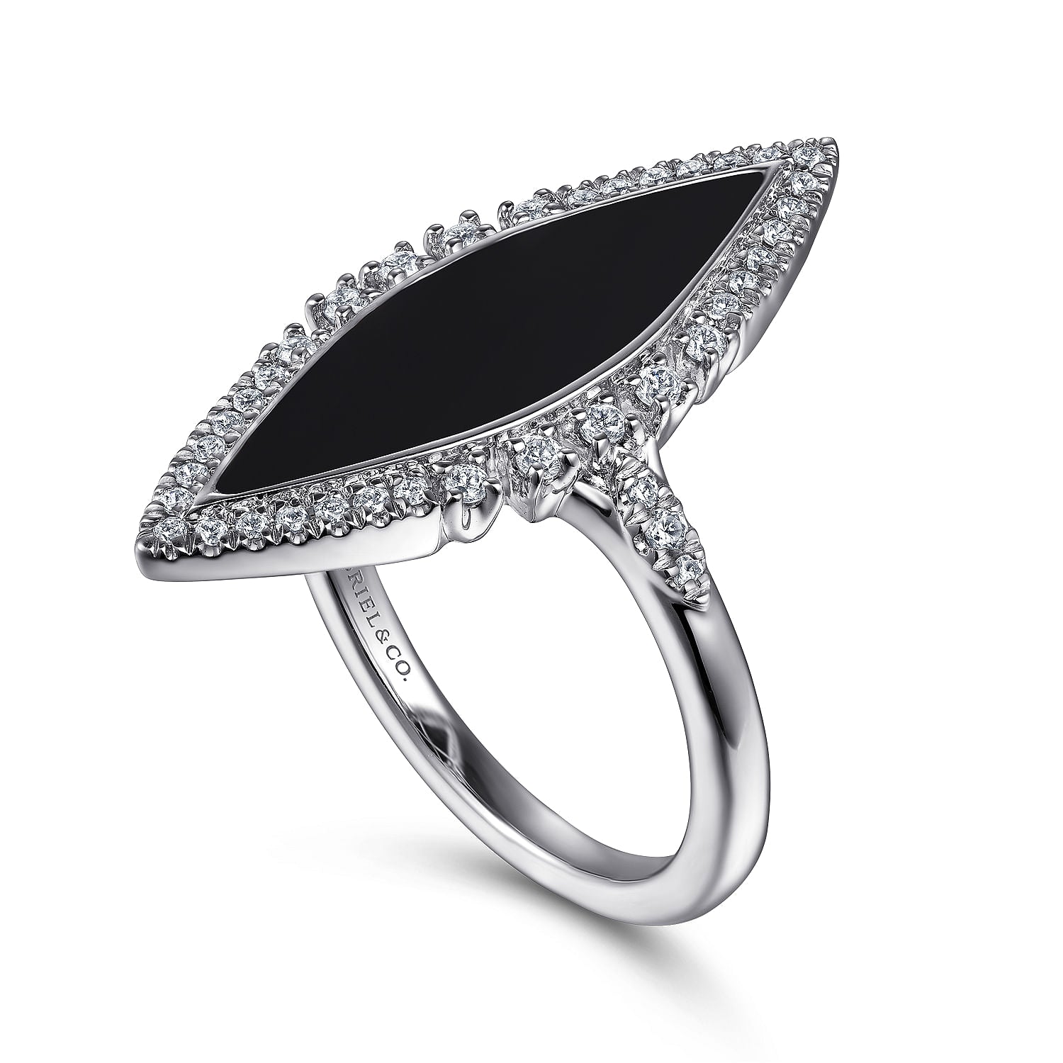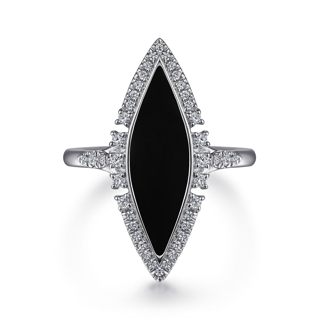 This Art Moderne ring makes a dark, edgy statement thanks to a marquise cut onyx center stone. The inky black gem is surrounded by 0.21cts of radiant accent diamonds. Set on a slim 14K white gold shank, this fashion ring makes for a bold and distinctive accent piece.