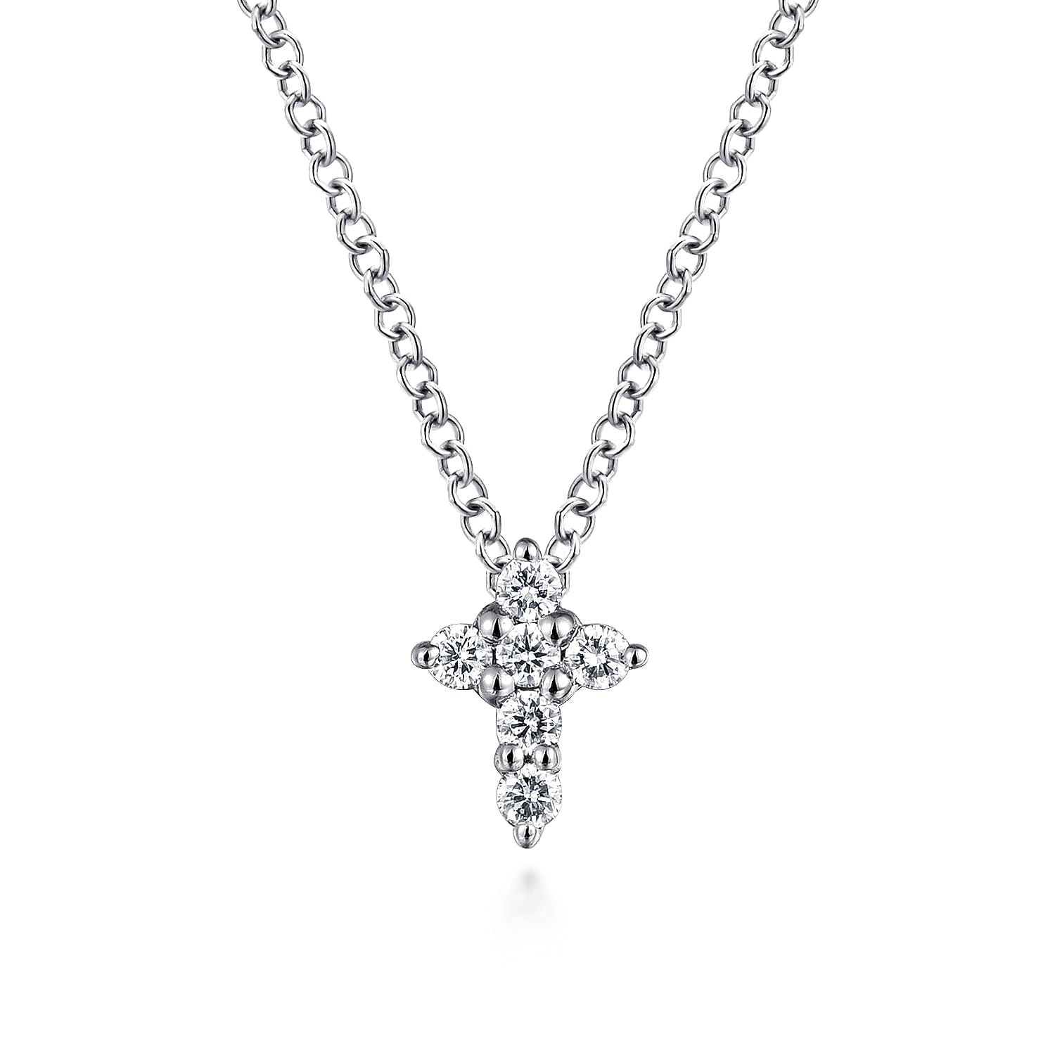Modest, yet luxurious this 14K white gold cross pendant showcases prong-set .10 ct round-cut diamonds. This petite pendant style necklace is subtle, but offers details to be admired.