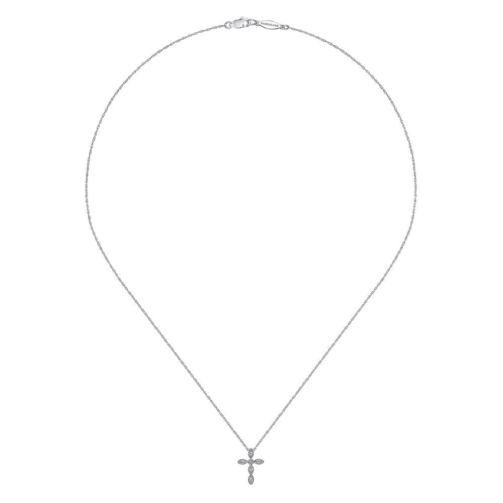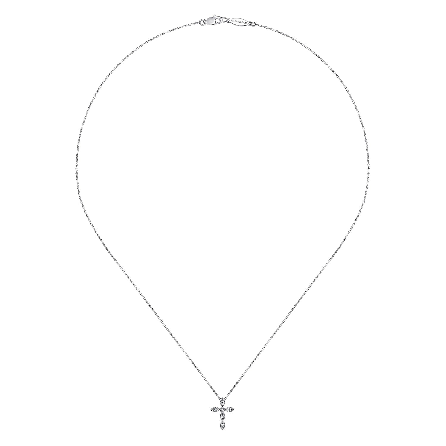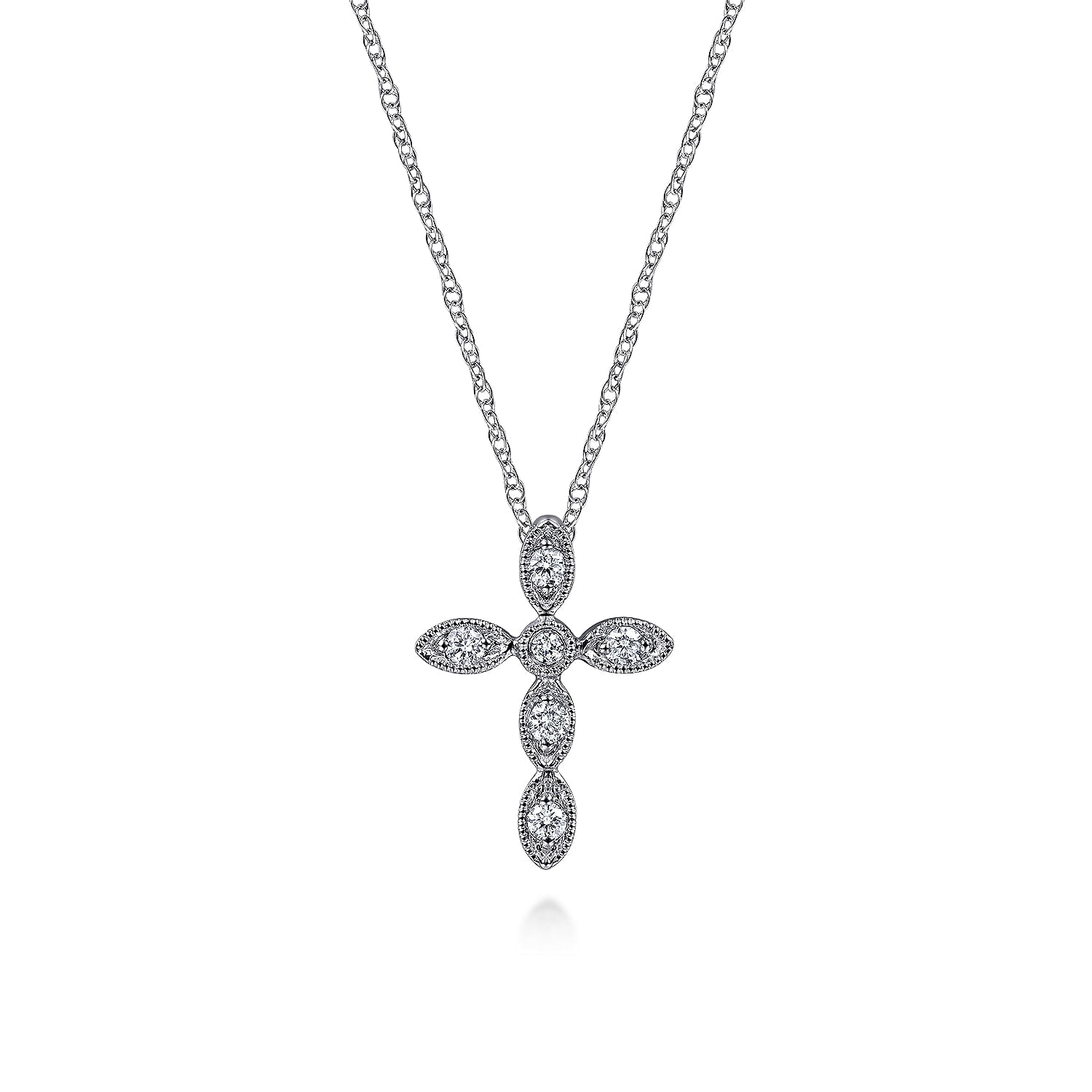 A gentle statement, this 14K white gold cross necklace showcases delicate luxury with six round-cut diamonds nestled within its foundation. Formulating this cross pendant necklace are marquise shapes with milgrain detailing beholding the .08 cts diamond decorations.