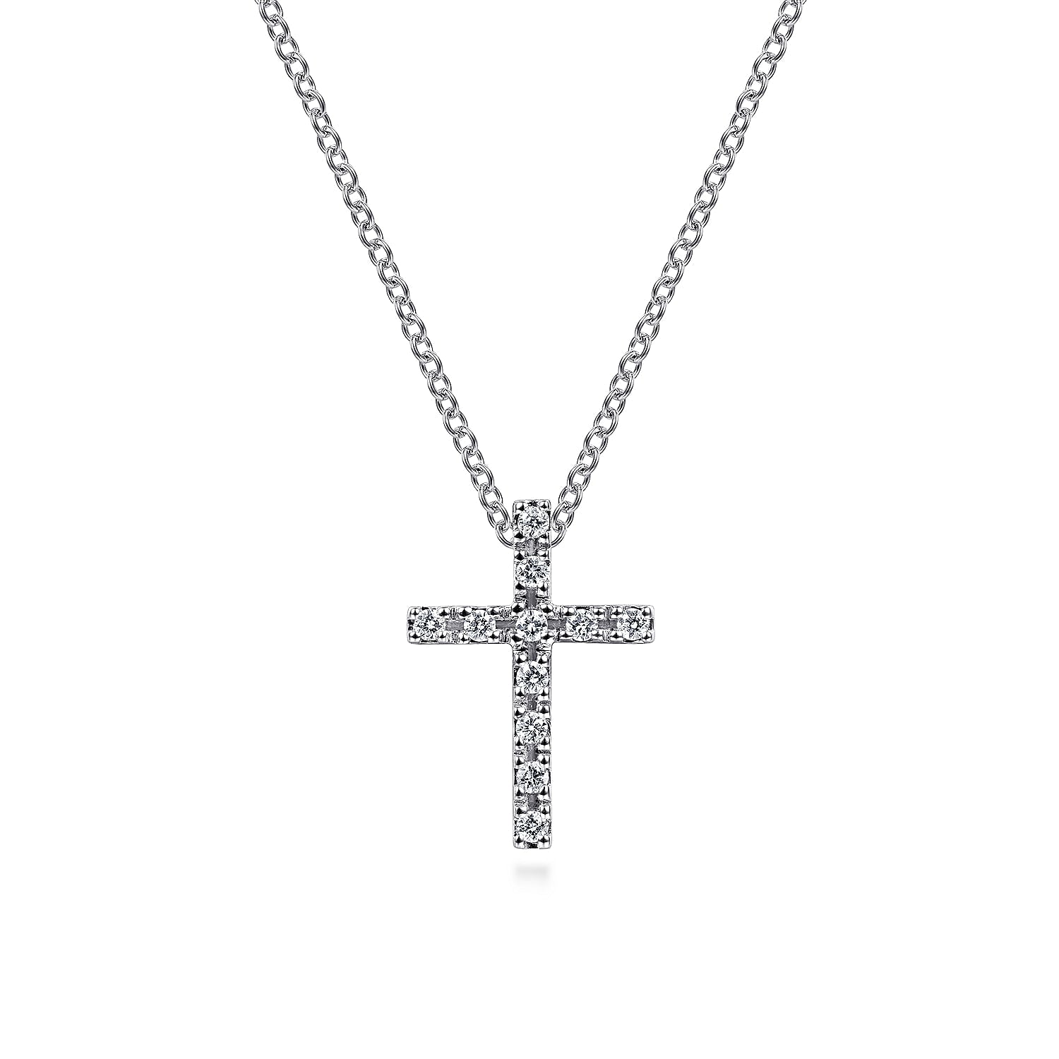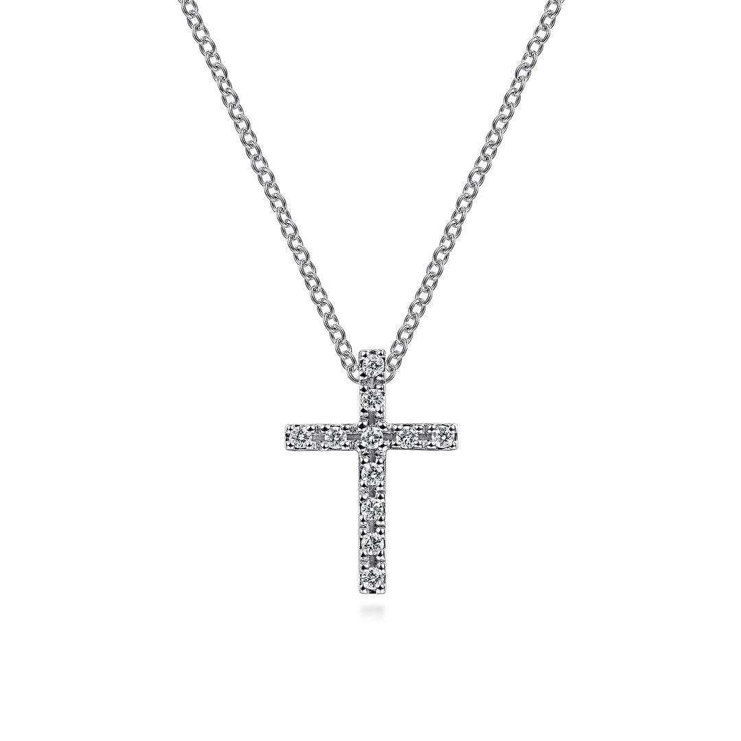 A beautiful and sentimental statement, this 14K white gold pendant necklace showcases polished tones. Adding a bit of luxurious flair are .10 ct round-cut diamonds decorate along the foundation of the cross. Combining striking white gold tones and sparkling diamond make this pendant a brilliant spectacle.