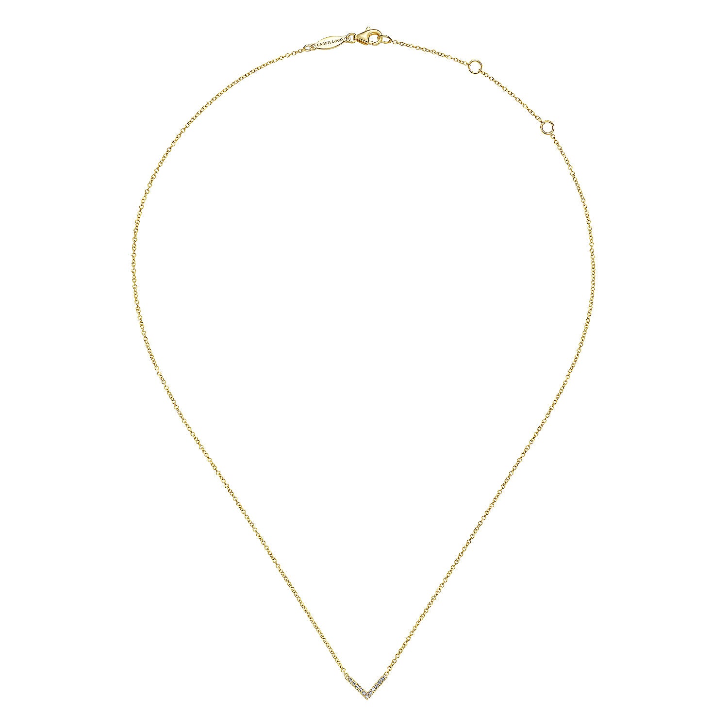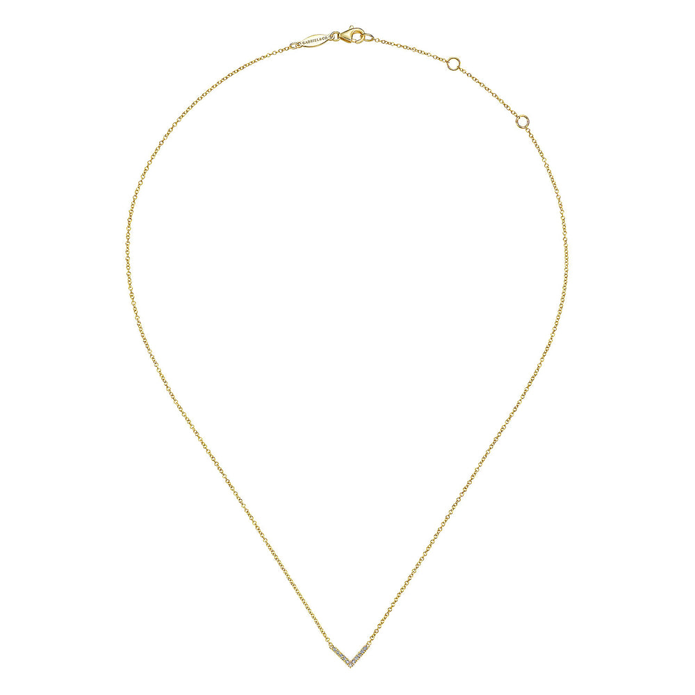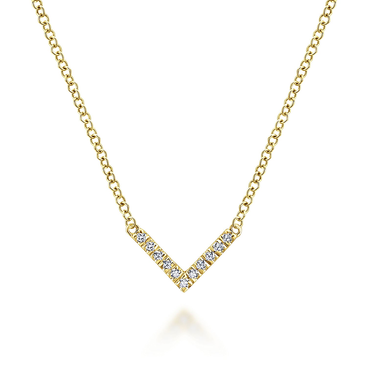 A petite statement necklace is all you ever need. This 14K yellow gold bar style features an appreciation for angles and diamonds. The bar is shaped into a V shape and is adorned with .05 ct diamonds making it a chic and subtle jewelry piece.
