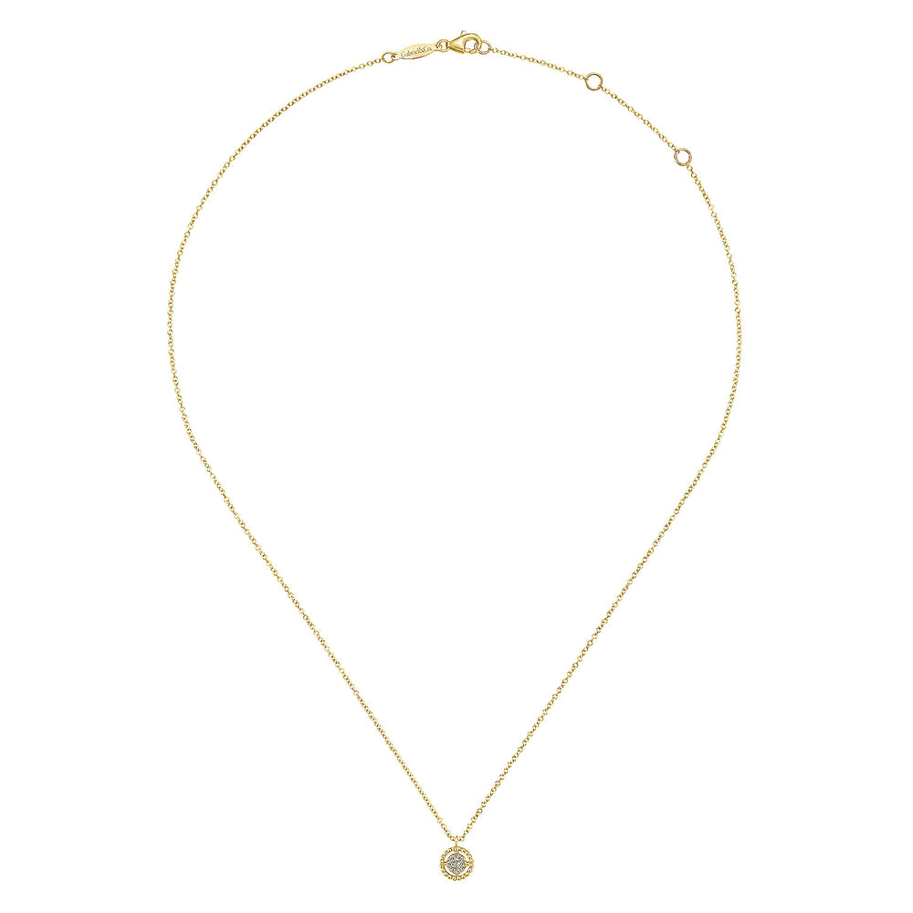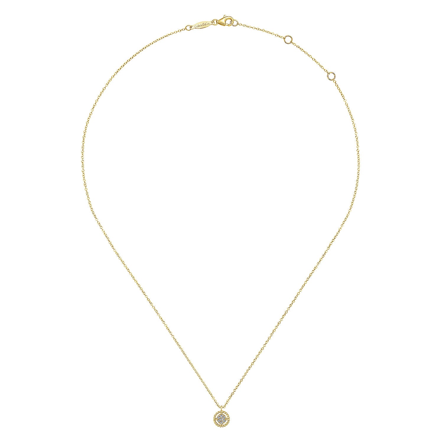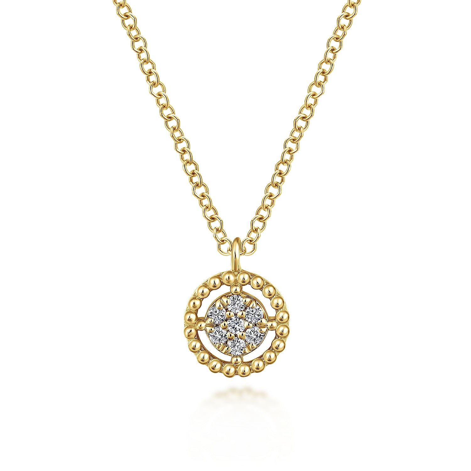 A cluster of .05ct round pav???????? diamonds sparkles at the heart of this delicate everyday necklace. A lustrous circle of beaded 14k yellow gold appears to float around the glittering diamonds. You'll never want to take this delicate fashion necklace off.