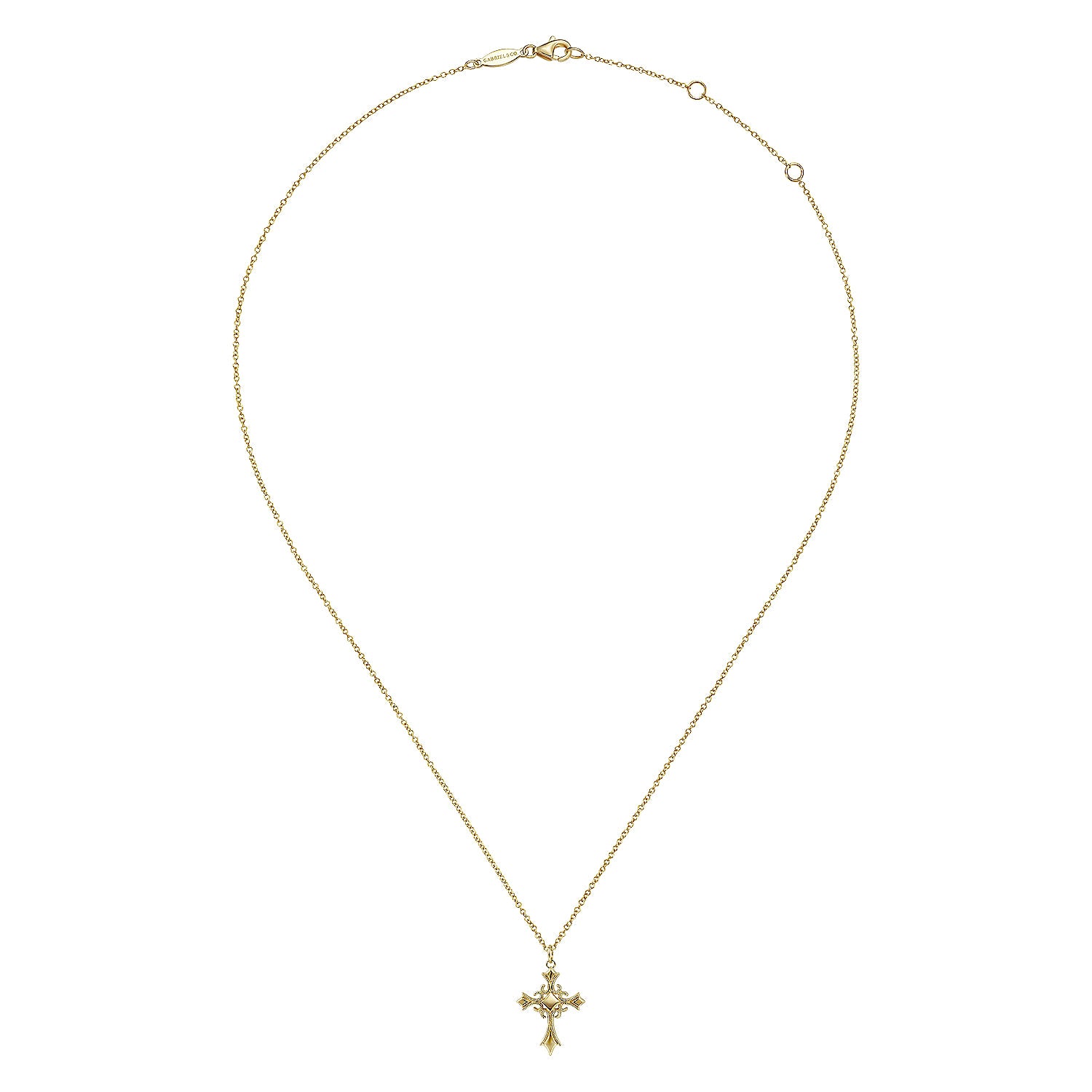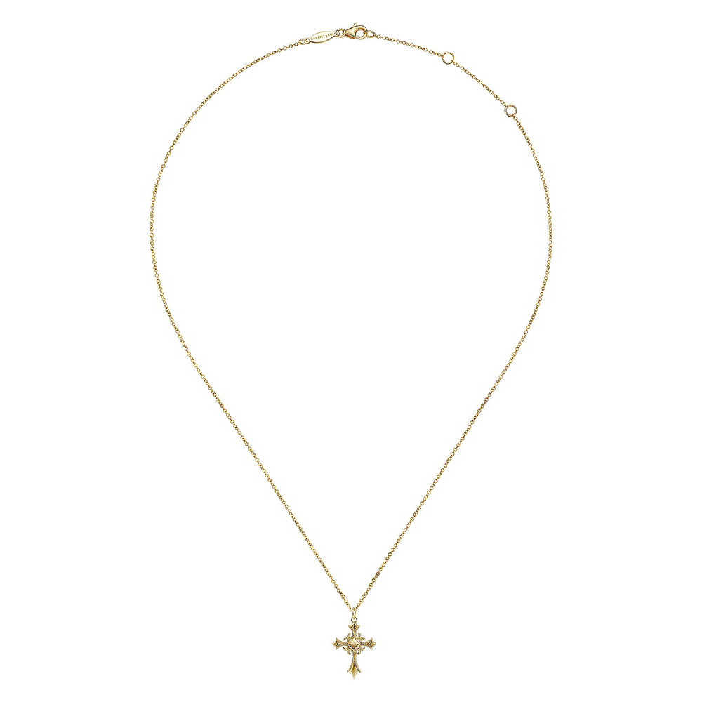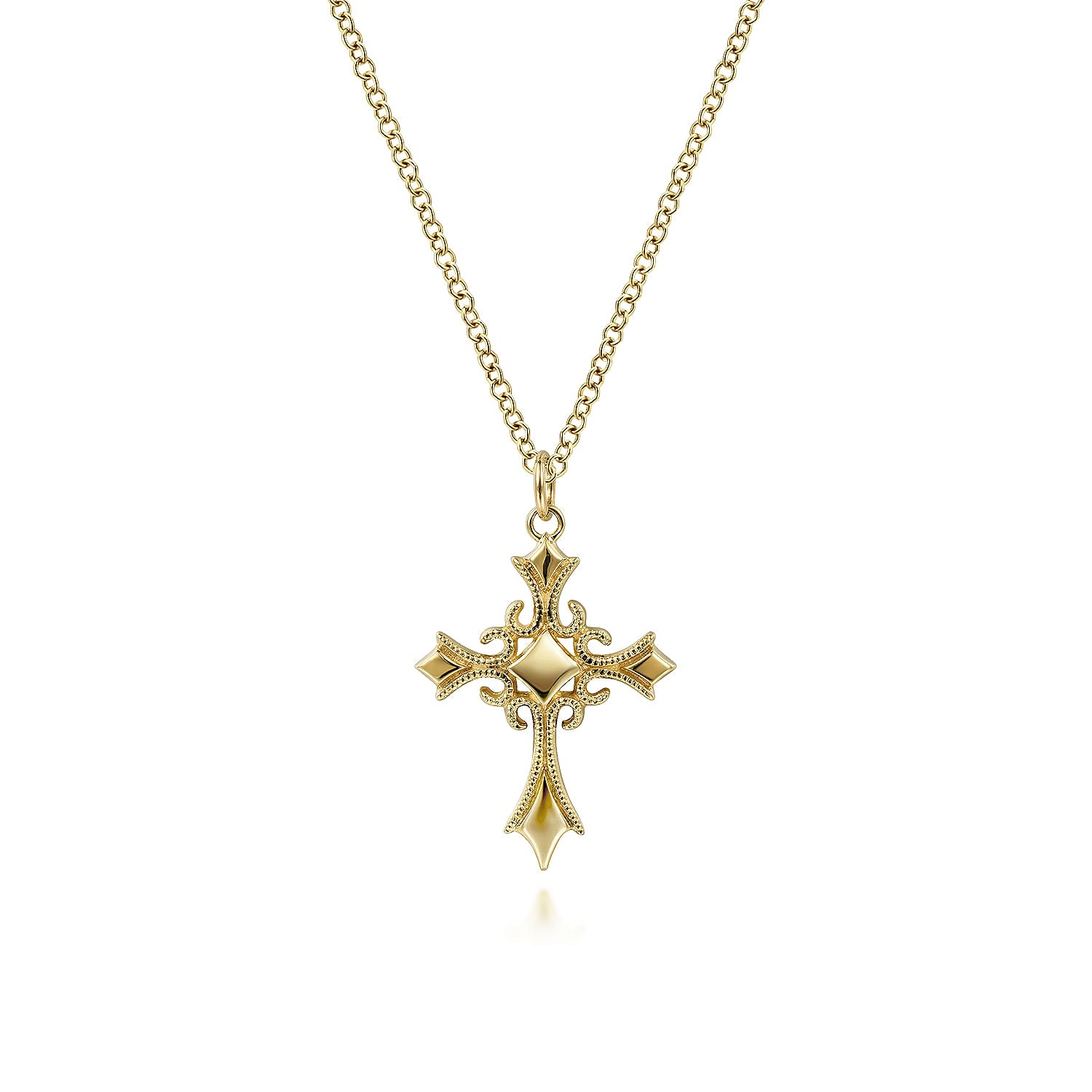 A petite style, this cross pendant features intricate craftsmanship on a delicate cross shape. With a composition of 14K yellow gold, elegant milgrain details decorate the cross at each of its four points. More exquisite designing encompass the cross at its center giving this pendant a refined and vintage-inspired touch.