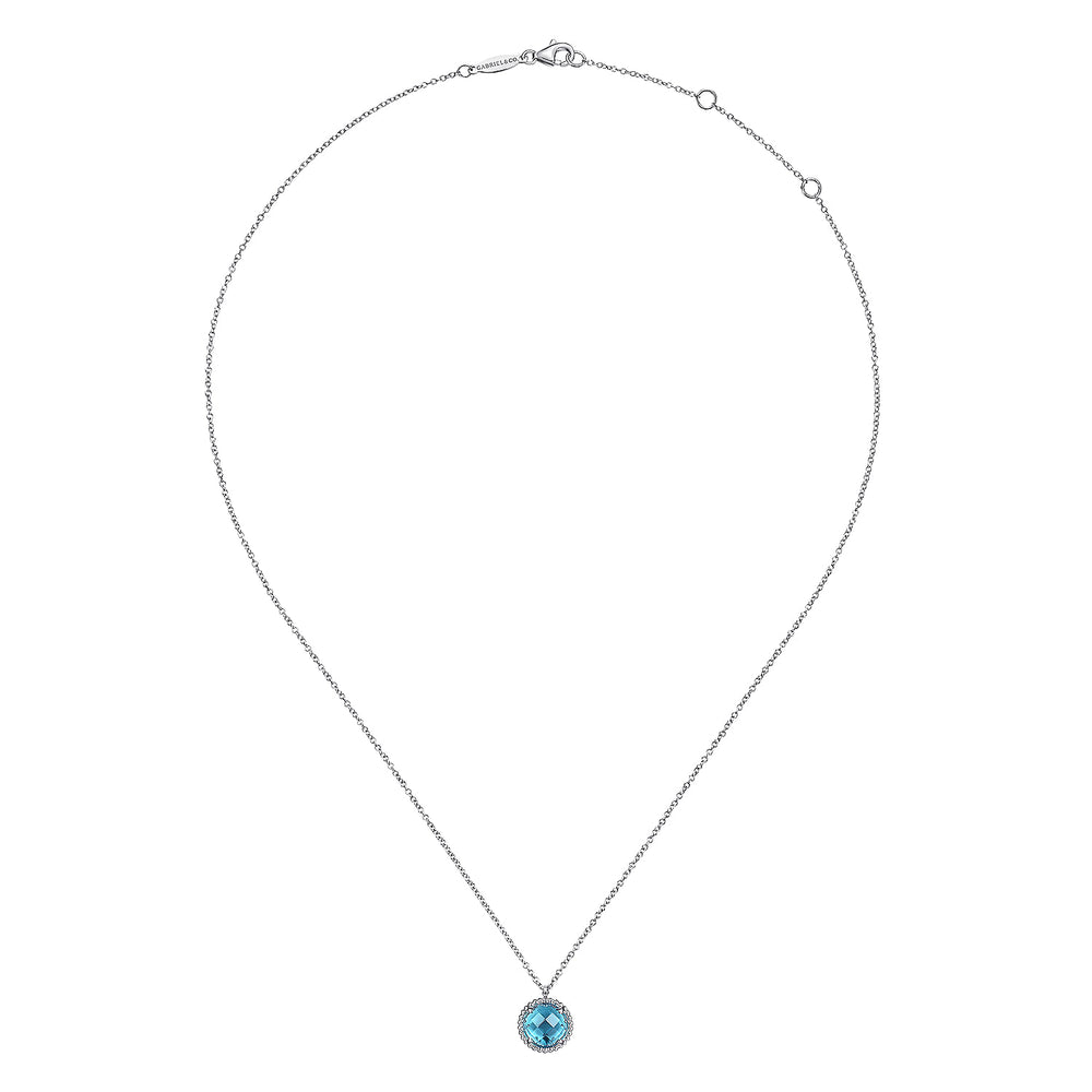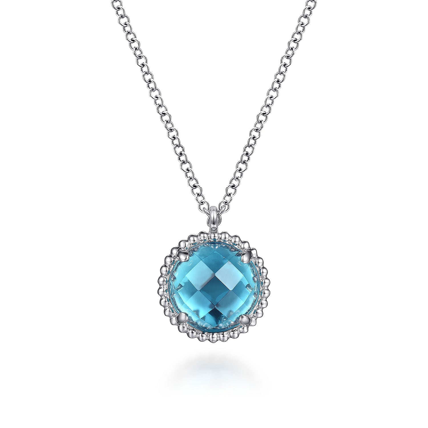 December birthstone swiss blue topaz is the shining centerpiece of this elegantly simple necklace. The faceted round gemstone is set in 925 sterling silver with a frame of sophisticated spheres. A slim, adjustable chain completes this perfectly minimal design.