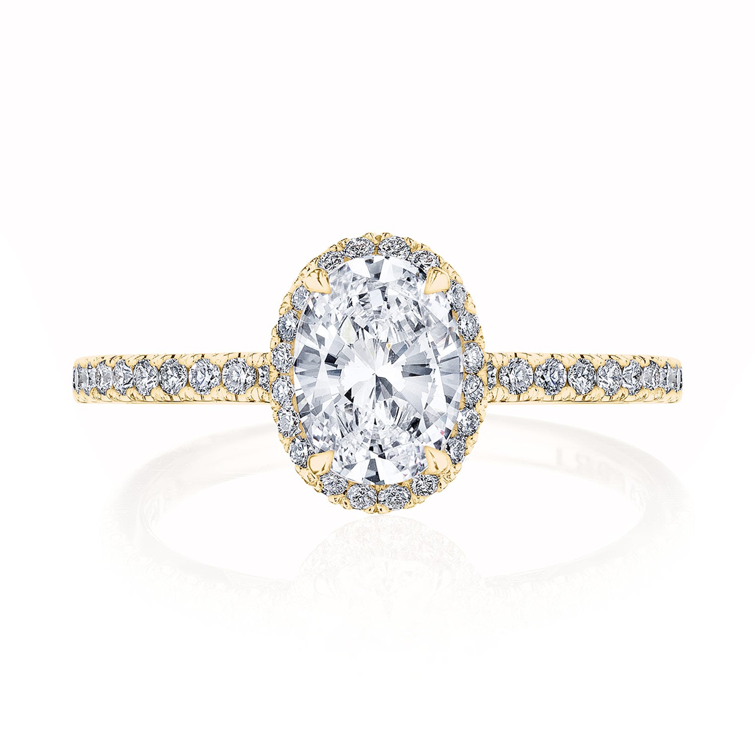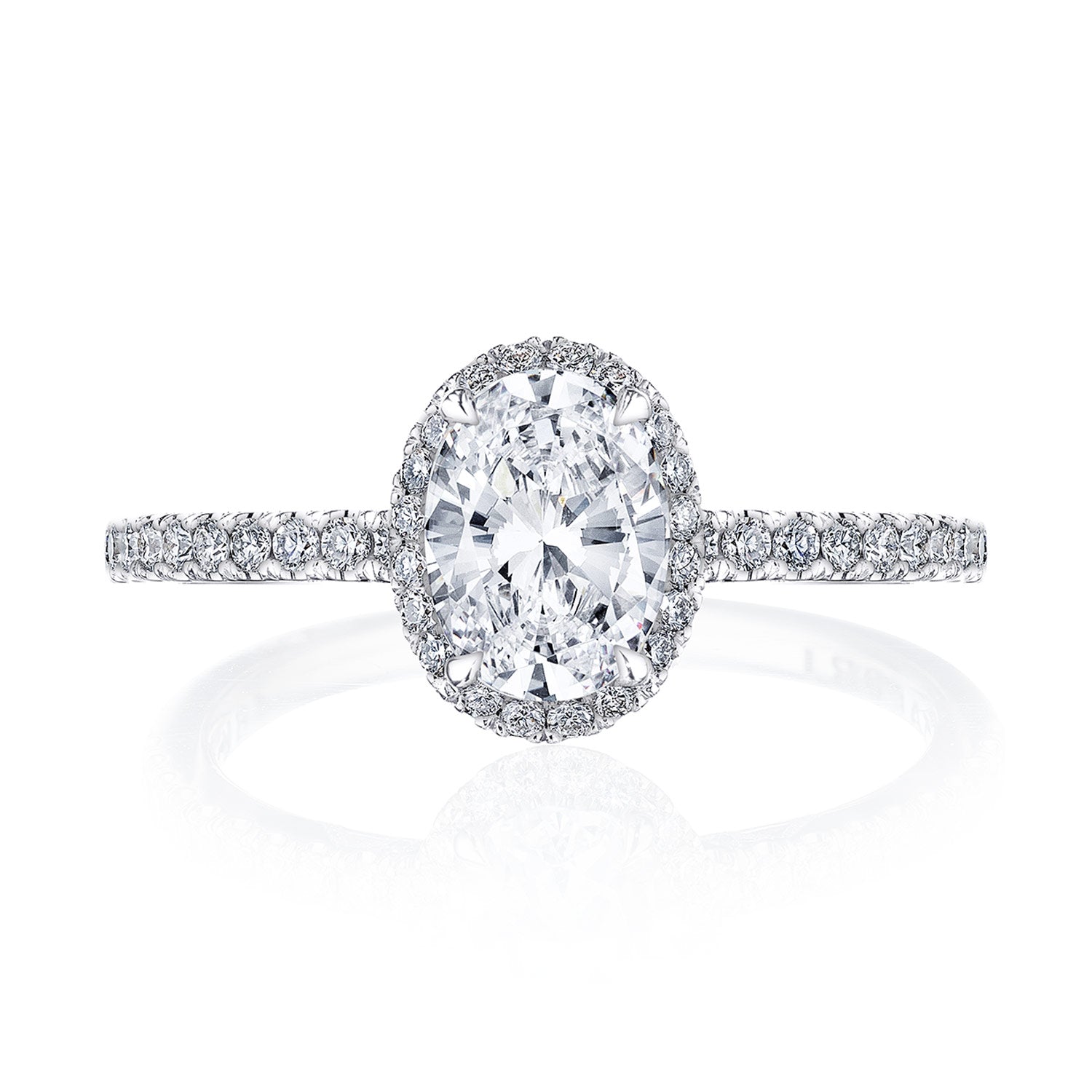 | Additional Description | Contemporary and diamond-intense, with Simply TACORI Crescent Fabric and pavé-set diamonds adorning the ceiling. A bloom around the elegant oval solitare delivers brilliant detail. A signature Crescent marks the ring as Truly TACORI. |