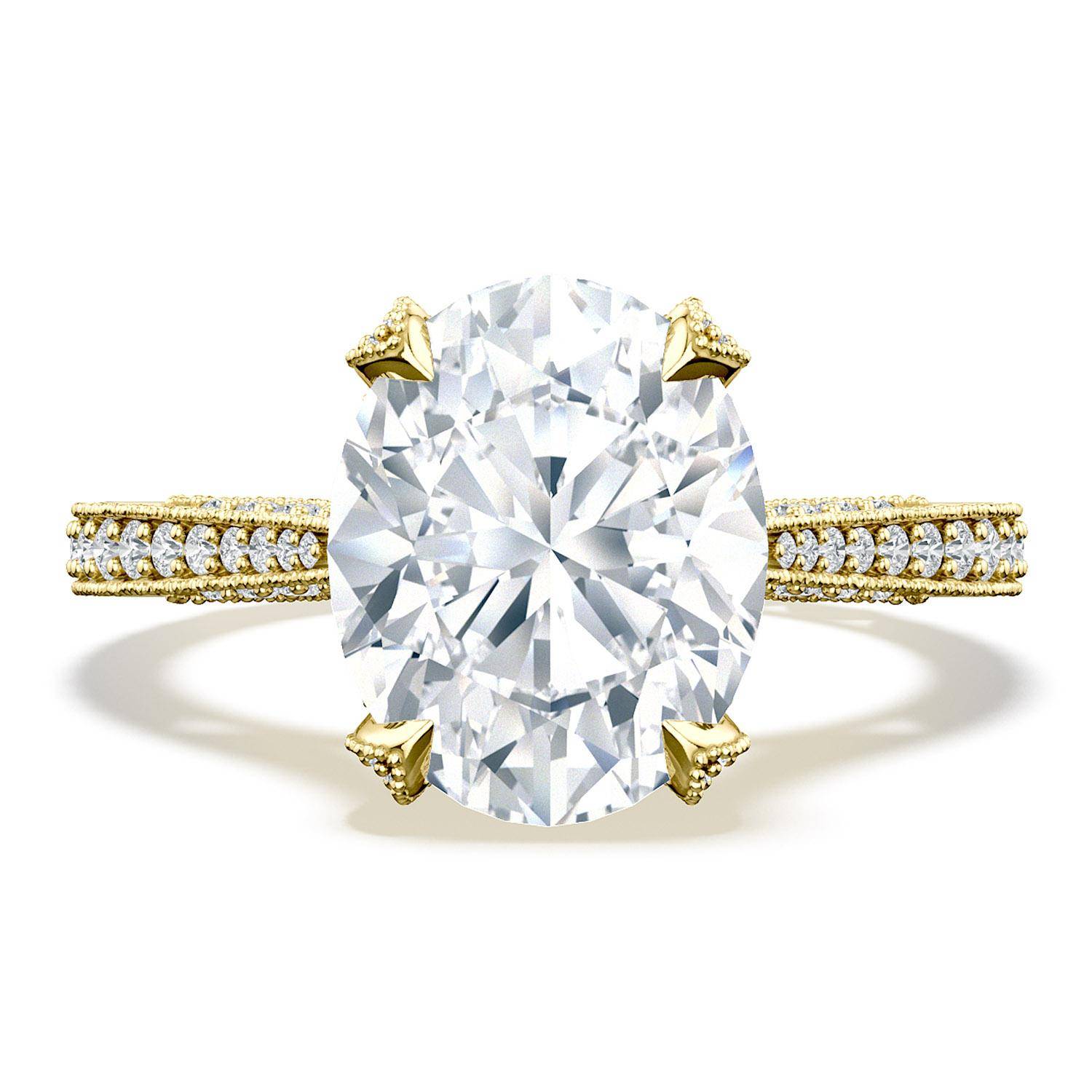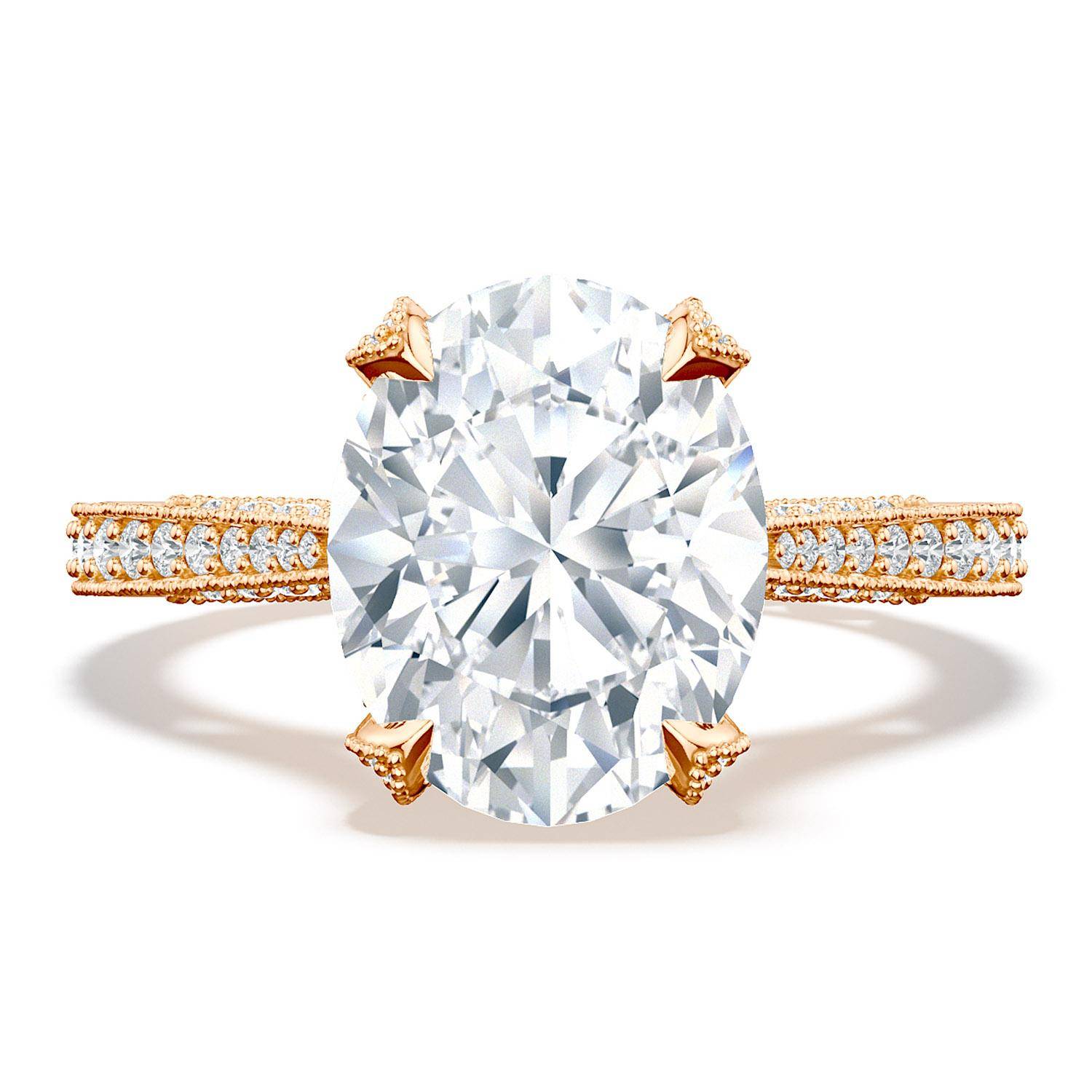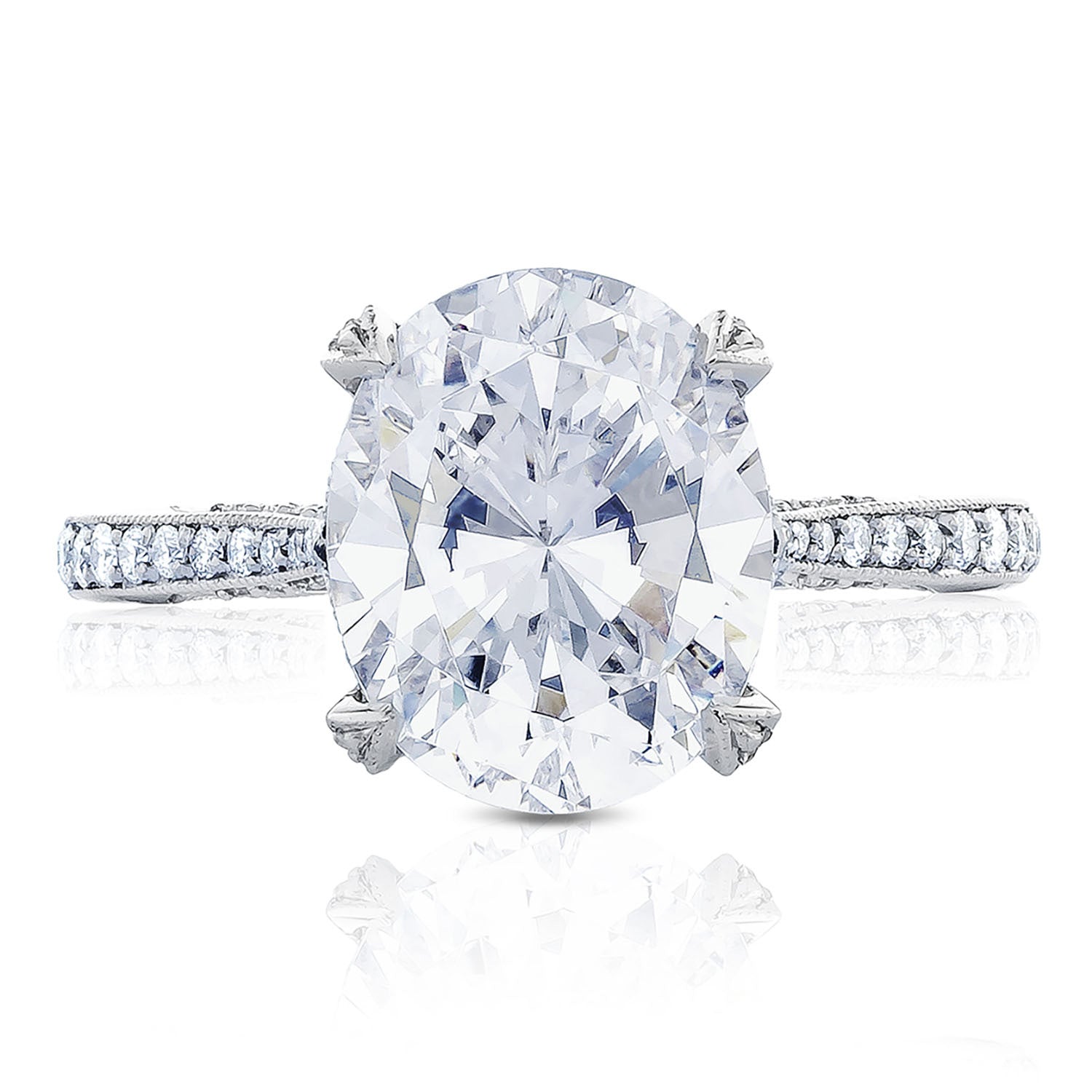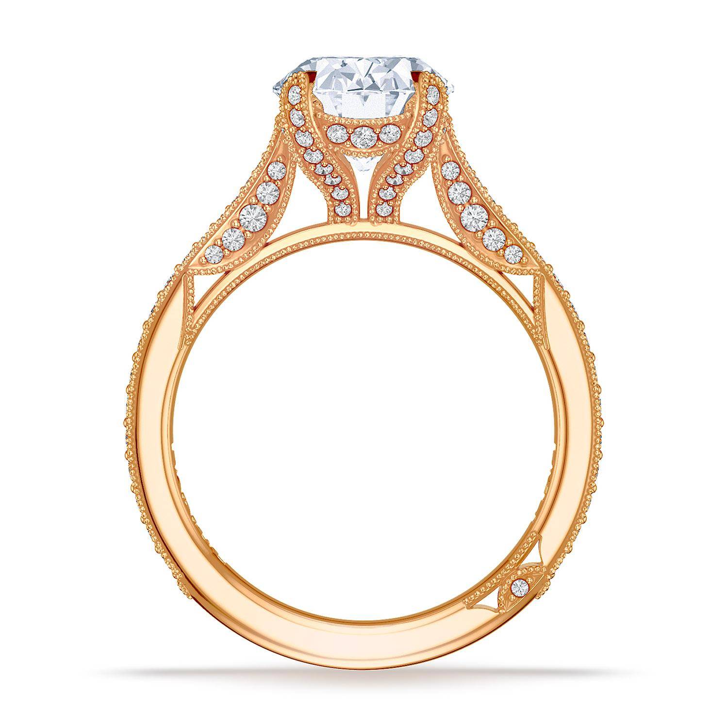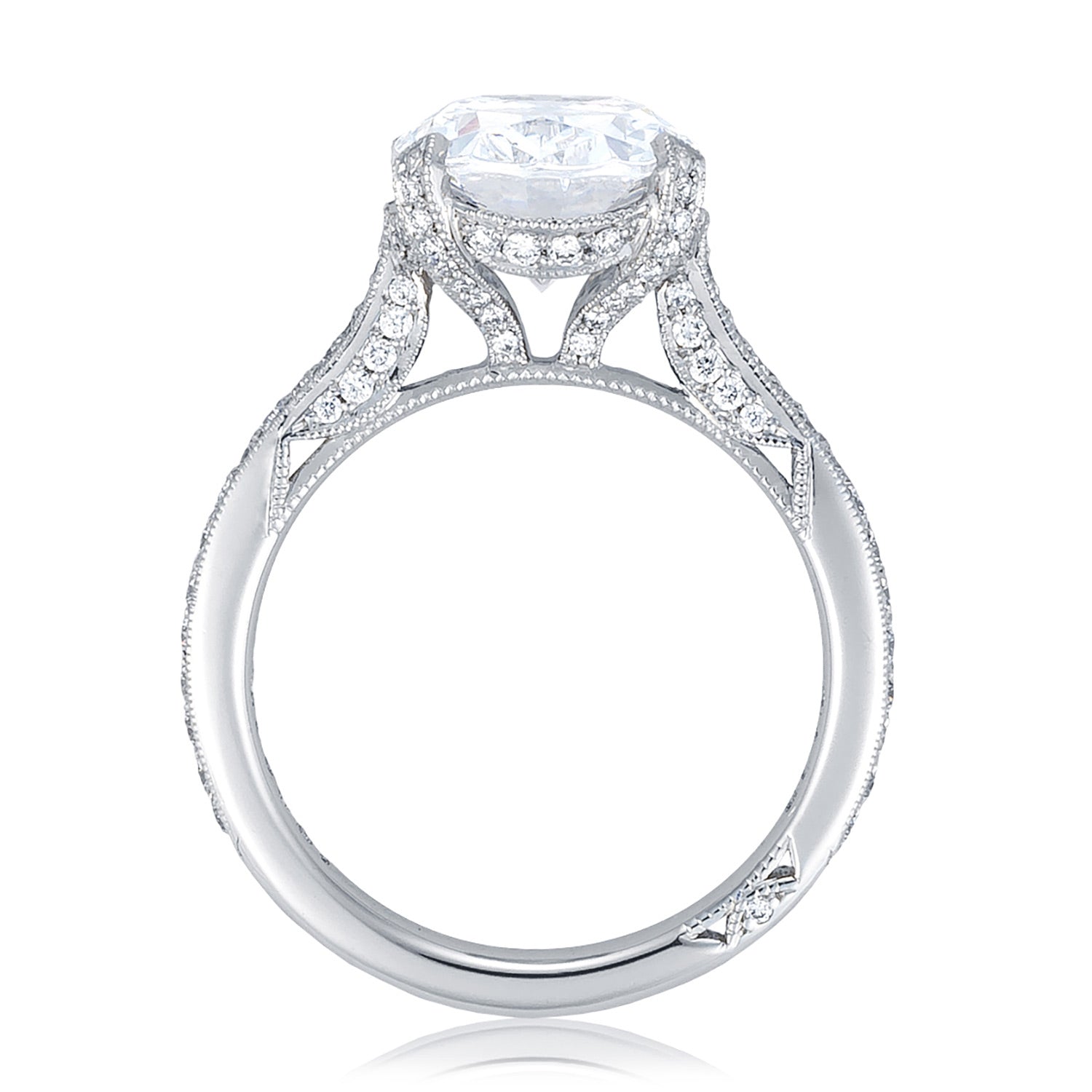 | Additional Description | The solitaire rests on the diamond-studded prongs of a Cathedral foundation with a hidden bloom just beneath the crown. Diamond and milgrain studded Simply Tacori crescent fabric decorates the innerface, while pavé adds brilliance to the ceiling. |
